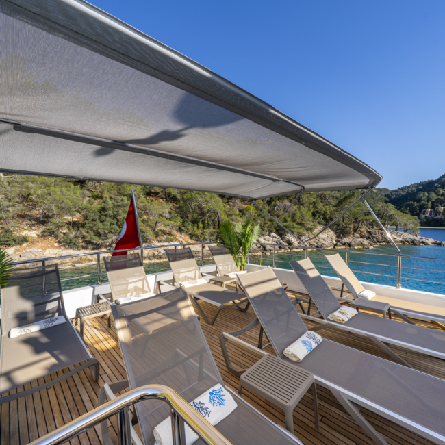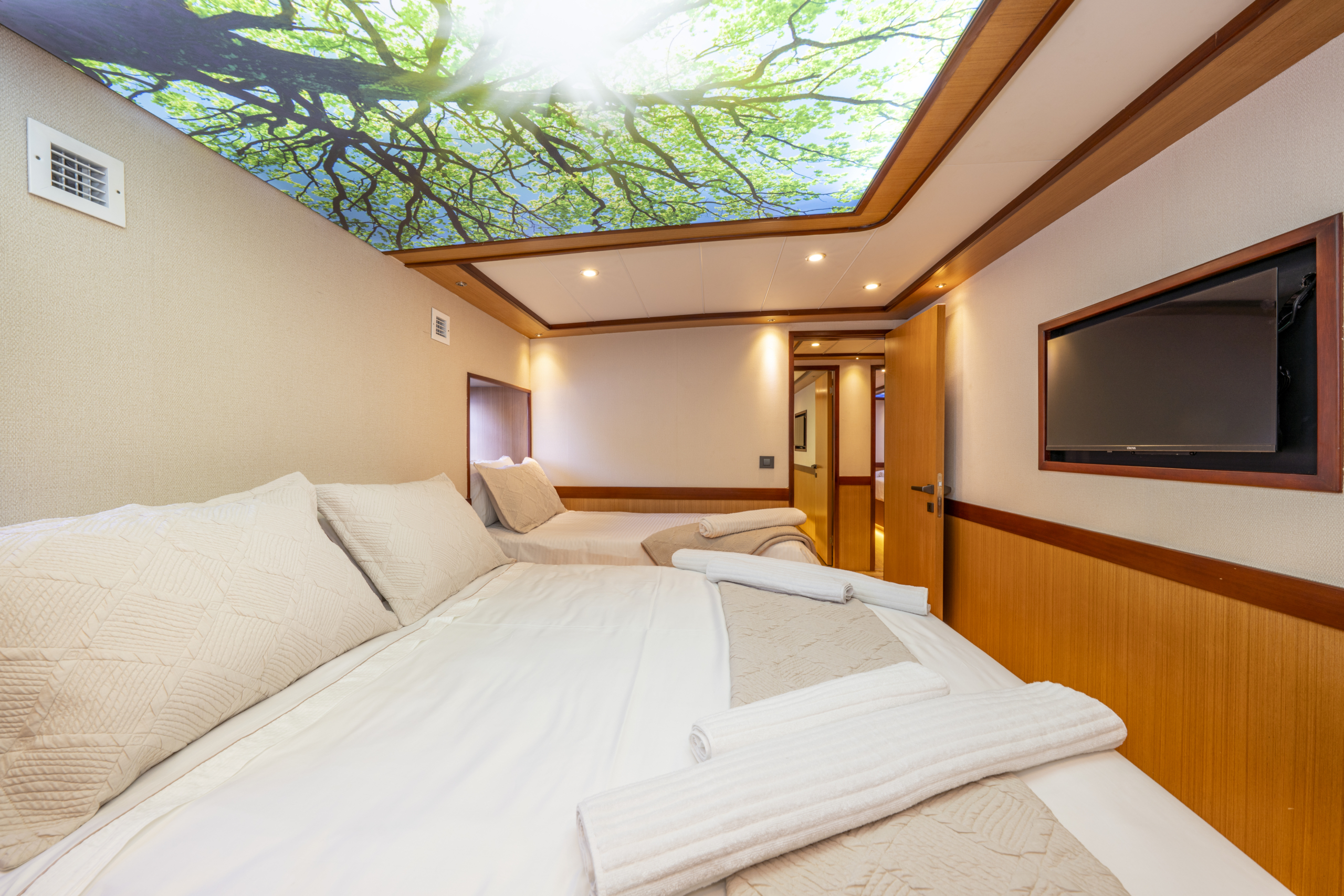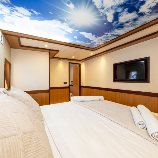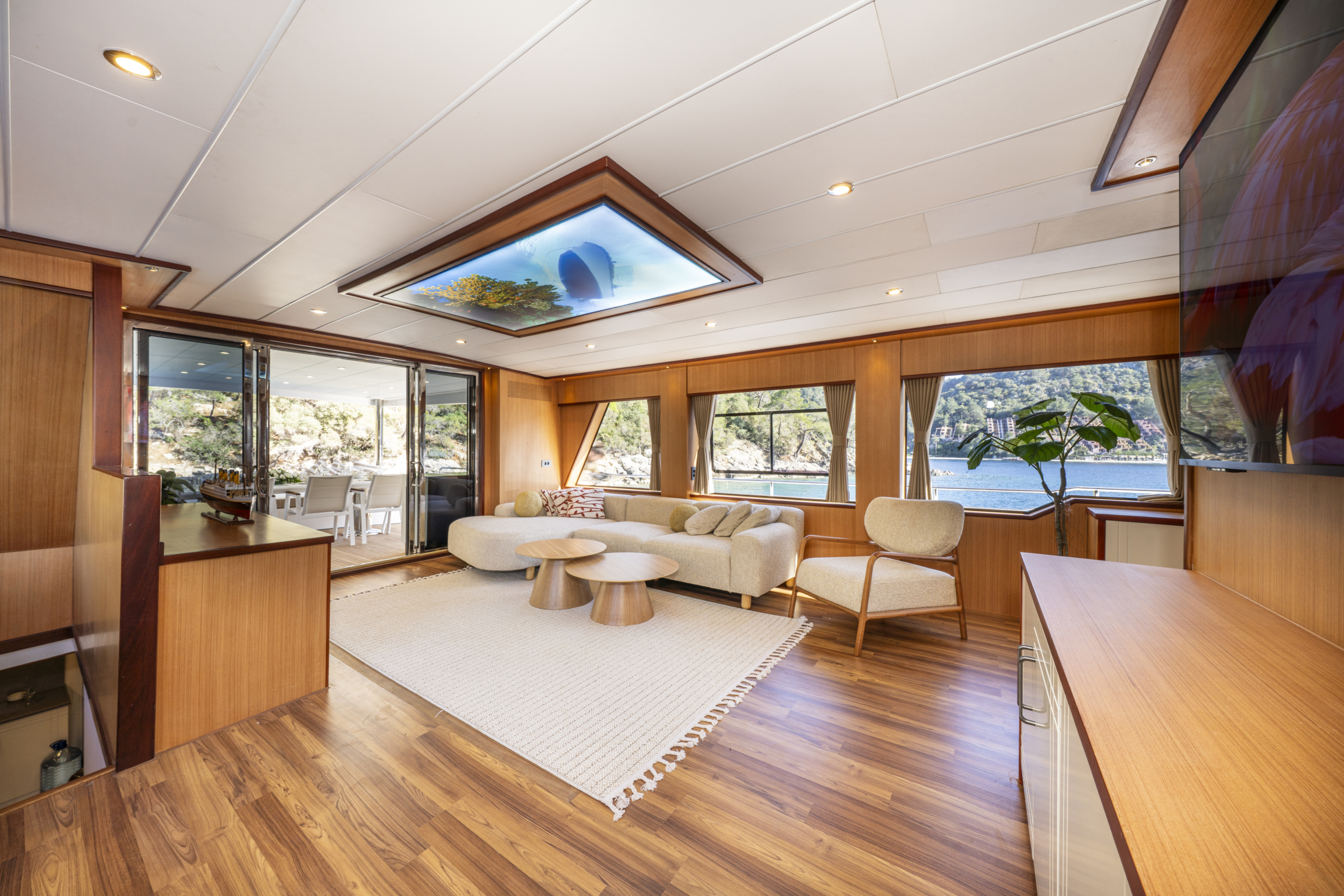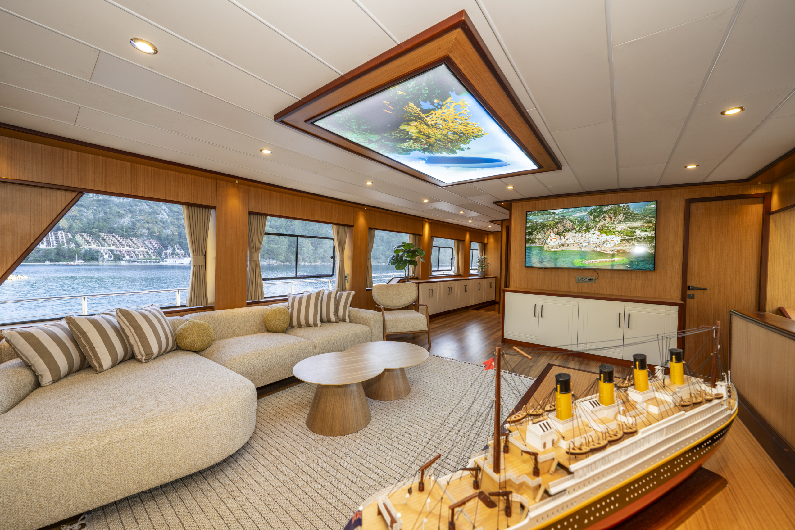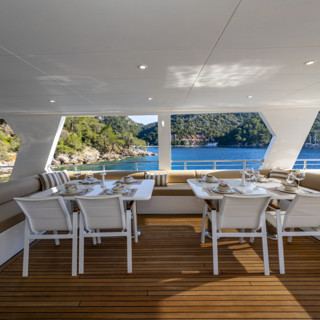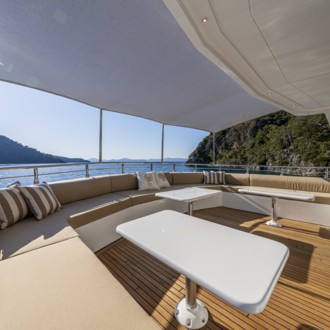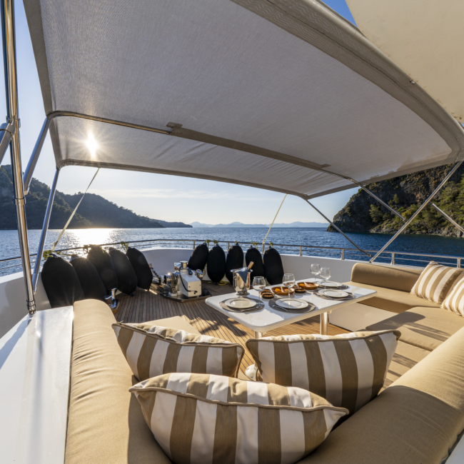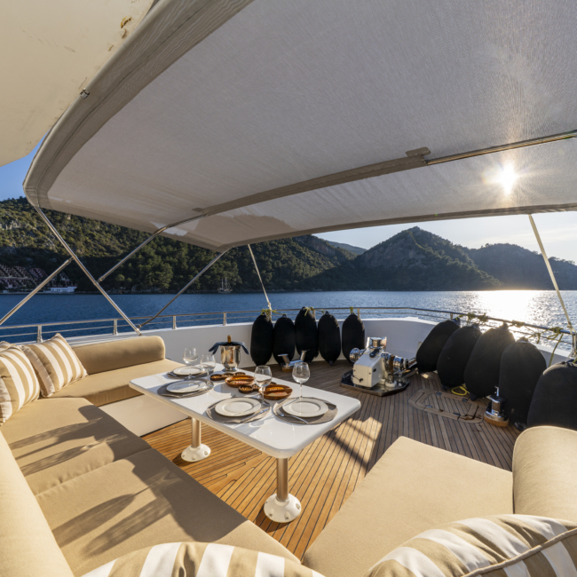 Our trawler yacht, built in 2025, with every detail carefully considered, prioritizing comfort and elegance, offers the comfort of a 5-star luxury hotel on the sea to our valued guests. This luxury yacht, designed with high quality materials and the latest technological tools, promises you an extremely safe sea travel. Our trawler type boat is 26 meters long and 7.2 meters wide. It has 2 main machines producing 450 horsepower and 2 33 kilowatt generators. Our luxury yacht has 5 cabins that can accommodate 12 people. It consists of 3 double and 2 triple cabins and is ideal for groups of 12 guests. Each cabin has 8-hour air conditioning, TV, private bathroom and toilet.