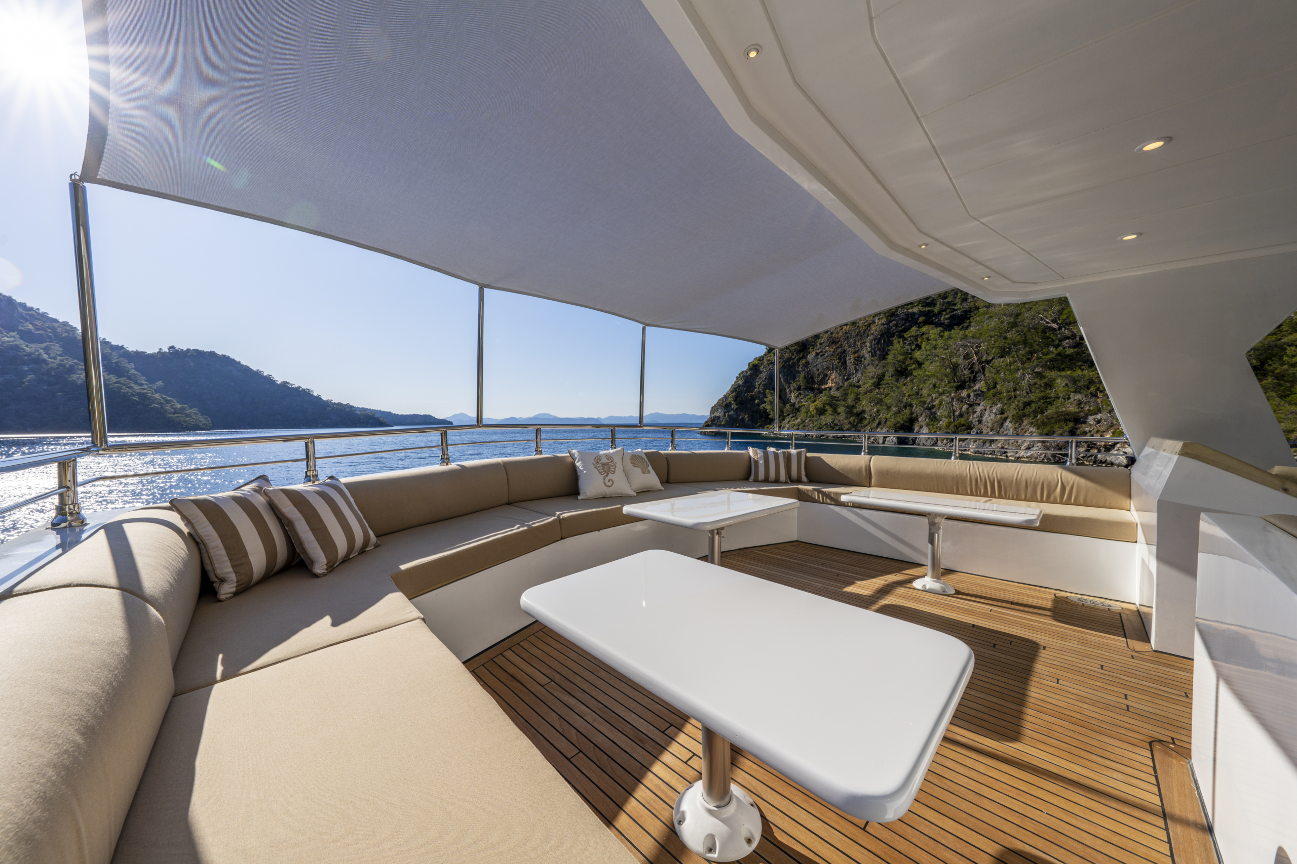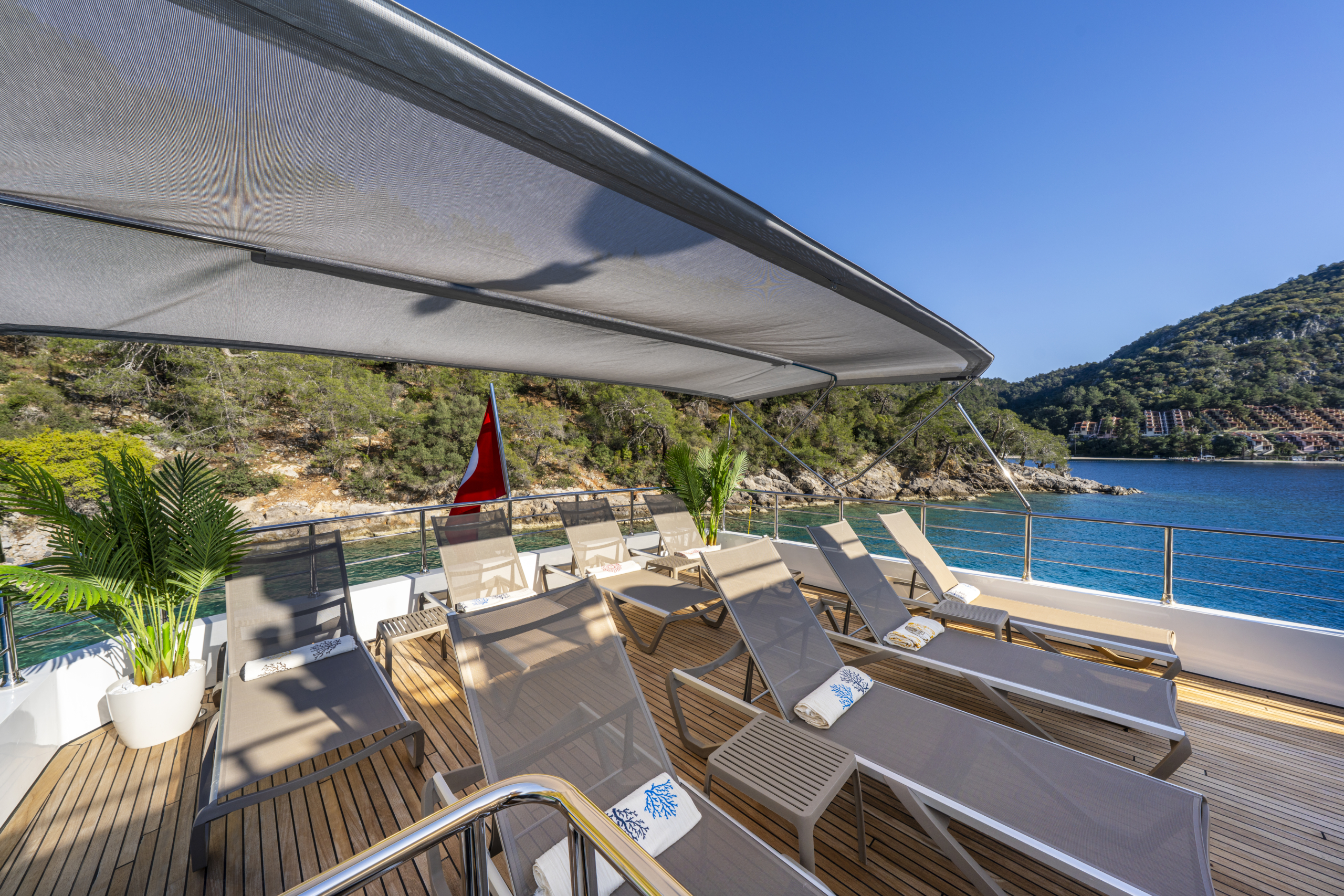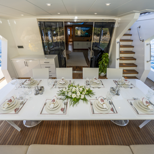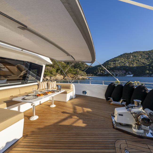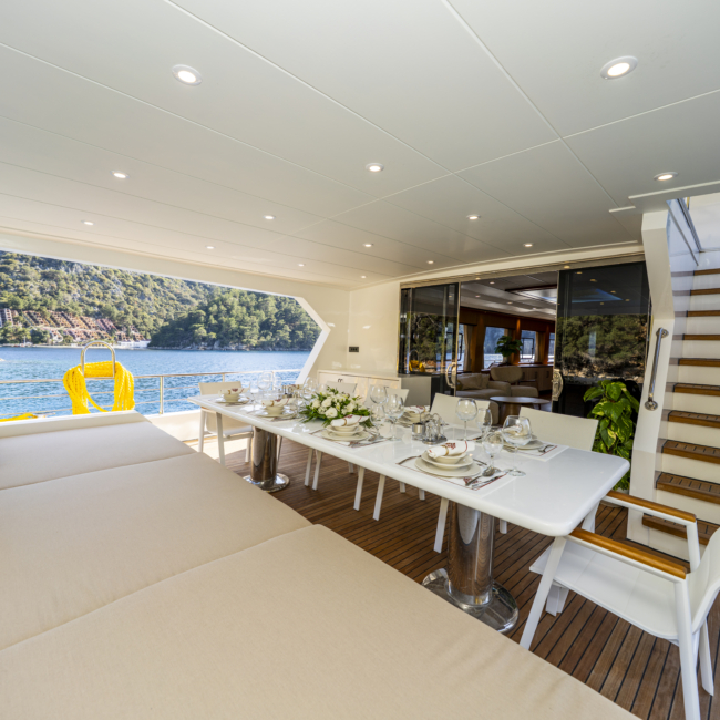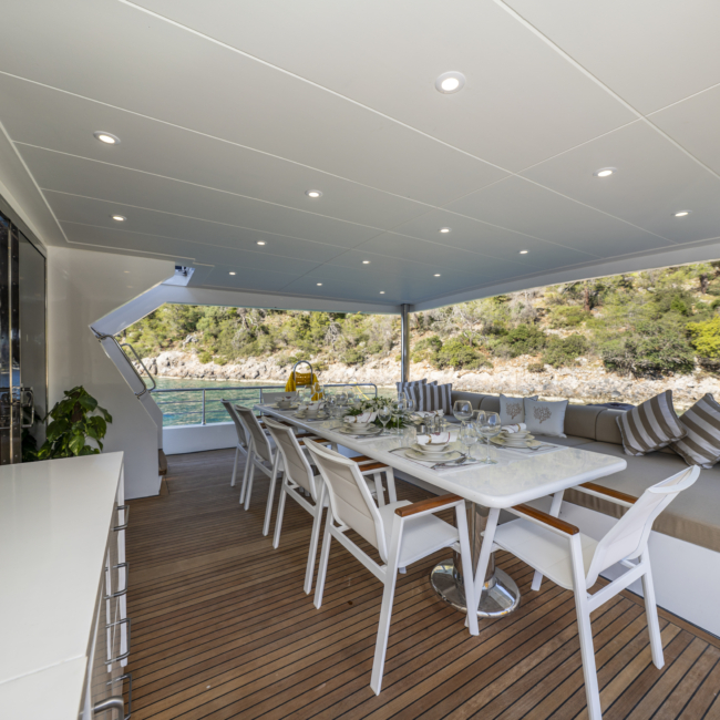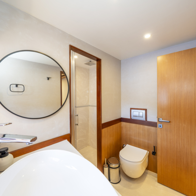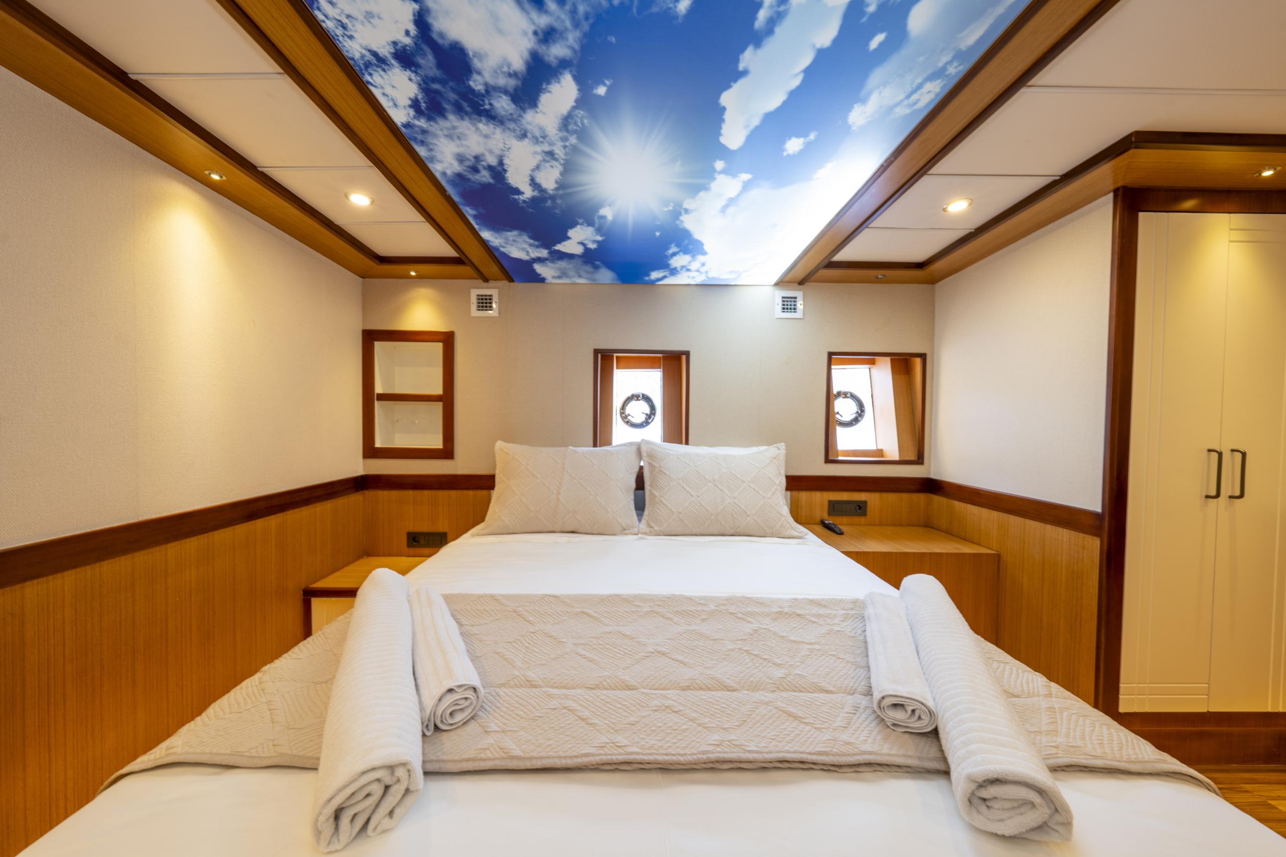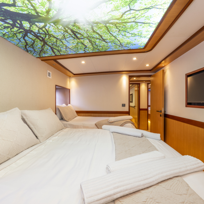 Our trawler yacht, built in 2025, with every detail carefully considered, prioritizing comfort and elegance, offers the comfort of a 5-star luxury hotel on the sea to our valued guests. This luxury yacht, designed with high quality materials and the latest technological tools, promises you an extremely safe sea travel. Our trawler type boat is 26 meters long and 7.2 meters wide. It has 2 main machines producing 450 horsepower and 2 33 kilowatt generators. Our luxury yacht has 5 cabins that can accommodate 12 people. It consists of 3 double and 2 triple cabins and is ideal for groups of 12 guests. Each cabin has 8-hour air conditioning, TV, private bathroom and toilet.
