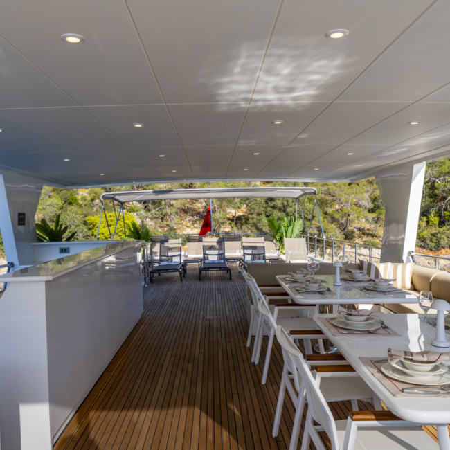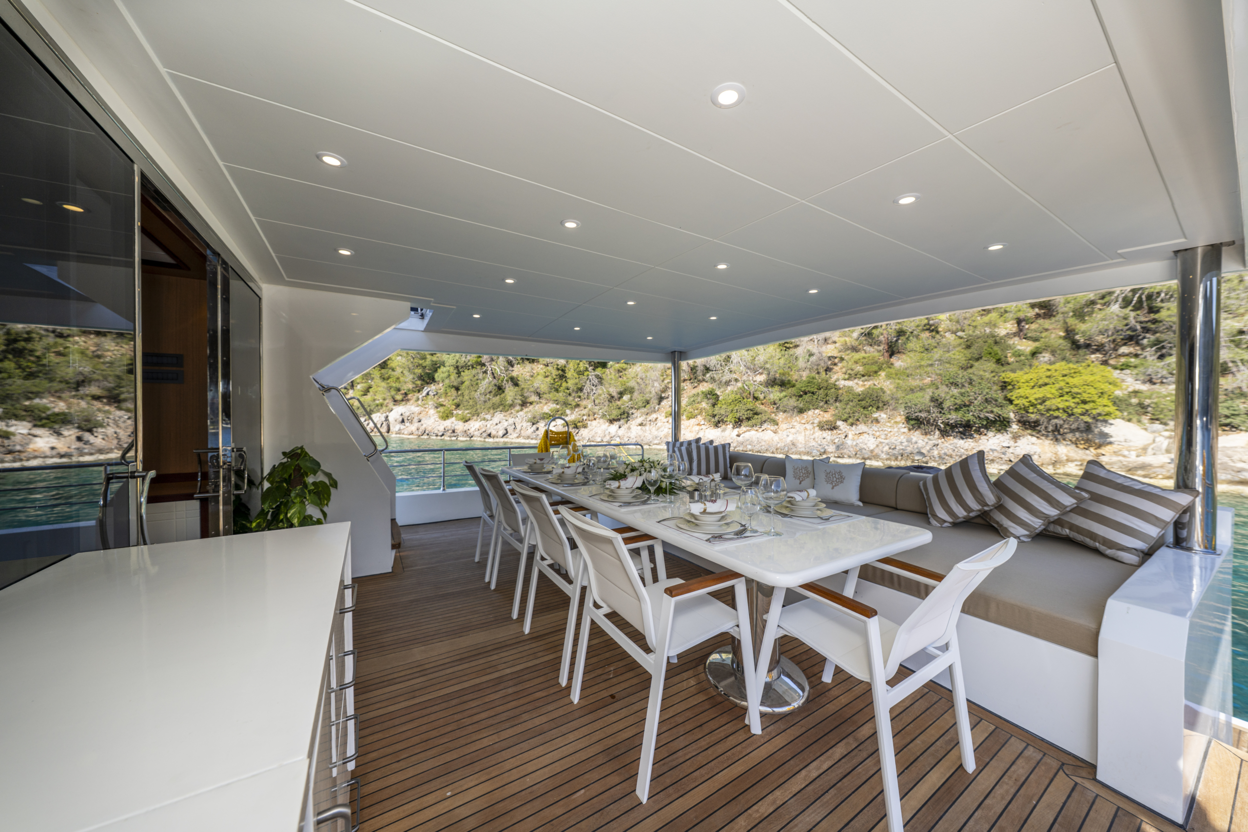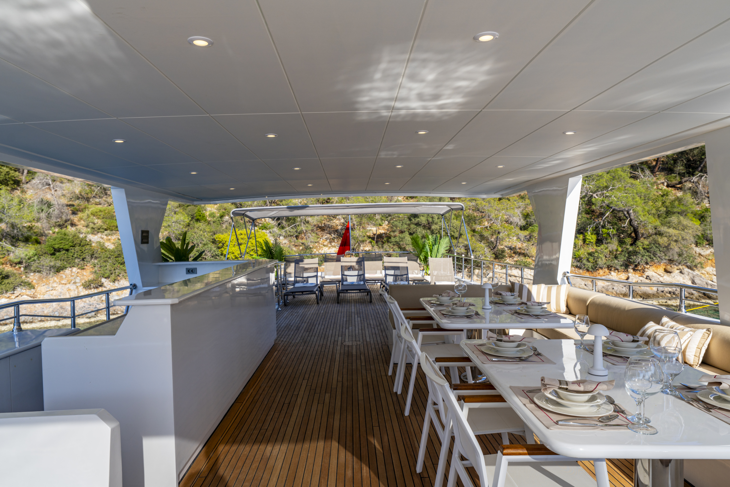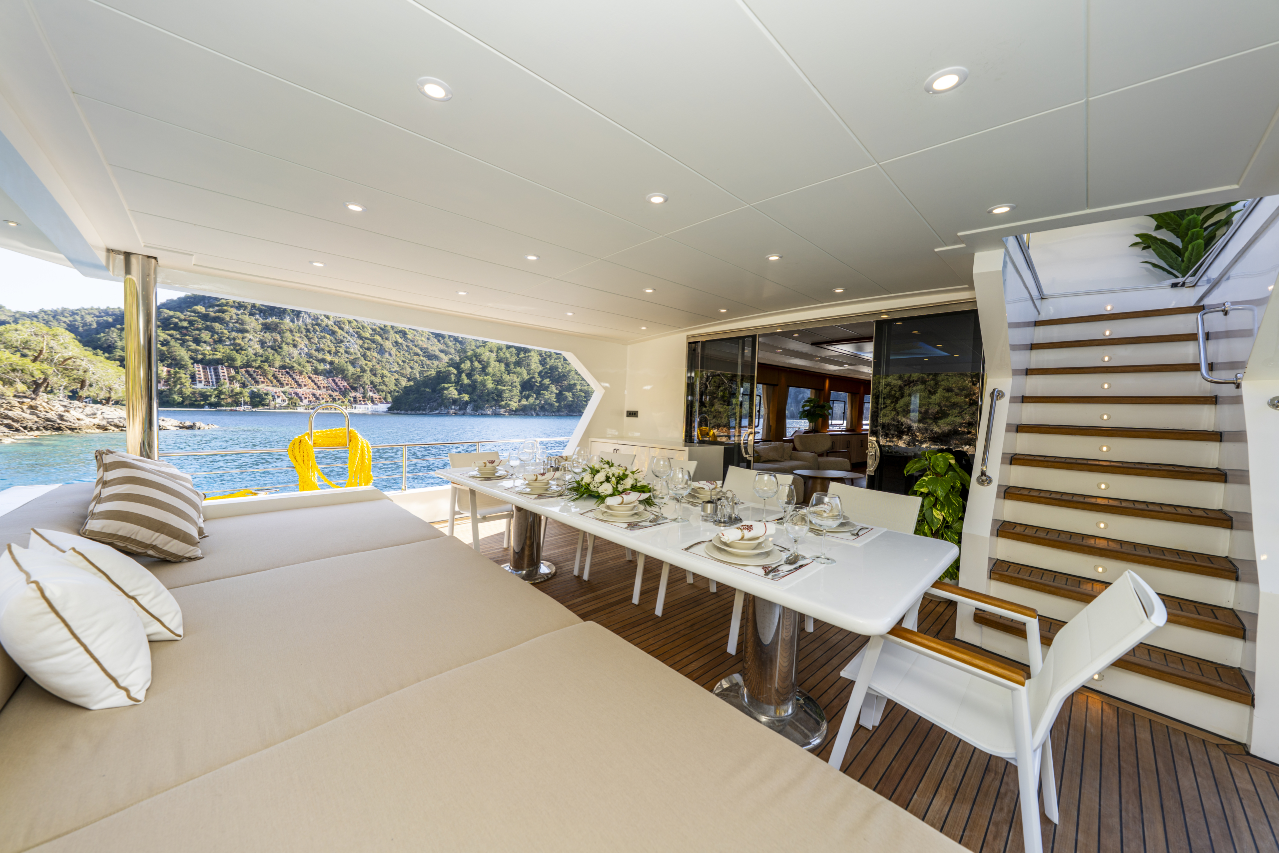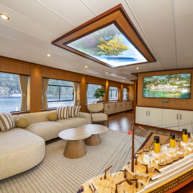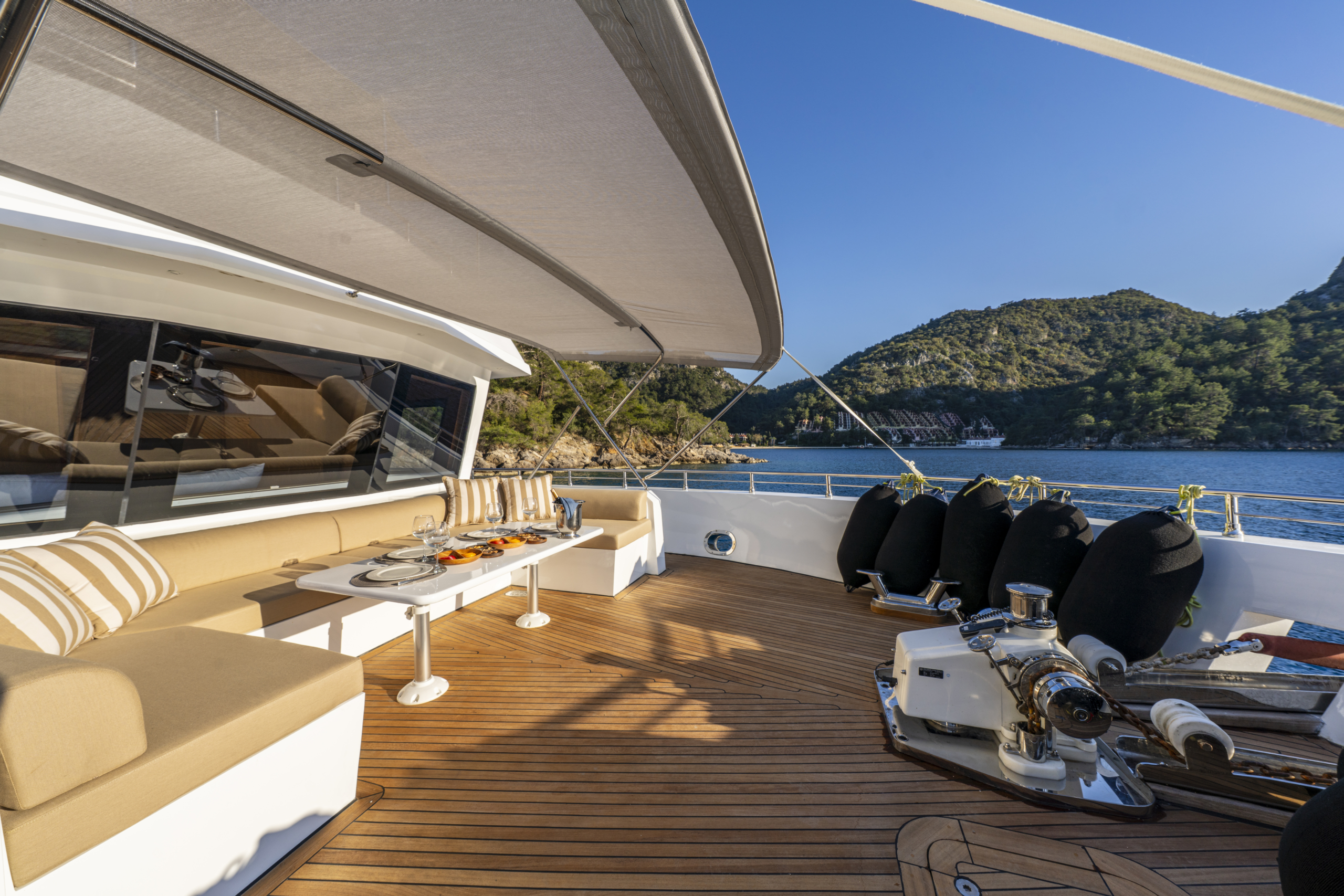 Our trawler yacht, built in 2025, with every detail carefully considered, prioritizing comfort and elegance, offers the comfort of a 5-star luxury hotel on the sea to our valued guests. This luxury yacht, designed with high quality materials and the latest technological tools, promises you an extremely safe sea travel. Our trawler type boat is 26 meters long and 7.2 meters wide. It has 2 main machines producing 450 horsepower and 2 33 kilowatt generators. Our luxury yacht has 5 cabins that can accommodate 12 people. It consists of 3 double and 2 triple cabins and is ideal for groups of 12 guests. Each cabin has 8-hour air conditioning, TV, private bathroom and toilet.