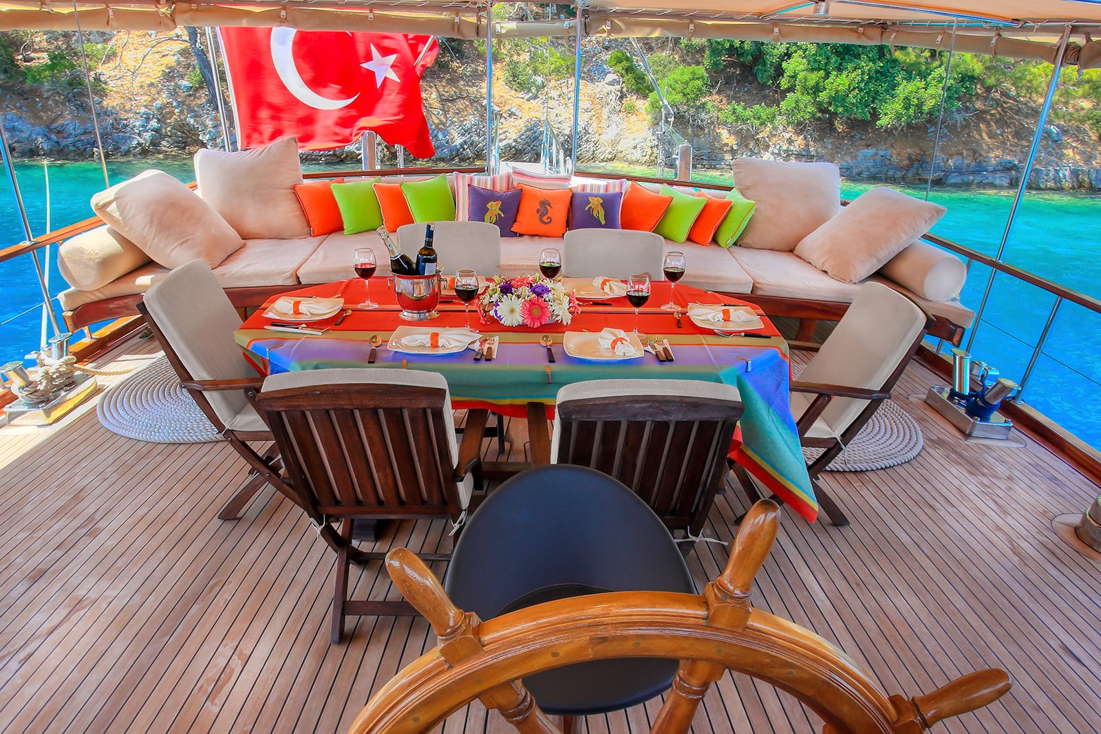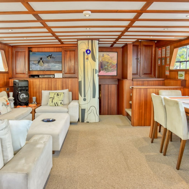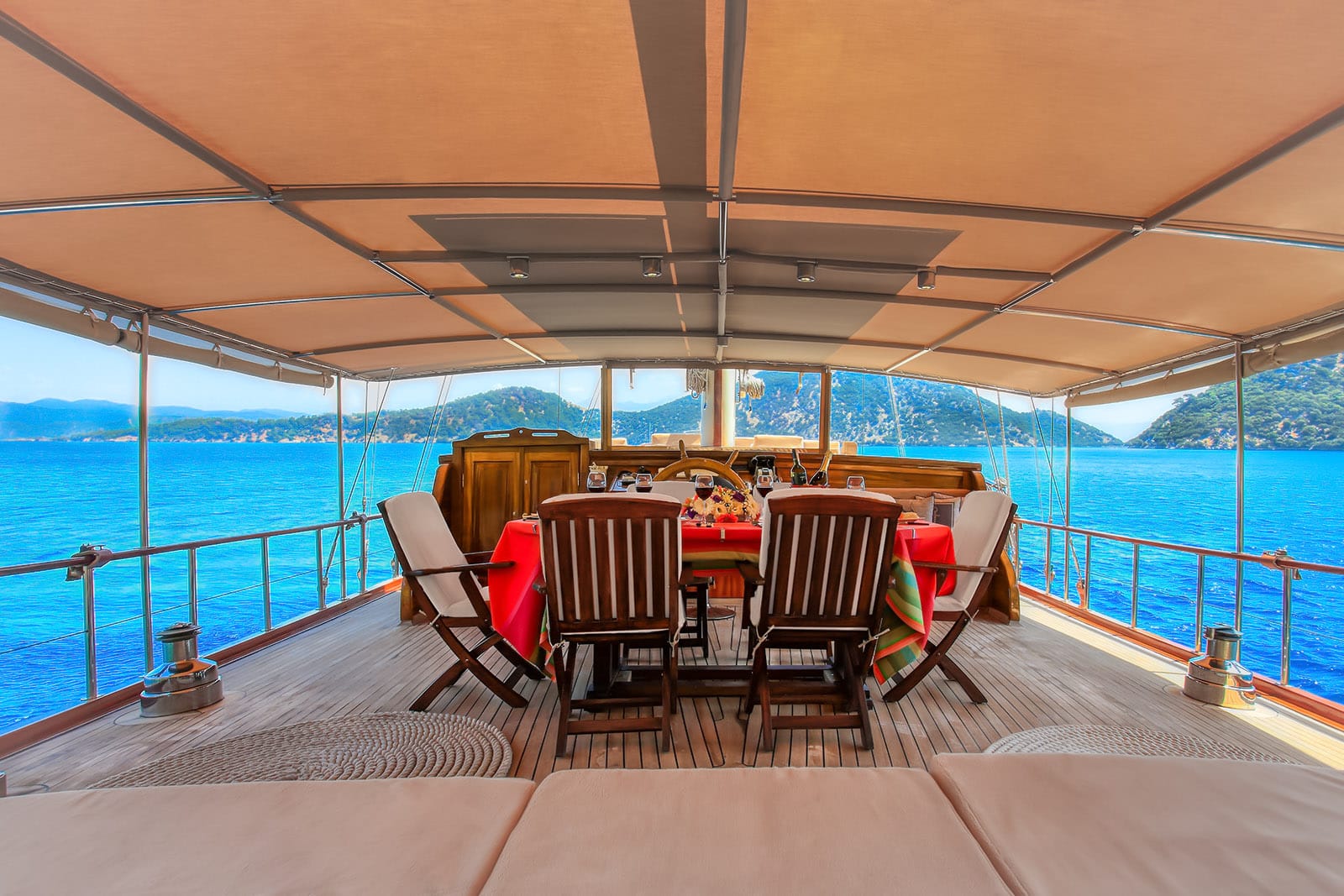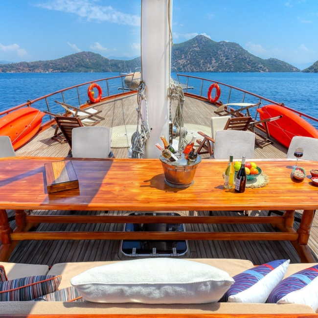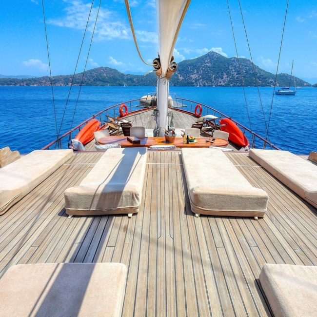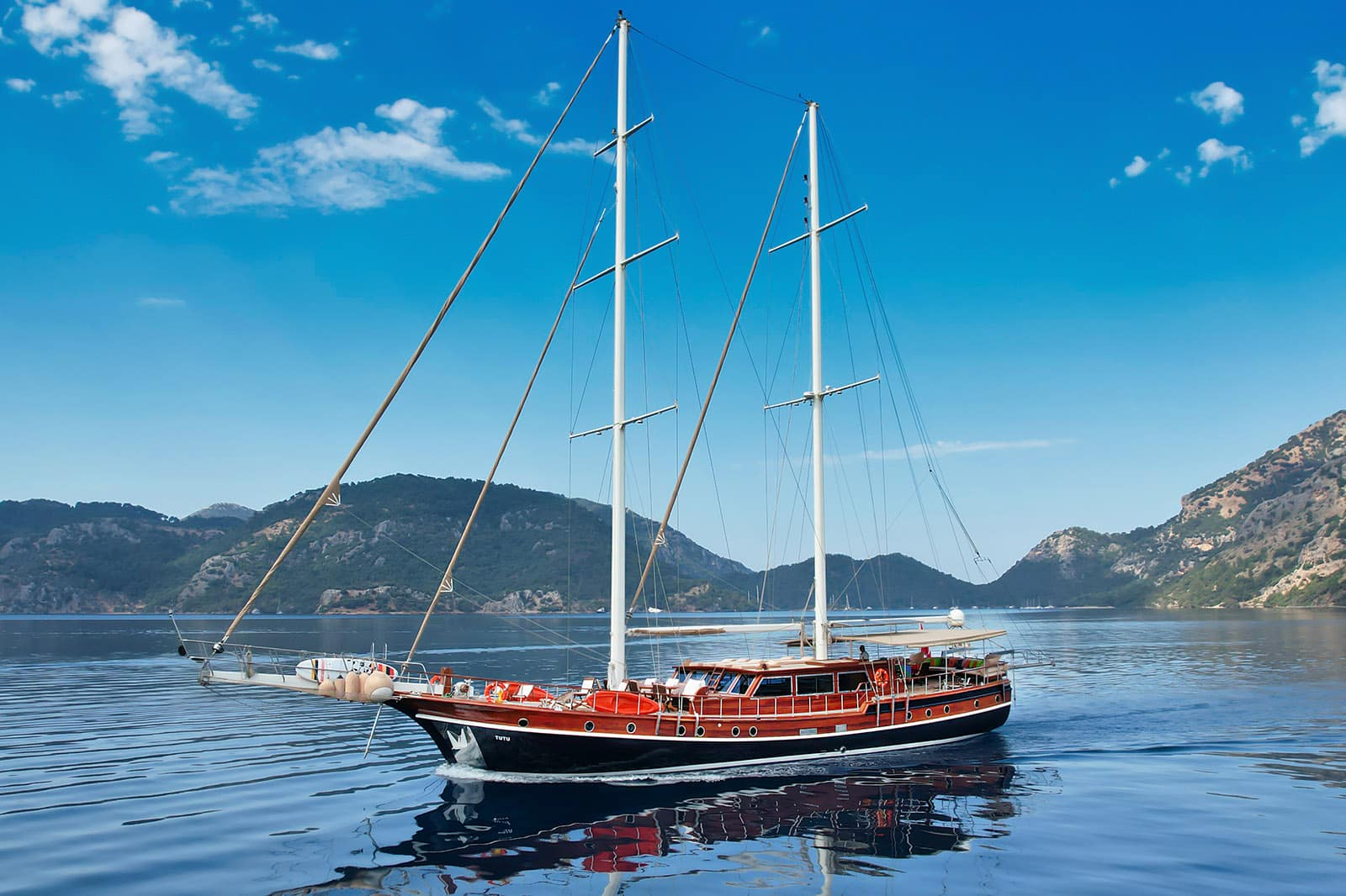 Gulet Tutu is a modern designed yacht where all the details are considered and where you can have a good time during your holiday. 5 cabins in total have 2 masters and 3 double cabins. Its length is 25 meters and its length is 7 meters. There is 4 crew on our boat, which provides blue cruise service with the Turkish flag. Completed in 2005, the boat was renewed in 2022.