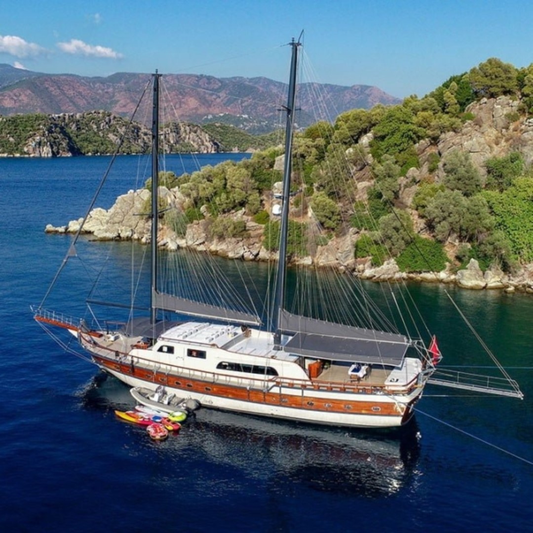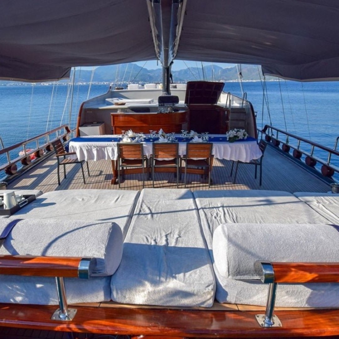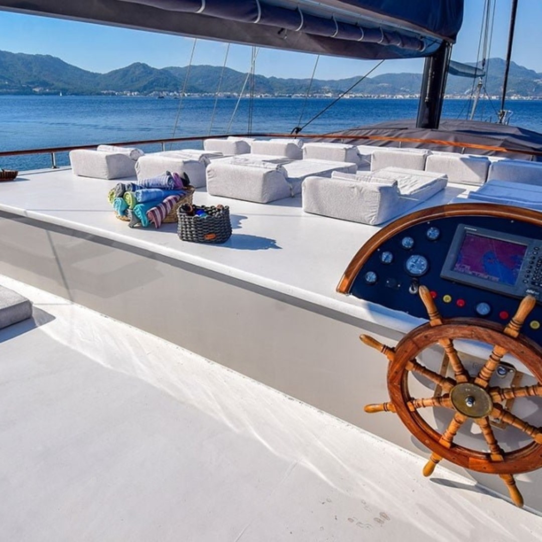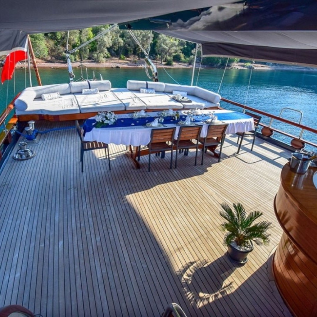 Gulet Uğur 31 m long private luxury yacht from Marmaris. We can accommodate 14 guests in our 7 cabin boat with 2 master cabin, 2 master cabin and 5 master cabin. Each cabin has a shower cabin, toilet, air conditioning and large areas. There are large resting areas, sunbathing areas and dining tables on the deck. The kitchen, designed so as not to find the hotel kitchen, will offer you flavors from different corners of the world.