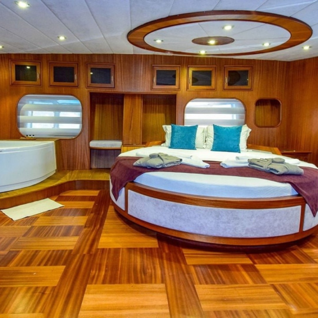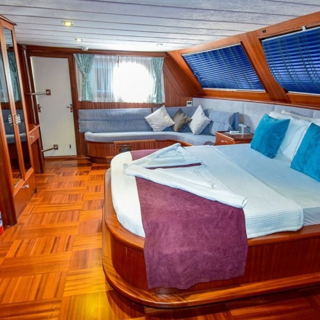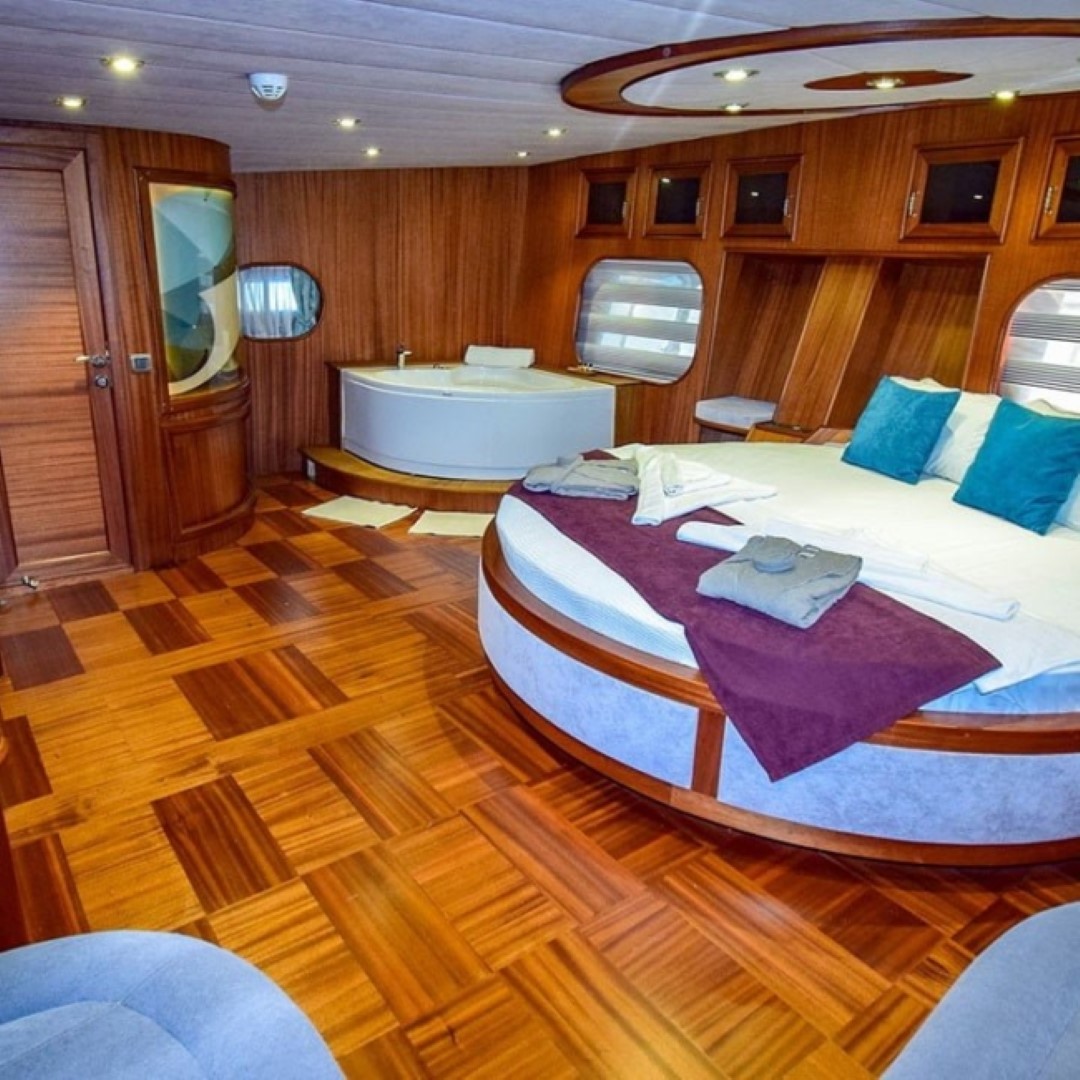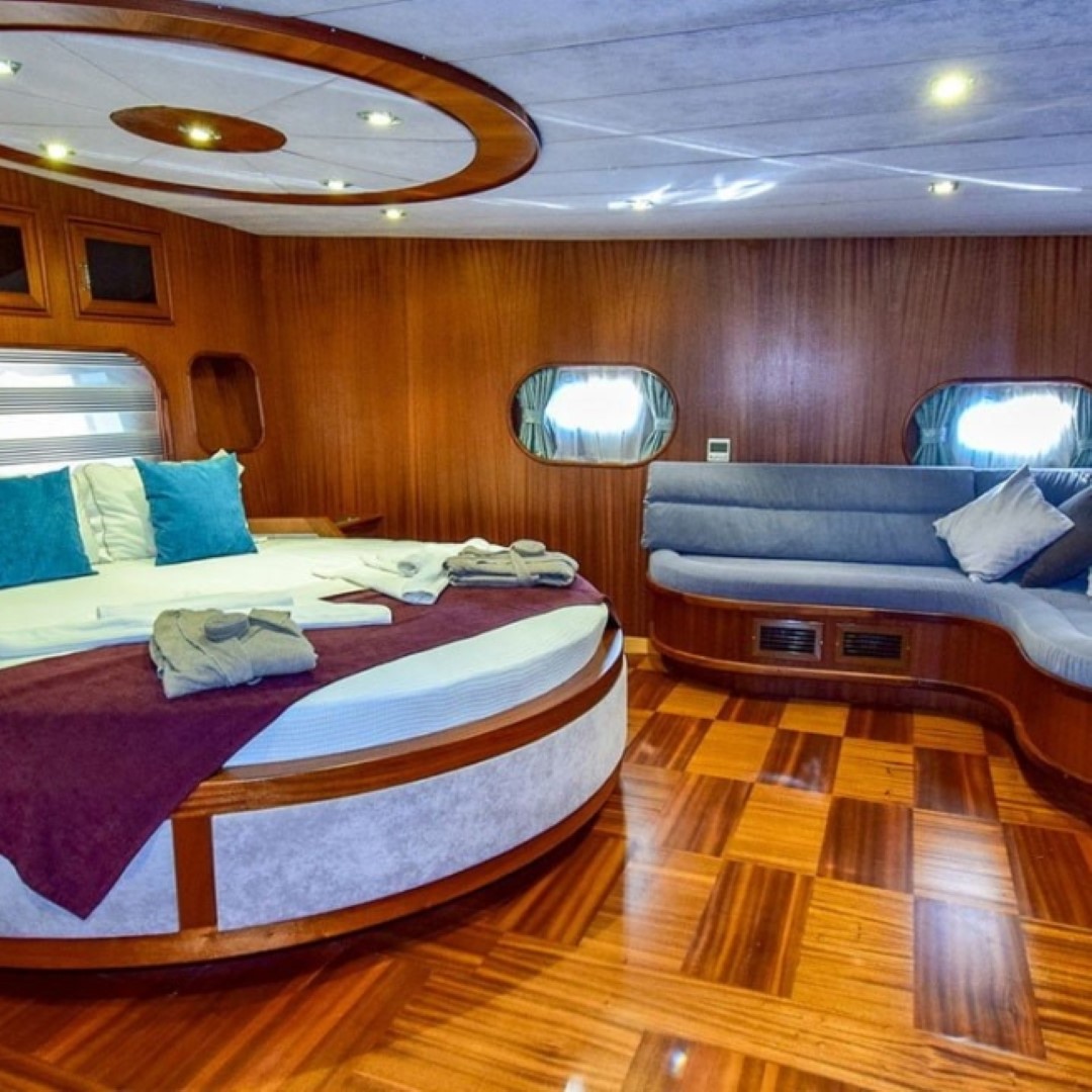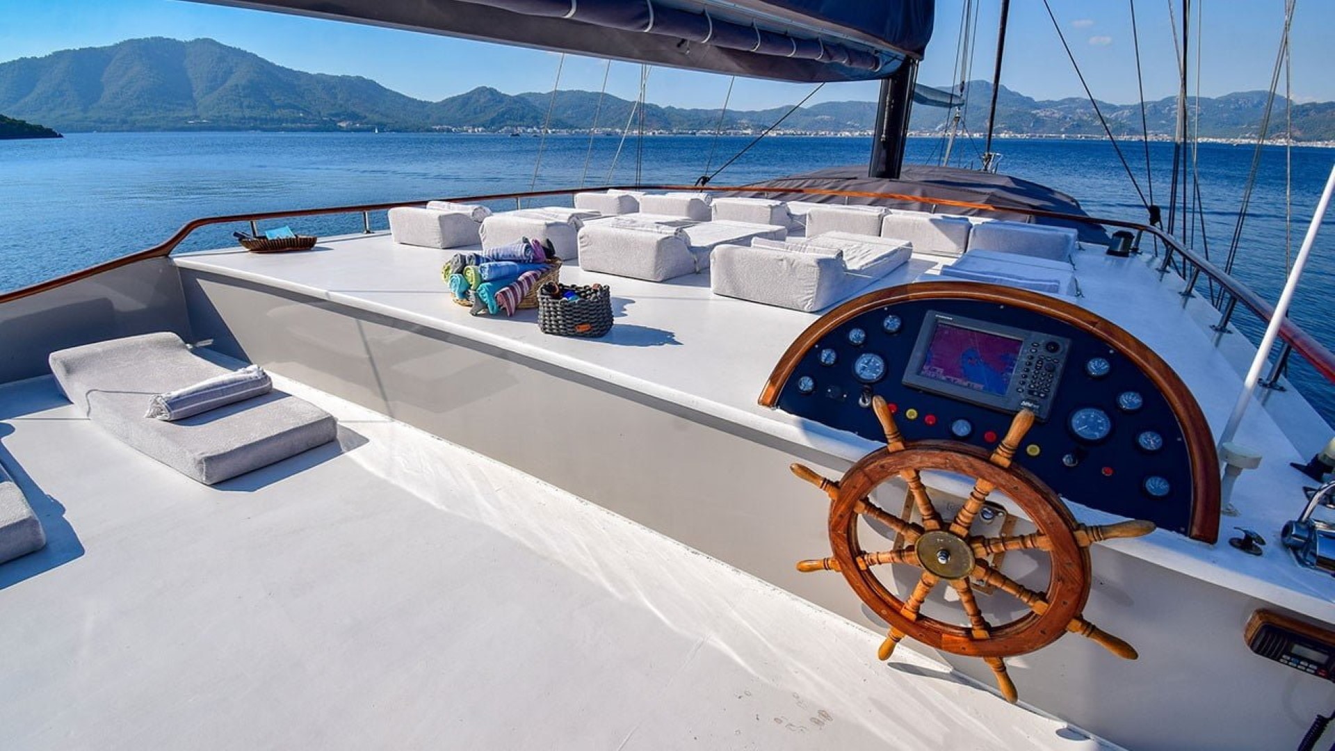 Gulet Uğur 31 m long private luxury yacht from Marmaris. We can accommodate 14 guests in our 7 cabin boat with 2 master cabin, 2 master cabin and 5 master cabin. Each cabin has a shower cabin, toilet, air conditioning and large areas. There are large resting areas, sunbathing areas and dining tables on the deck. The kitchen, designed so as not to find the hotel kitchen, will offer you flavors from different corners of the world.
