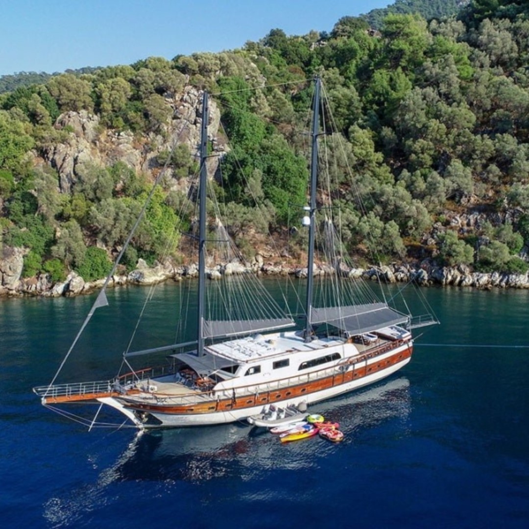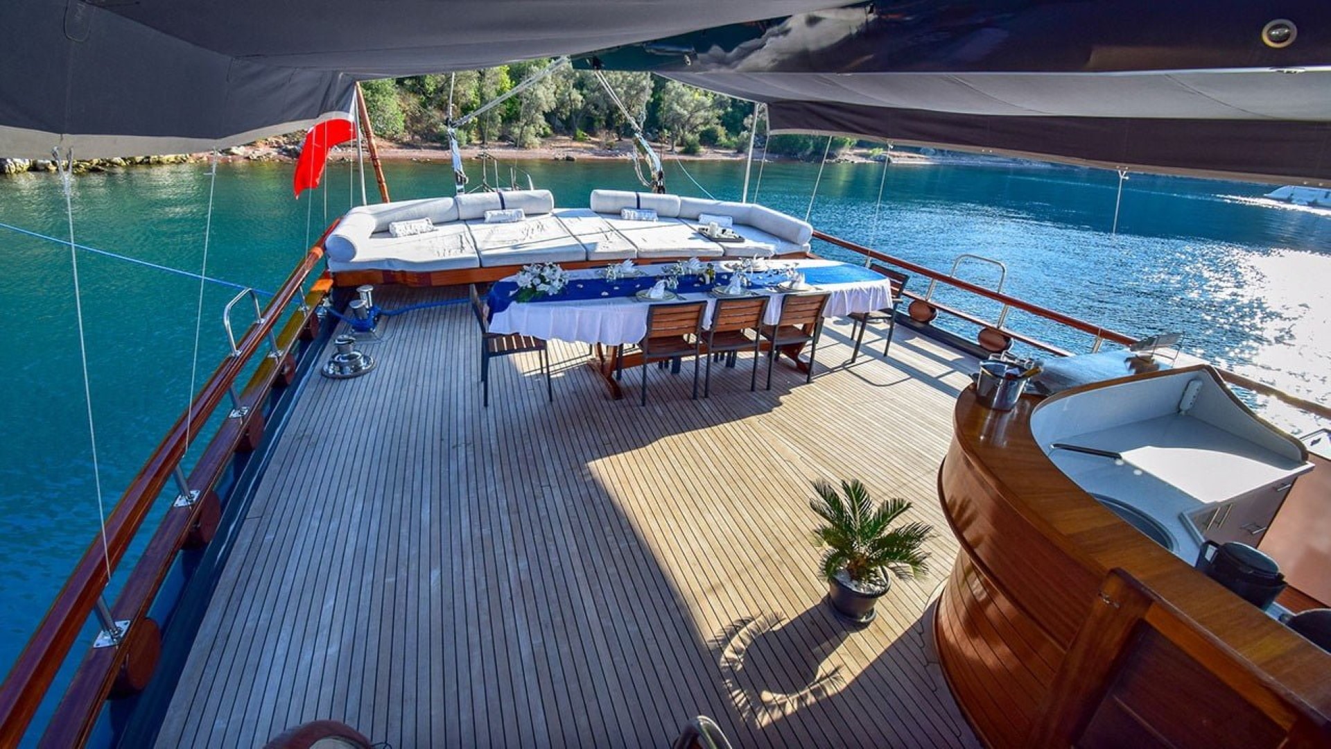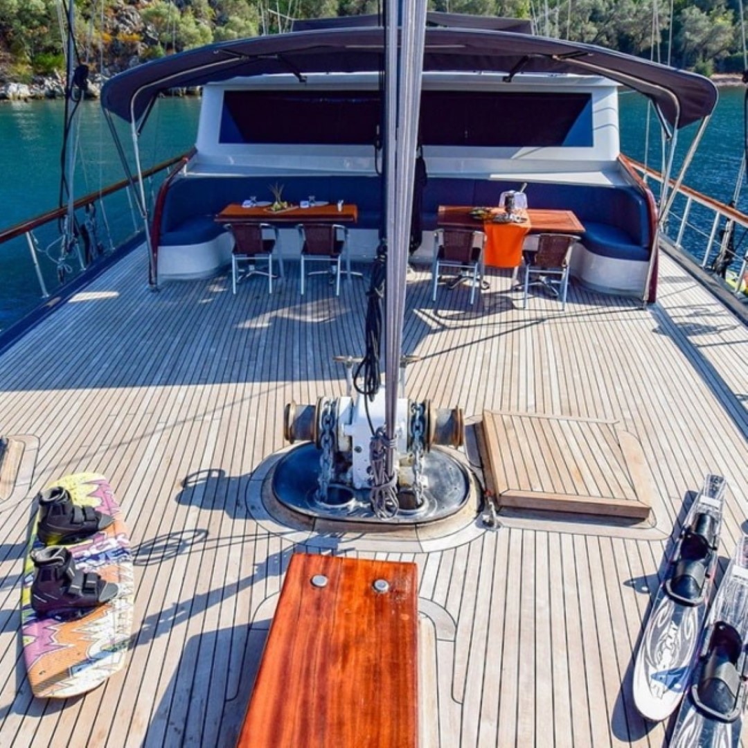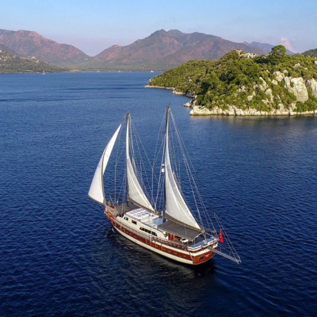 Gulet Uğur 31 m long private luxury yacht from Marmaris. We can accommodate 14 guests in our 7 cabin boat with 2 master cabin, 2 master cabin and 5 master cabin. Each cabin has a shower cabin, toilet, air conditioning and large areas. There are large resting areas, sunbathing areas and dining tables on the deck. The kitchen, designed so as not to find the hotel kitchen, will offer you flavors from different corners of the world.