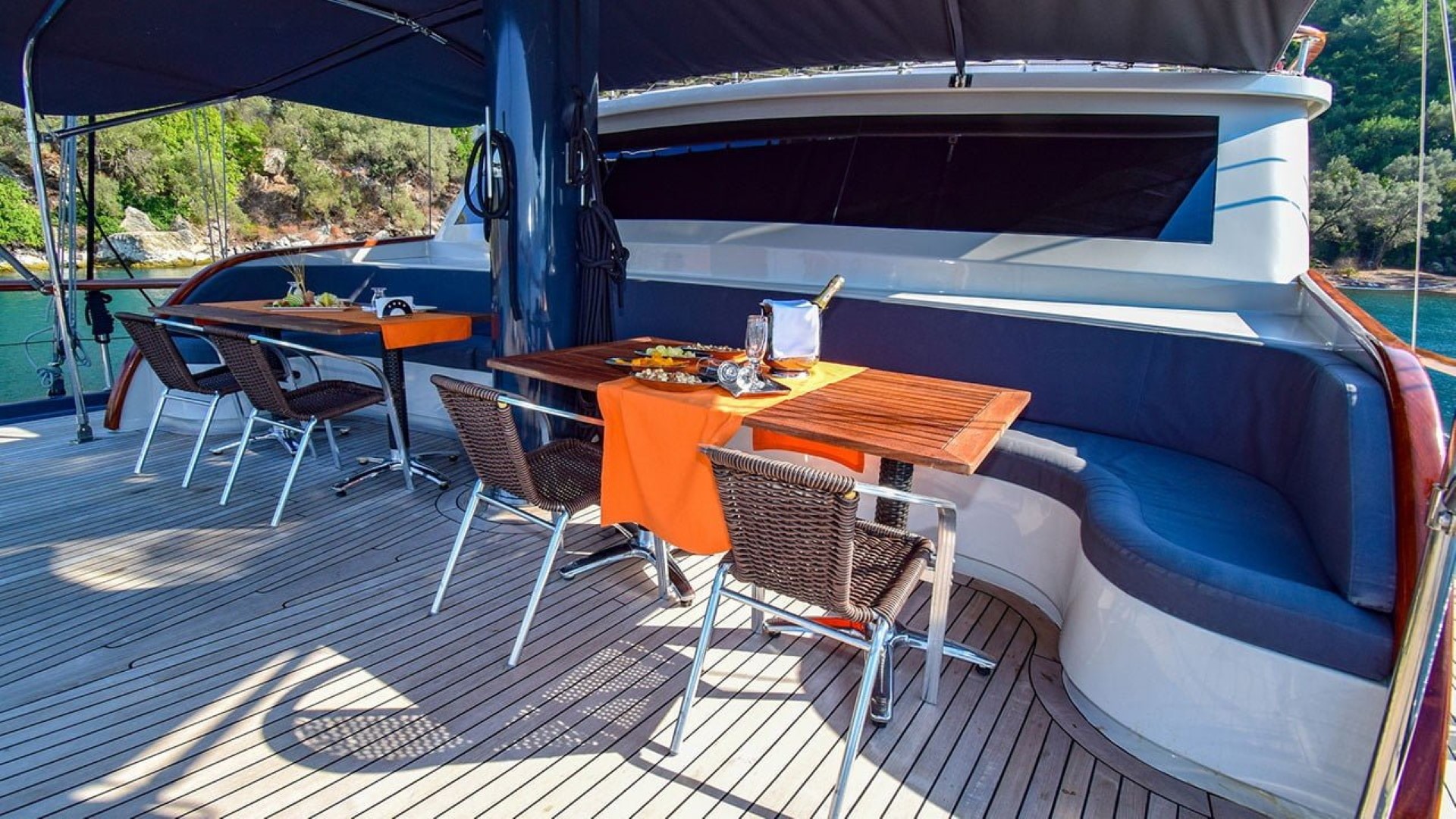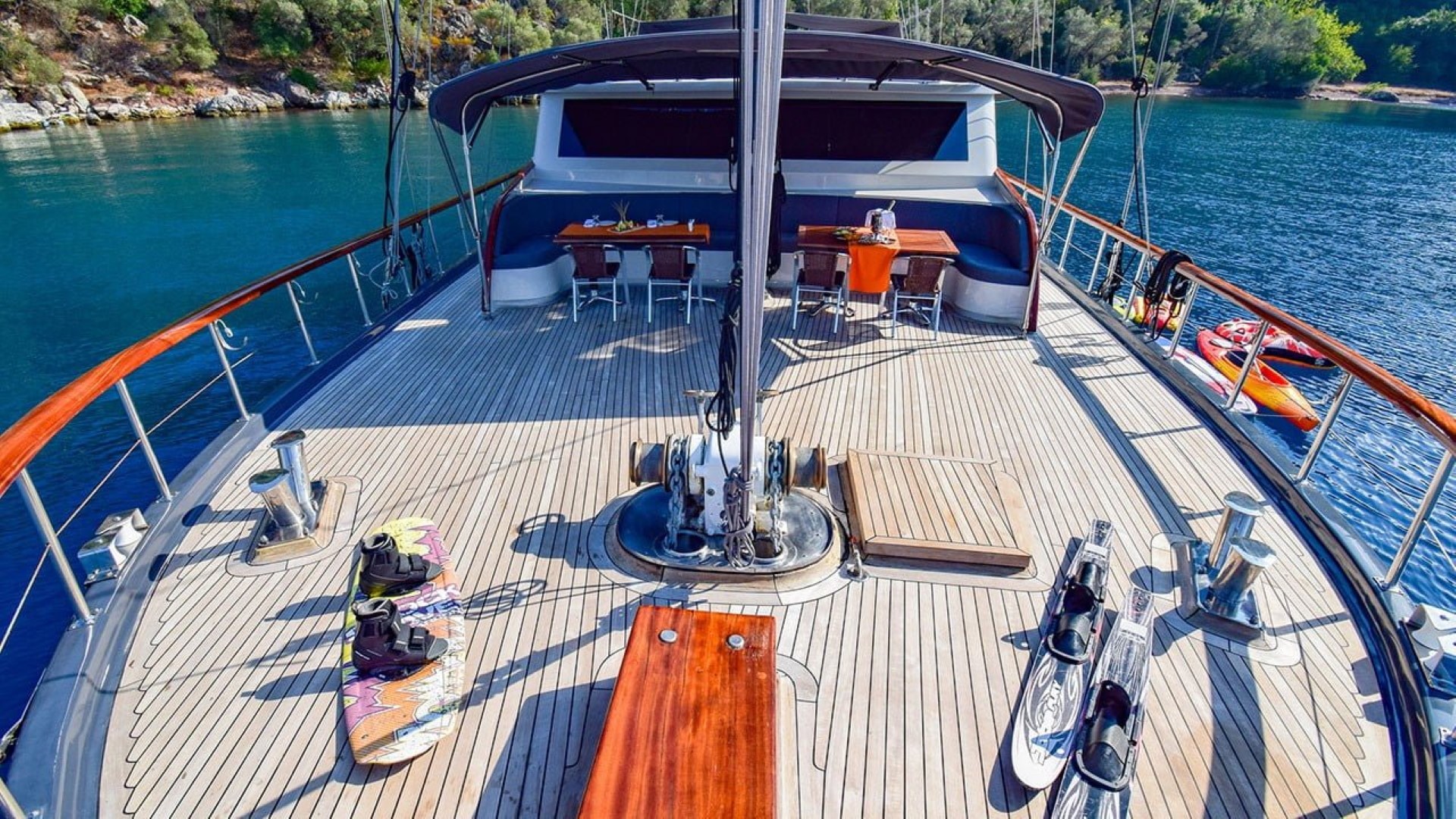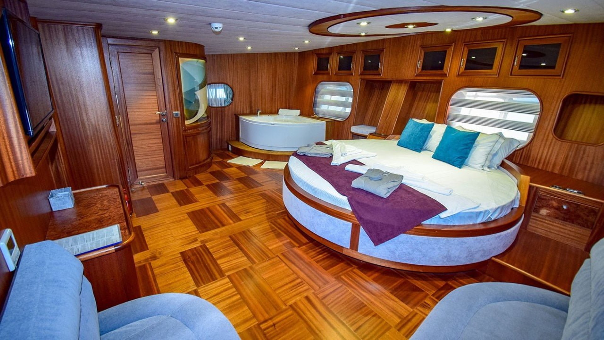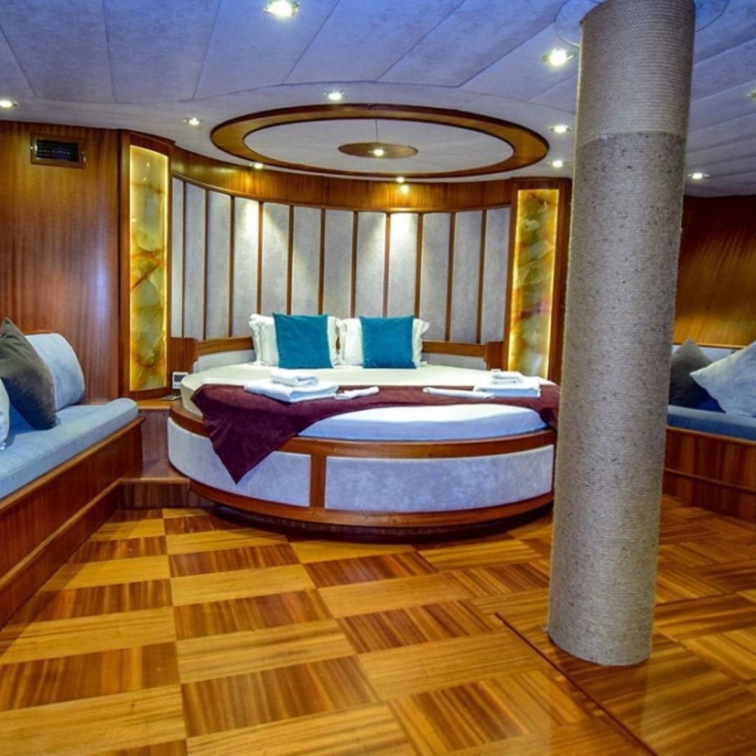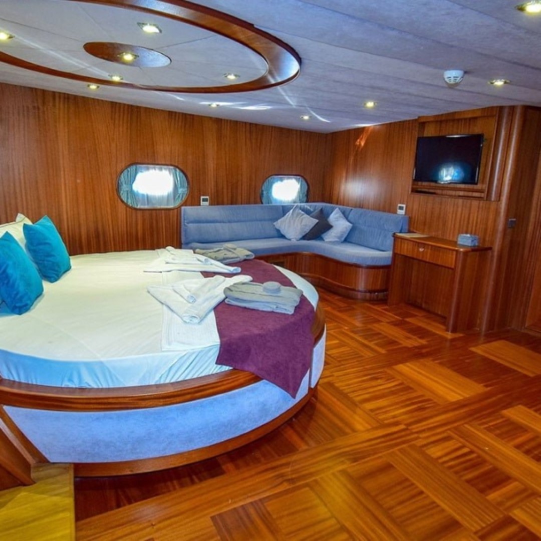 Gulet Uğur 31 m long private luxury yacht from Marmaris. We can accommodate 14 guests in our 7 cabin boat with 2 master cabin, 2 master cabin and 5 master cabin. Each cabin has a shower cabin, toilet, air conditioning and large areas. There are large resting areas, sunbathing areas and dining tables on the deck. The kitchen, designed so as not to find the hotel kitchen, will offer you flavors from different corners of the world.