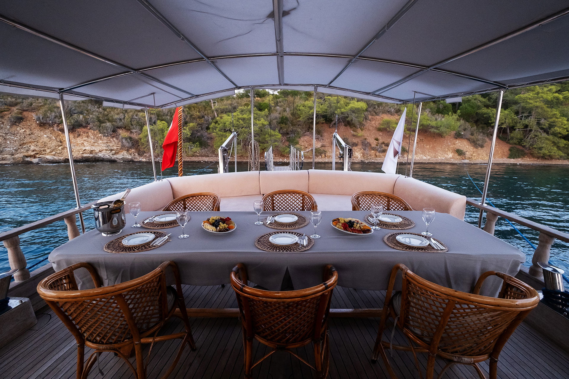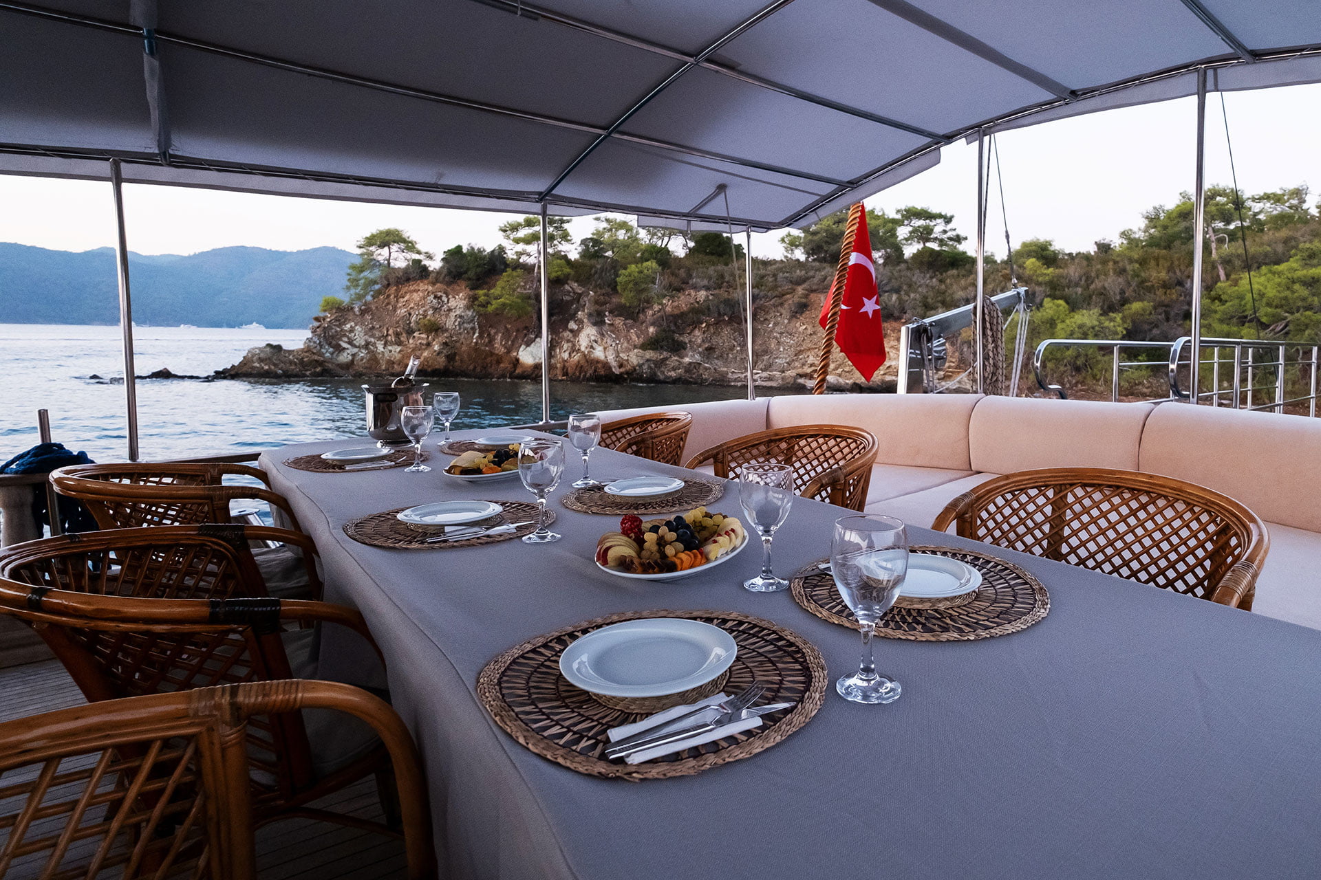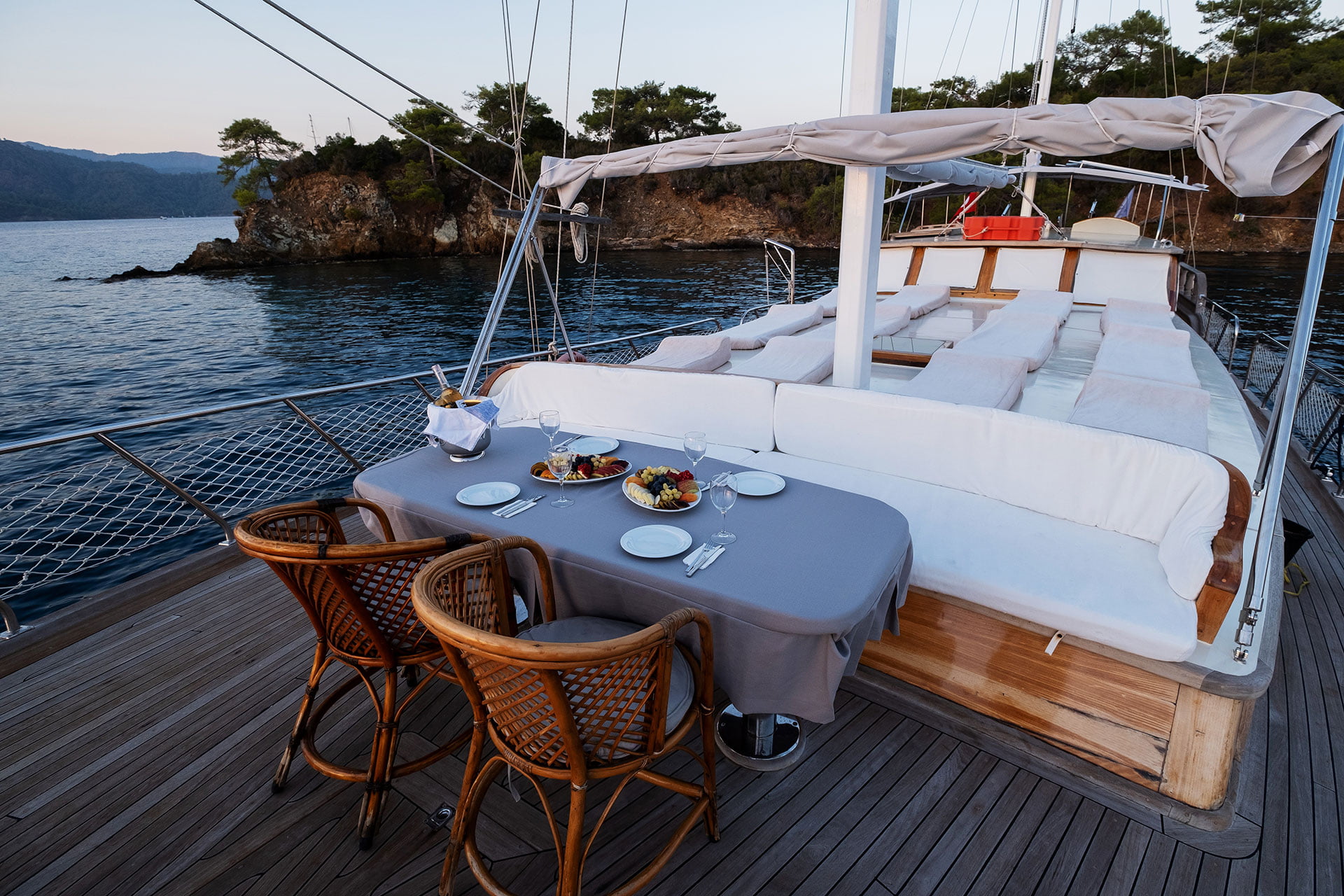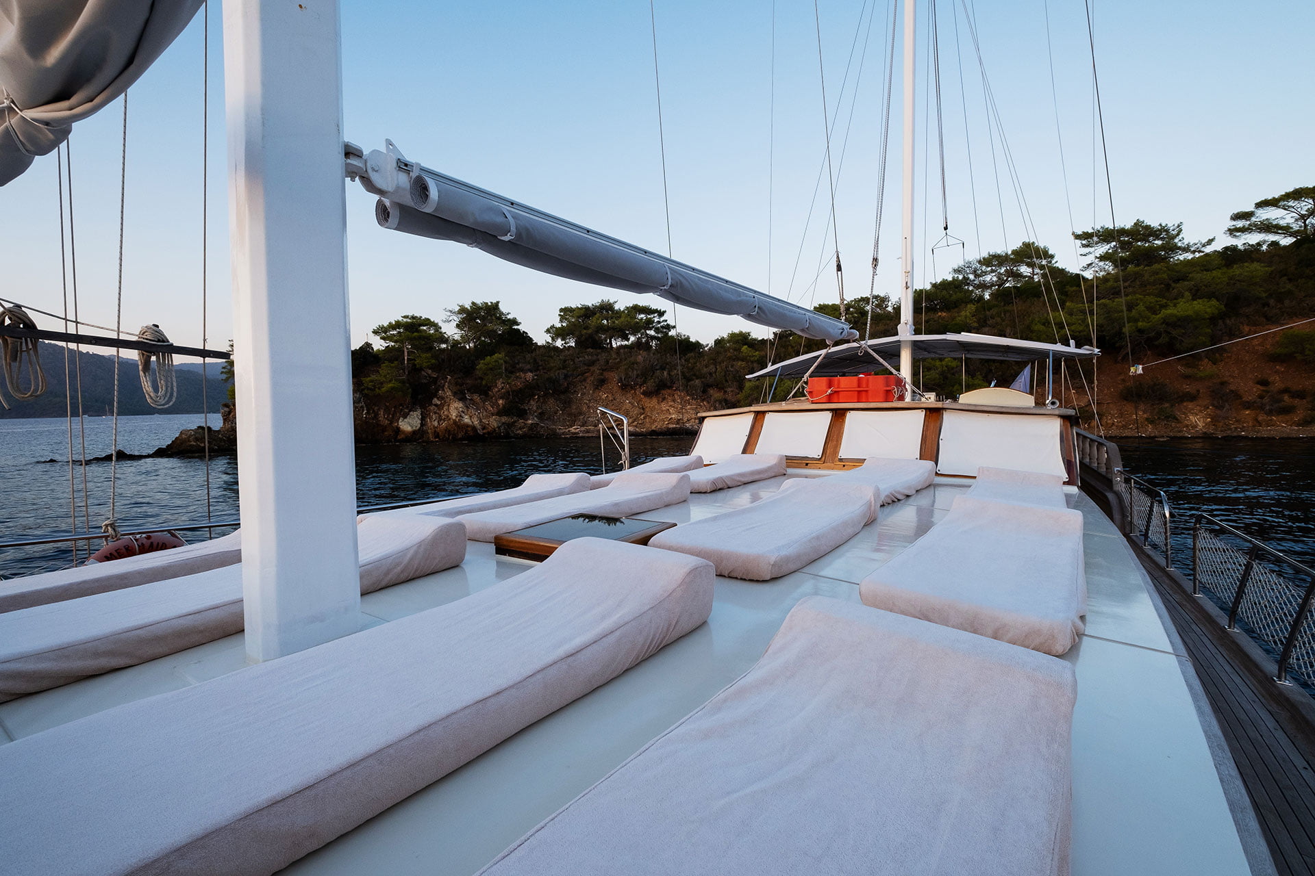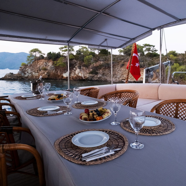 Gulet White It was built in 1993. It took its final form with the revision it went through in 2018. It has a length of 23 m and a width of 6.10 m. It provides blue cruise service to our esteemed guests with its 3 personnel. 6 cabins, 6 doubles Passenger capacity maximum 12 people in Turkish territorial waters WC, bath and hand towels, hair dryer.