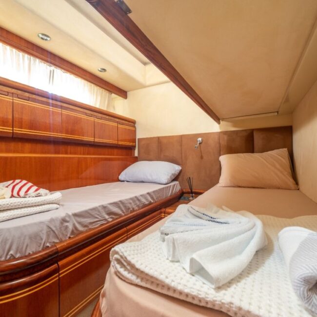 twin ve 1 VIP şeklinde maksimum 10 kişilik konaklama kapasitesine sahiptir. 1996 yılında yapılan tekne 2020 yılında yenilenmiştir. Türk