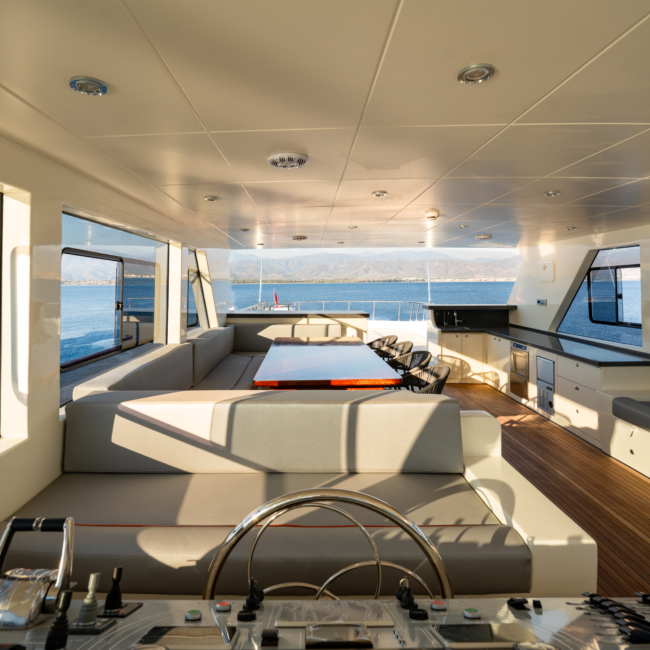 •Flybridge alanında güneşlenme minderleri, bar, buz makinesi, buzdolabı