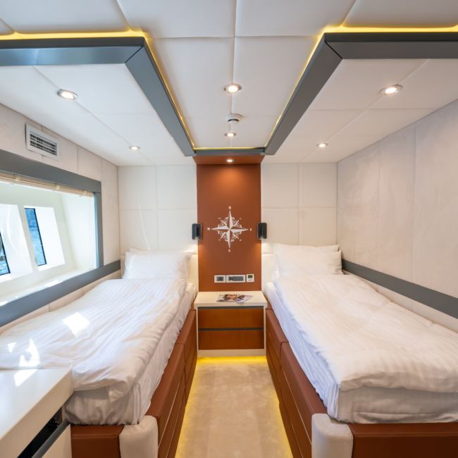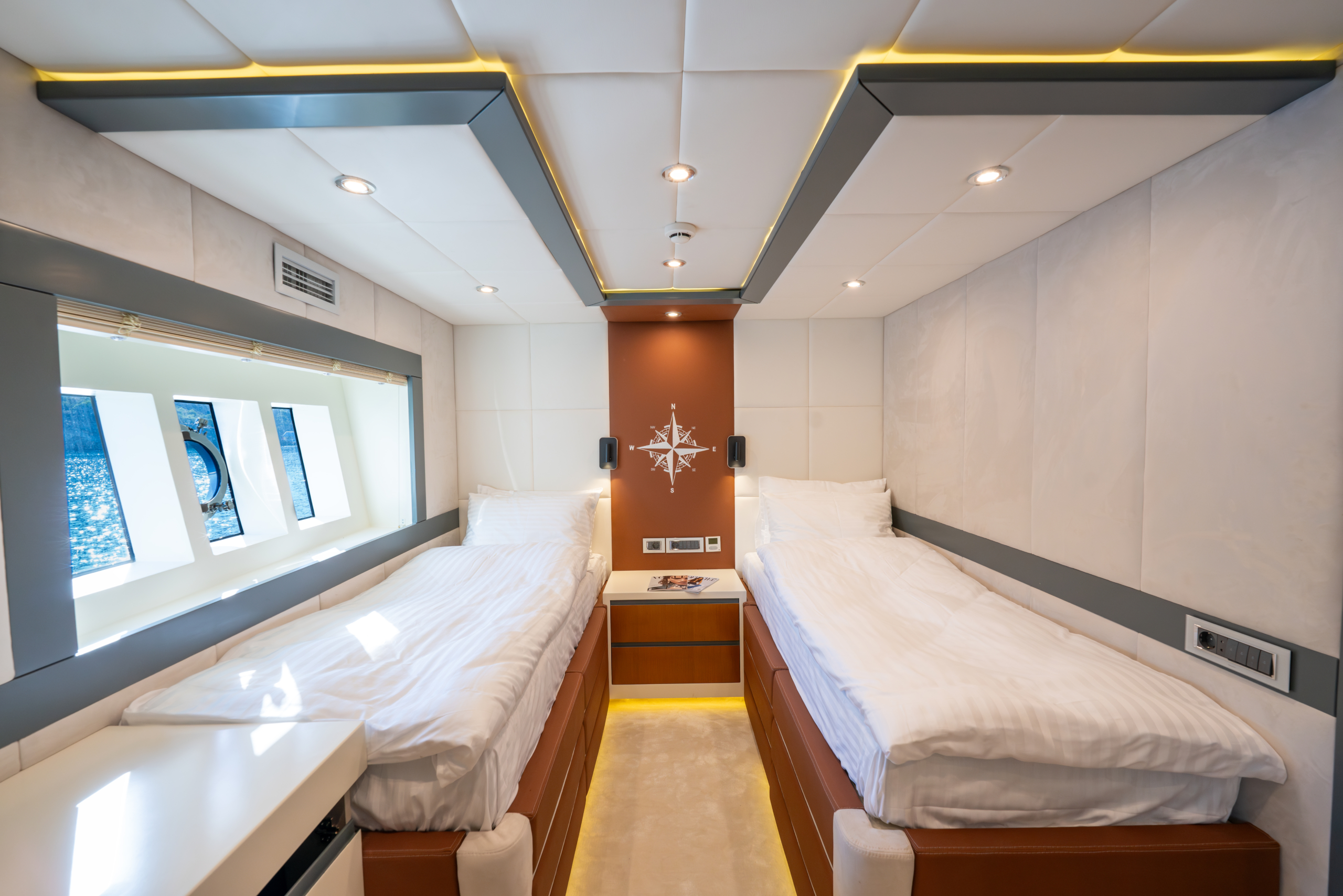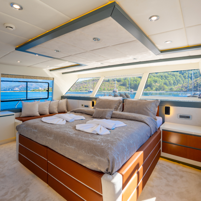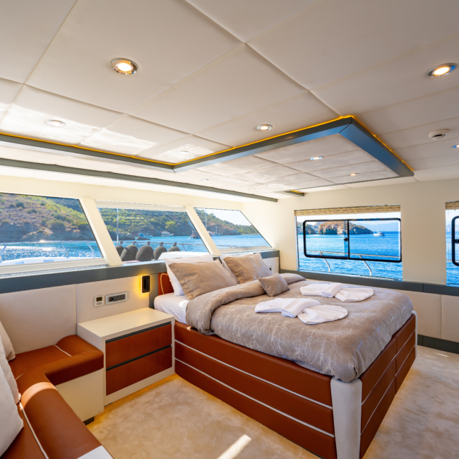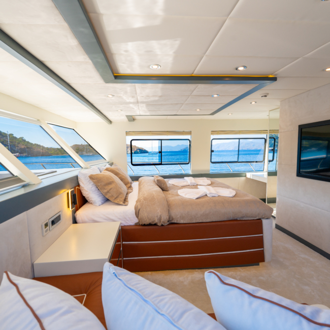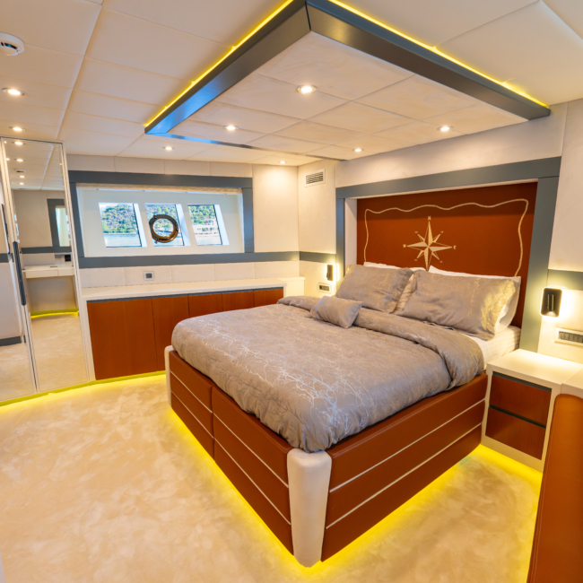 Trawler Alessandro, 2024 yılında inşa edilmiş, 26 metre uzunluğunda ve 7 metre genişliğinde, modern ve konforlu donanımıyla deniz tutkunlarına unutulmaz bir mavi yolculuk deneyimi sunmaktadır. 8 kişiye kadar konaklama kapasitesine sahip olan yatımızda, her biri özenle tasarlanmış 4 lüks kabin bulunmaktadır: güvertede 1 VIP kabin, 2 Master kabin ve 1 Twin kabin.