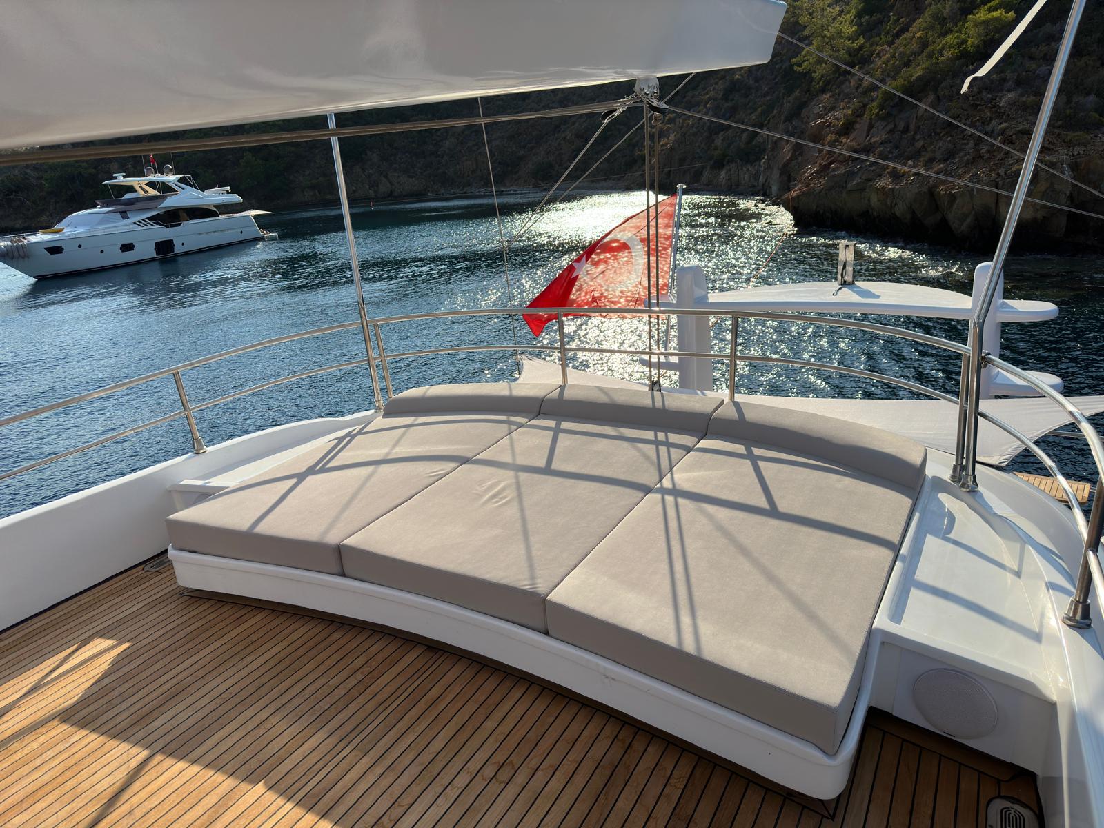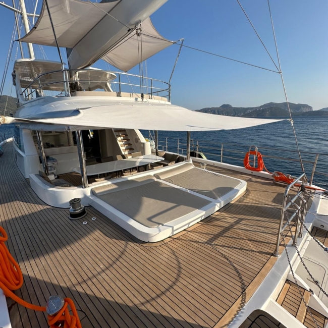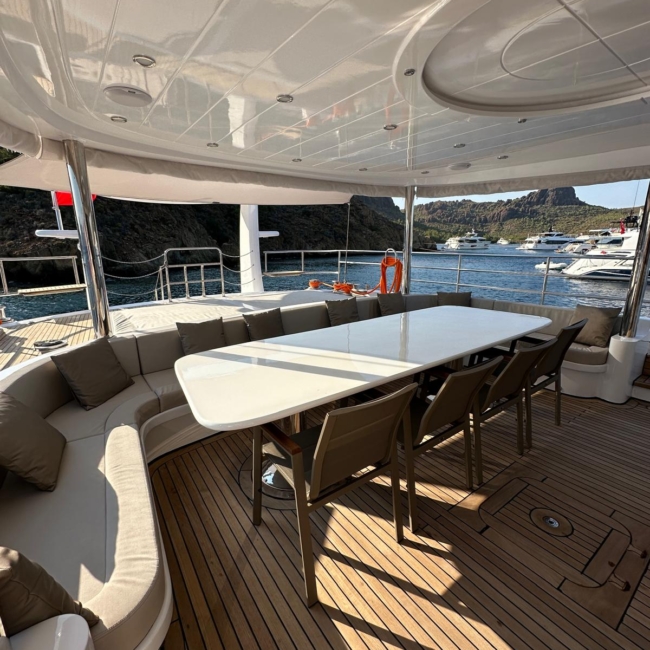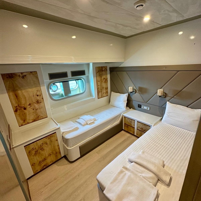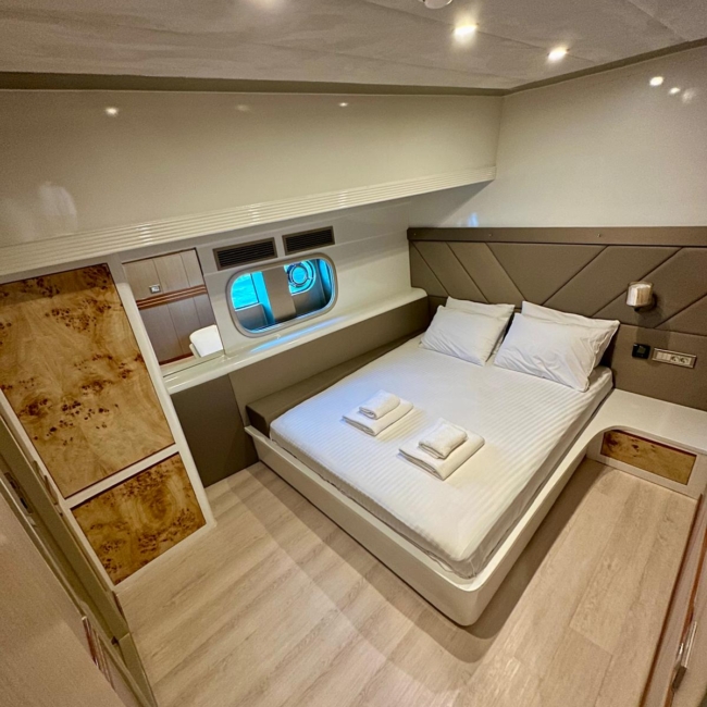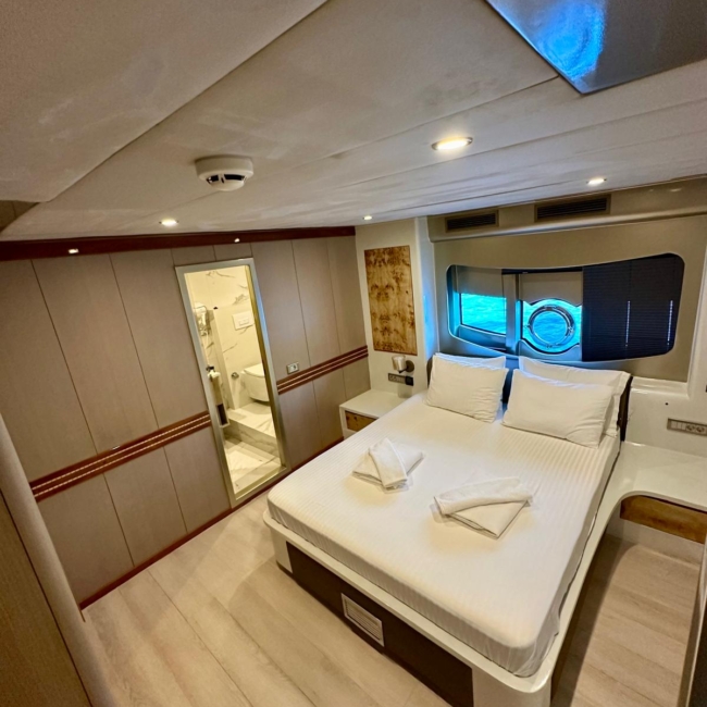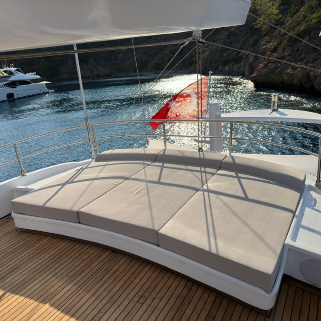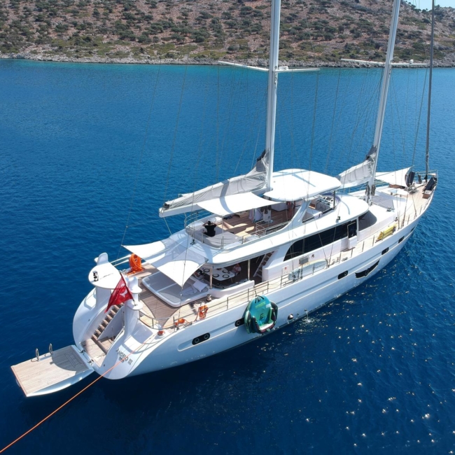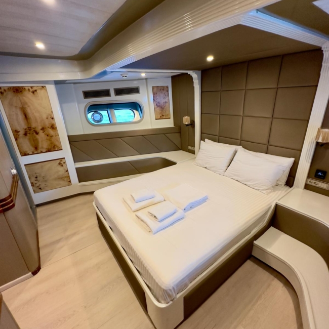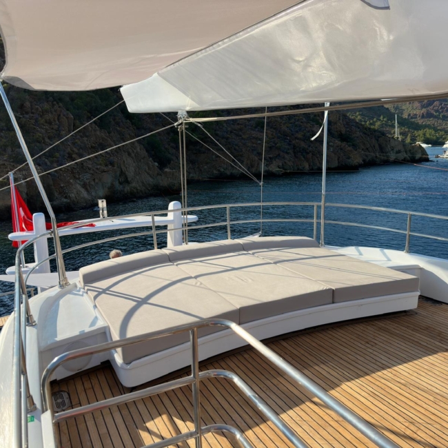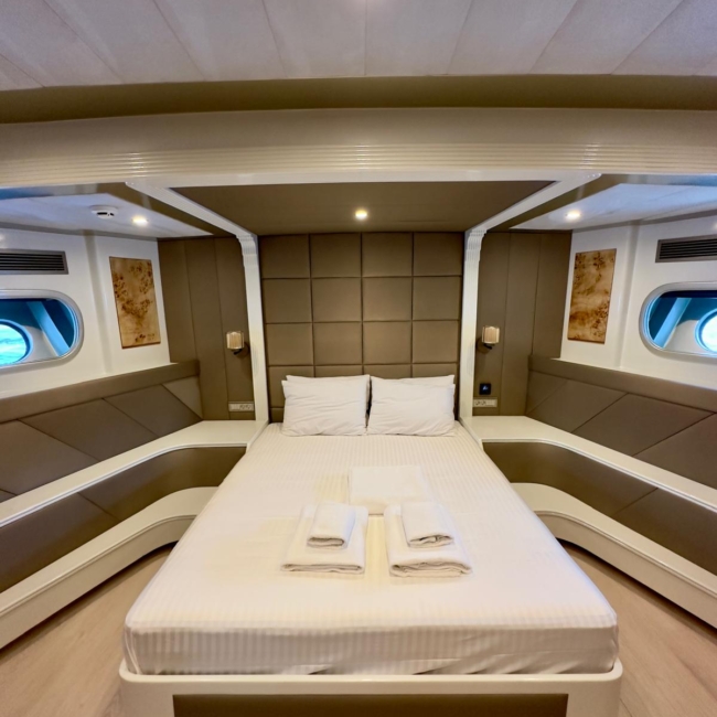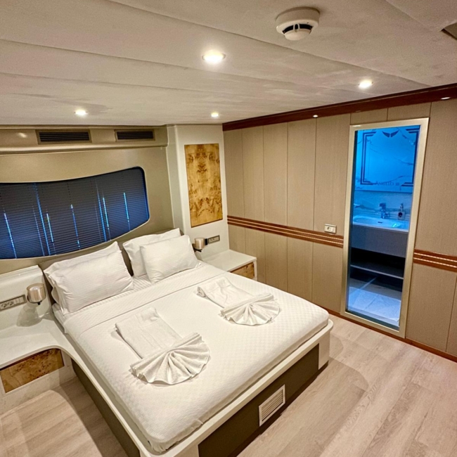 35 metre uzunluğunda ve 8,10 metre genişliğinde olan süper lüks yat, 1 Master, 2 VIP ve 2 Twin kabinde toplam 10 misafir ağırlayabilmektedir. Her kabinde özel duş ve WC imkanı bulunmaktadır. Tatiliniz boyunca konforlu bir konaklama için tüm kabinlerde ve salonda klima bulunmaktadır. Ön ve arka güvertelerin genişliği inanılmaz derecede konforlu ve rahat bir tatil fırsatı sunmaktadır. Rahat ve şık salonu ve çok çeşitli su oyuncakları ile size harika bir tatil fırsatı sunmaktadır. Yemekleriniz tam donanımlı mutfakta sizin için özel olarak hazırlanmaktadır. Arka güvertede bulunan yemek masalarında farklı lezzetlerin tadını çıkarabilirsiniz. Siz değerli misafirlerimiz için yeterli güneşlenme alanı ve minderler bulunmaktadır. Yatımızın mürettebatı kaptan, aşçı, hostes ve 2 denizci olmak üzere 5 personel ile hizmetinizdedir.