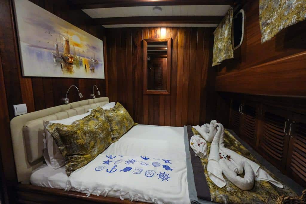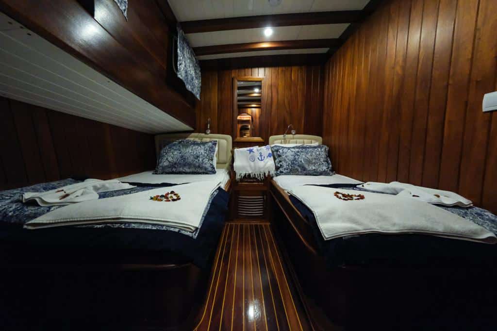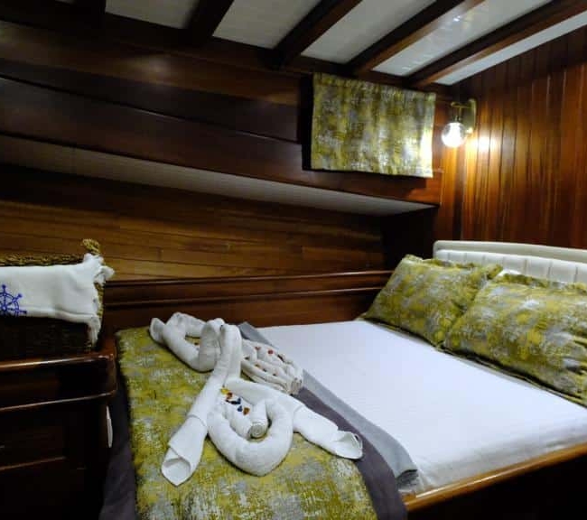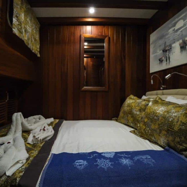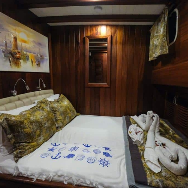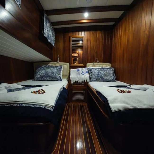 Gulet Arma 26 metre uzunluğunda 1 Master, 3 double, 1 twin olmak üzere toplam 5 kabin.