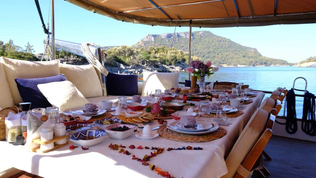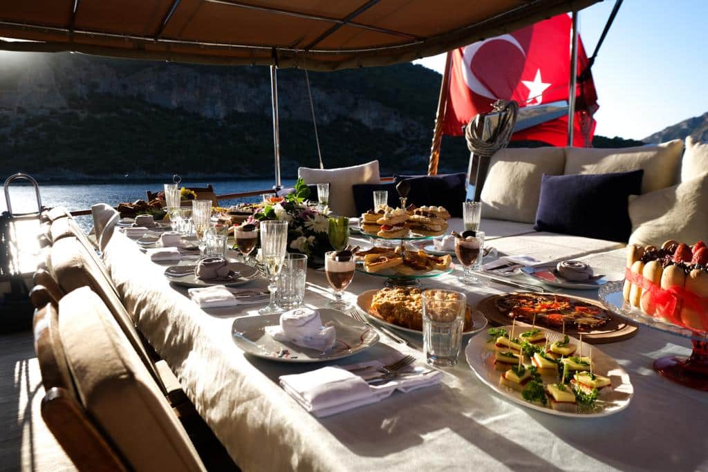 Zemin tik ağacı, arka güvertede yemek masası ve oturma alanı, ön güvertede oturma alanı ve masa, güneşlenme minderleri, deniz merdiveni, güvertede duş.