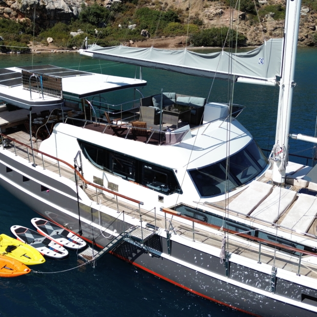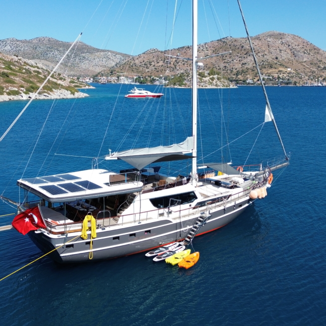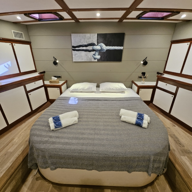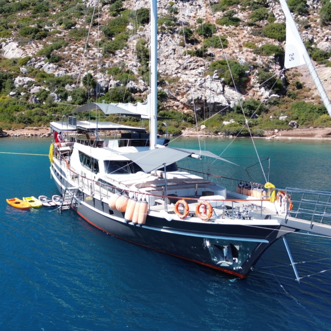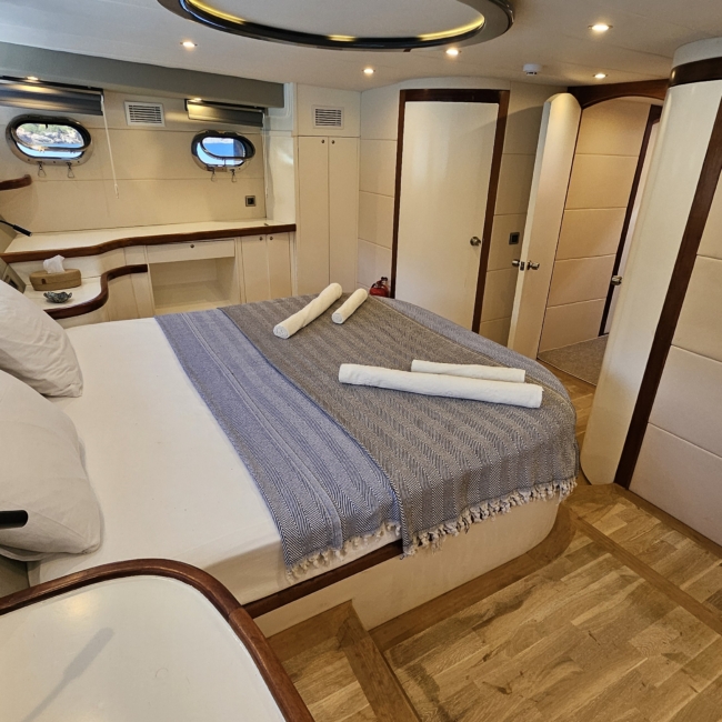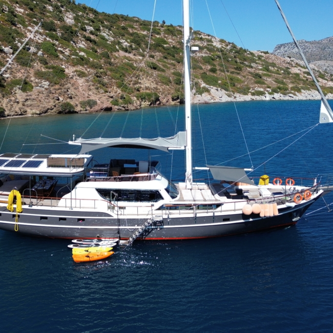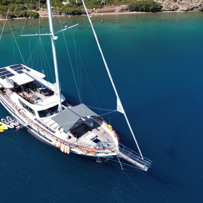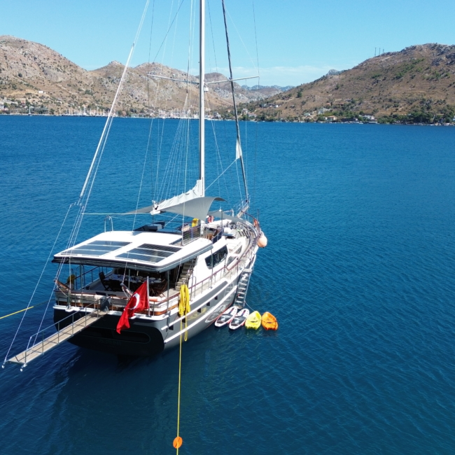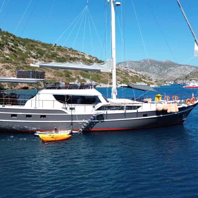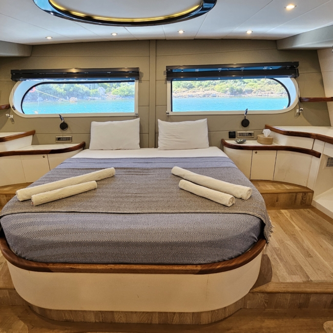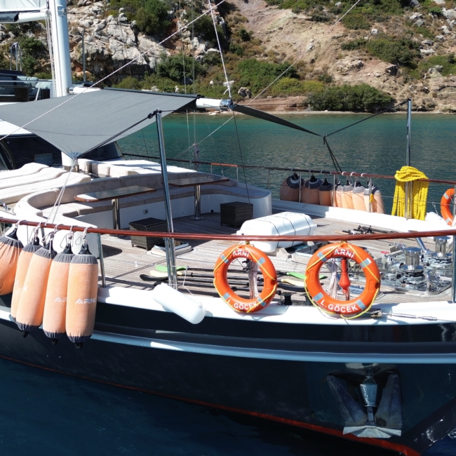 Gulet Arni was built in 2023 and docked in Göcek (Türkiye). Of course, the yacht is also available for you in other cities upon request. The yacht has a length of 24 m, a width of 6.5 m and a draft of 2.7 m. Arni is designed for up to 8 people with 4 cabins and is suitable for a variety of day trips. There are a total of 4 bathrooms for you and your guests. The yacht has 2 engines, each with a power of 404 hp (297 kW). The ship’s maximum speed is 8 knots (15 km/h). During your stay on this yacht, you will be accompanied by an experienced crew ready to meet all your needs.