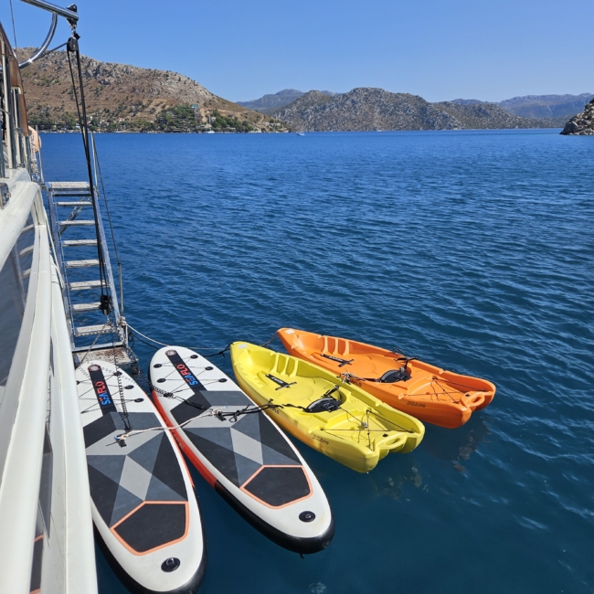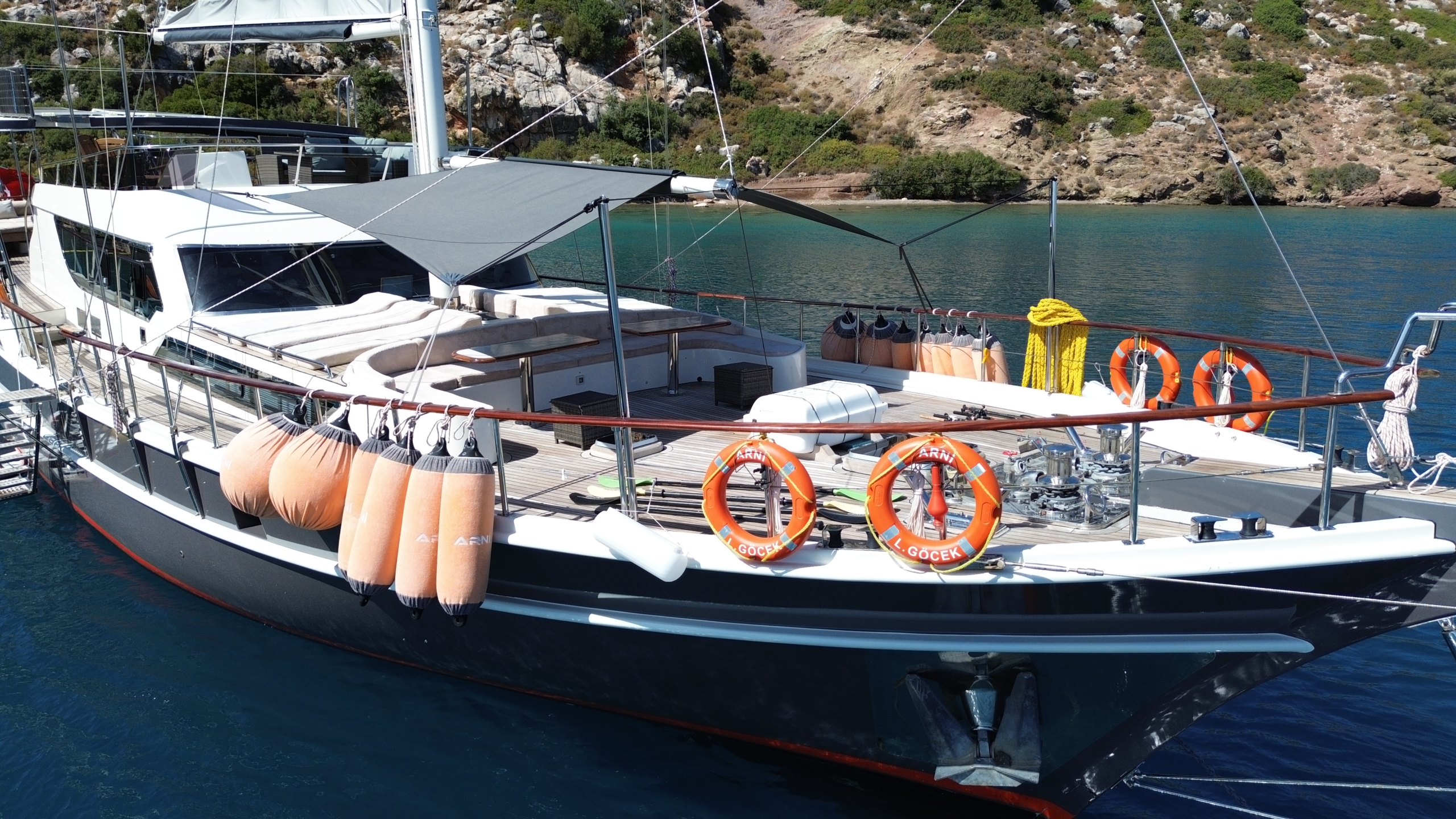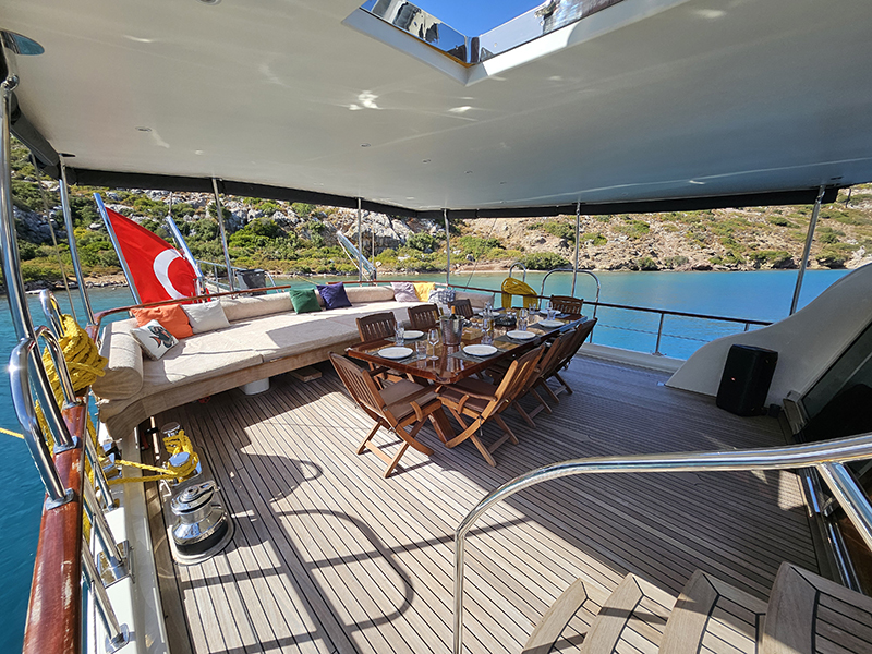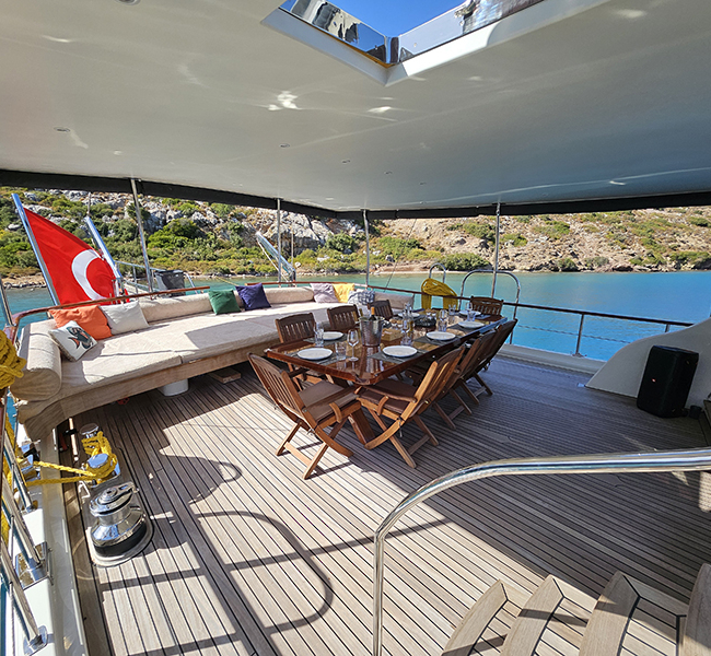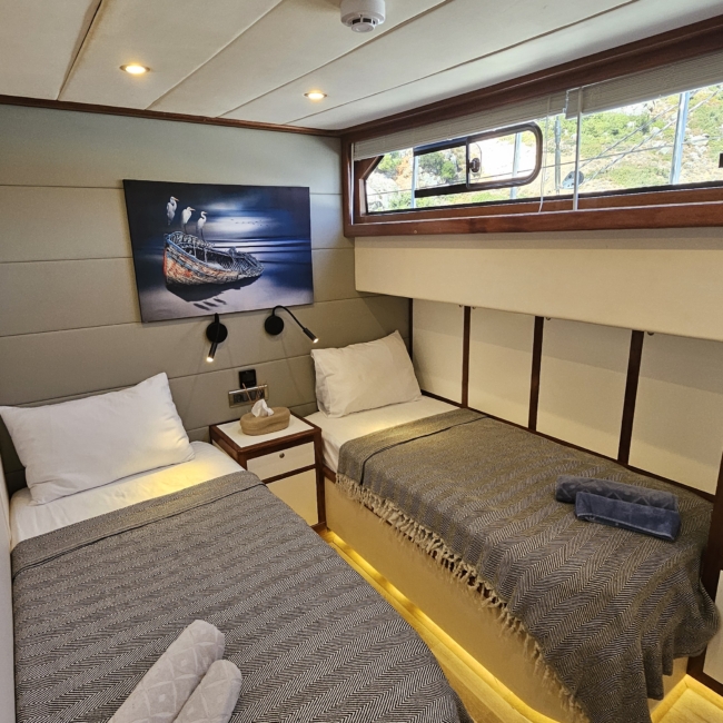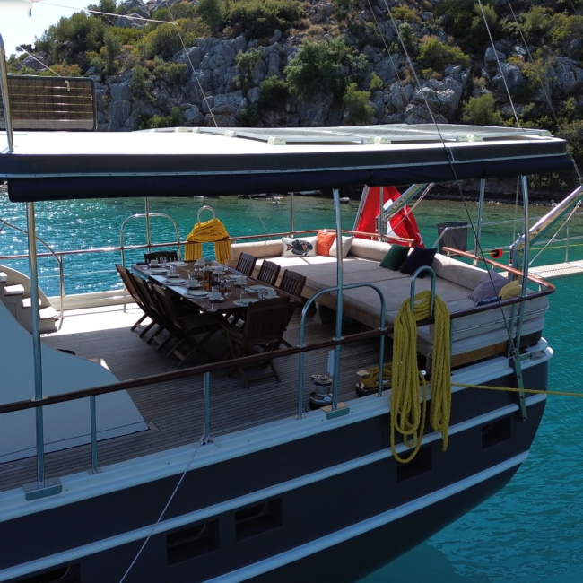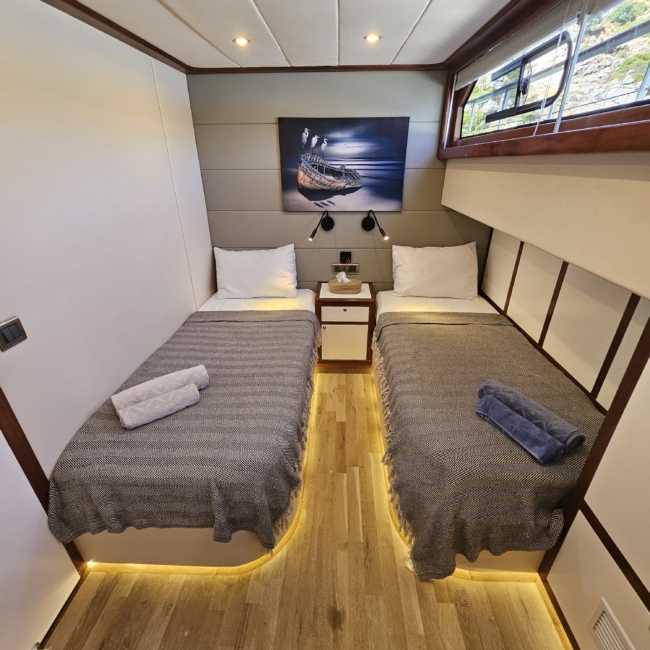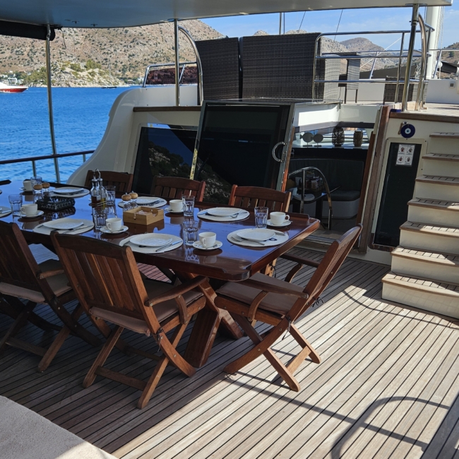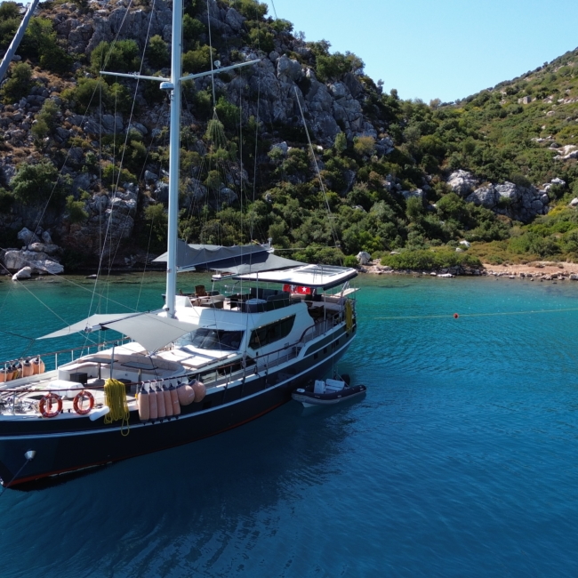 Gulet Arni was built in 2023 and docked in Göcek (Türkiye). Of course, the yacht is also available for you in other cities upon request. The yacht has a length of 24 m, a width of 6.5 m and a draft of 2.7 m. Arni is designed for up to 8 people with 4 cabins and is suitable for a variety of day trips. There are a total of 4 bathrooms for you and your guests. The yacht has 2 engines, each with a power of 404 hp (297 kW). The ship’s maximum speed is 8 knots (15 km/h). During your stay on this yacht, you will be accompanied by an experienced crew ready to meet all your needs.
