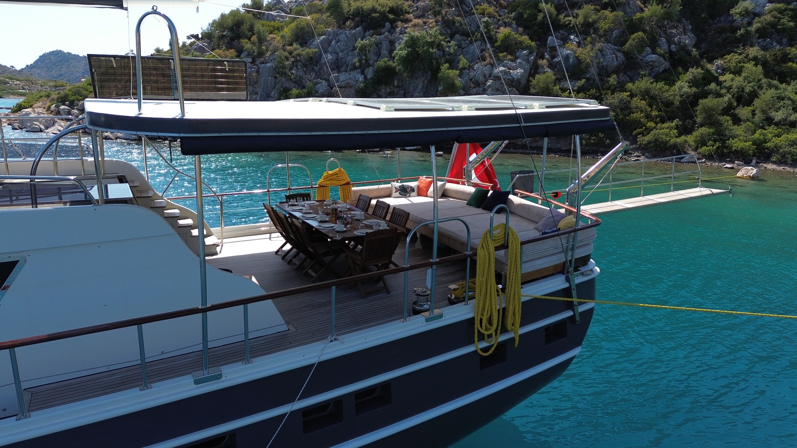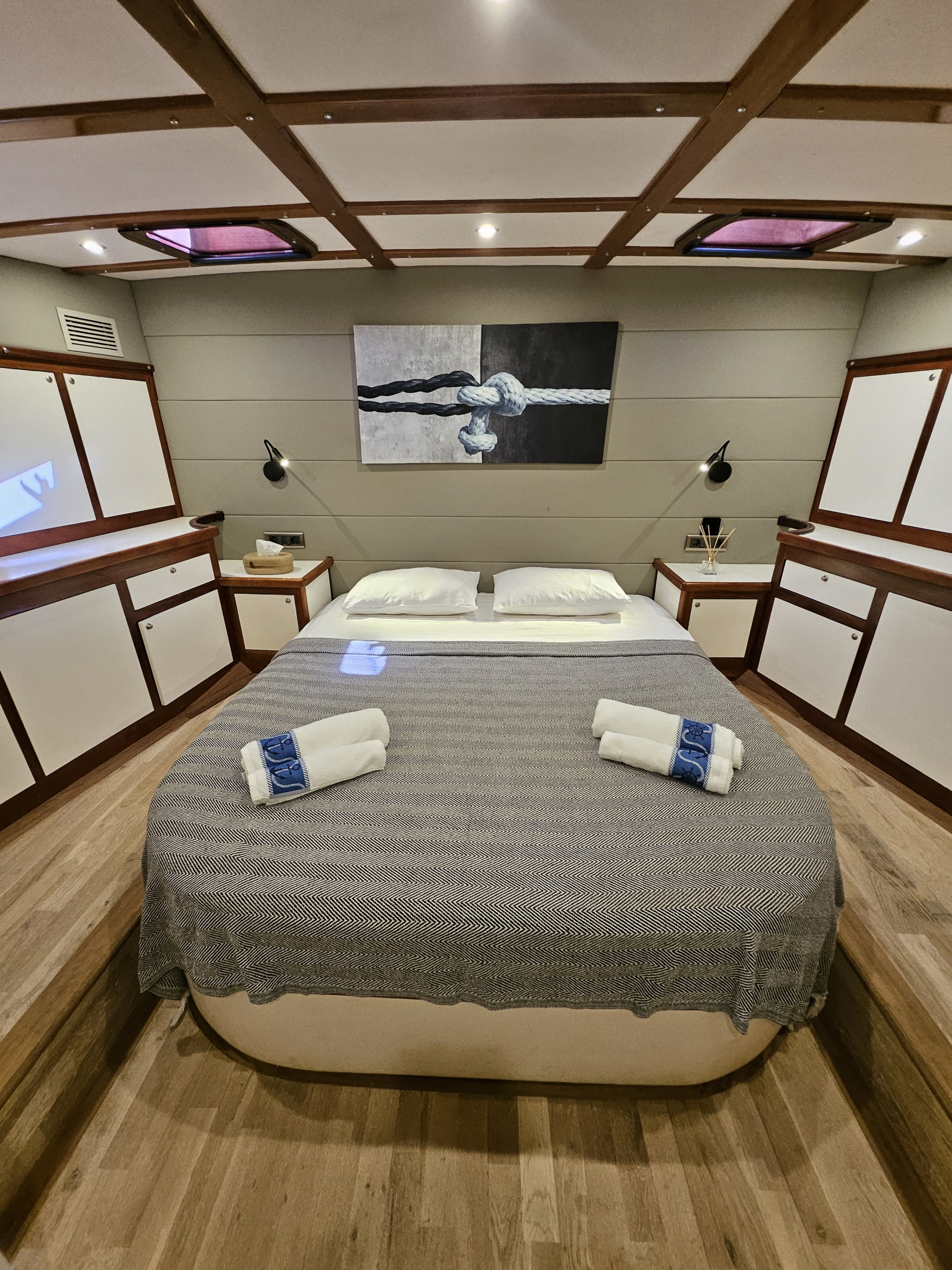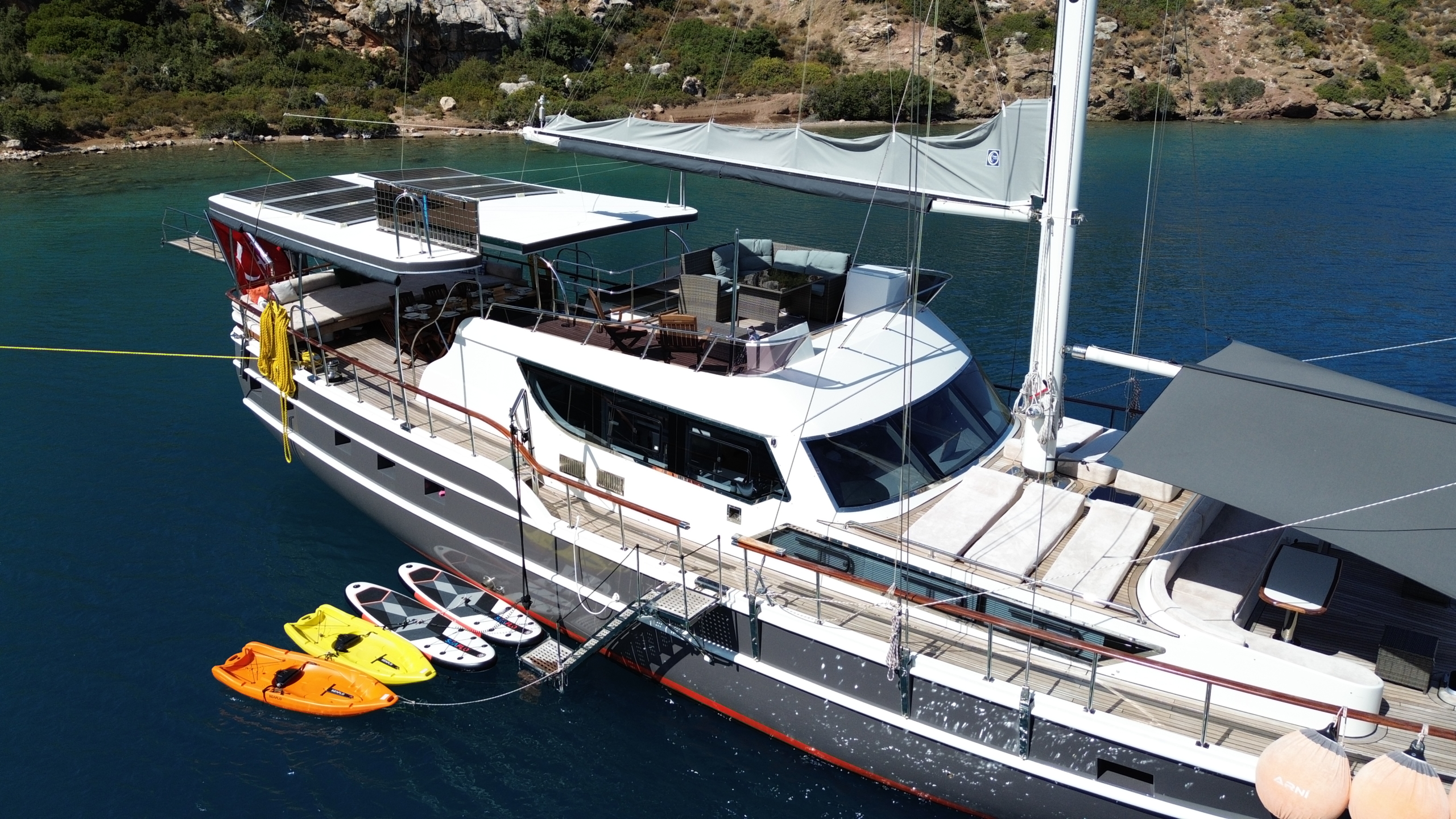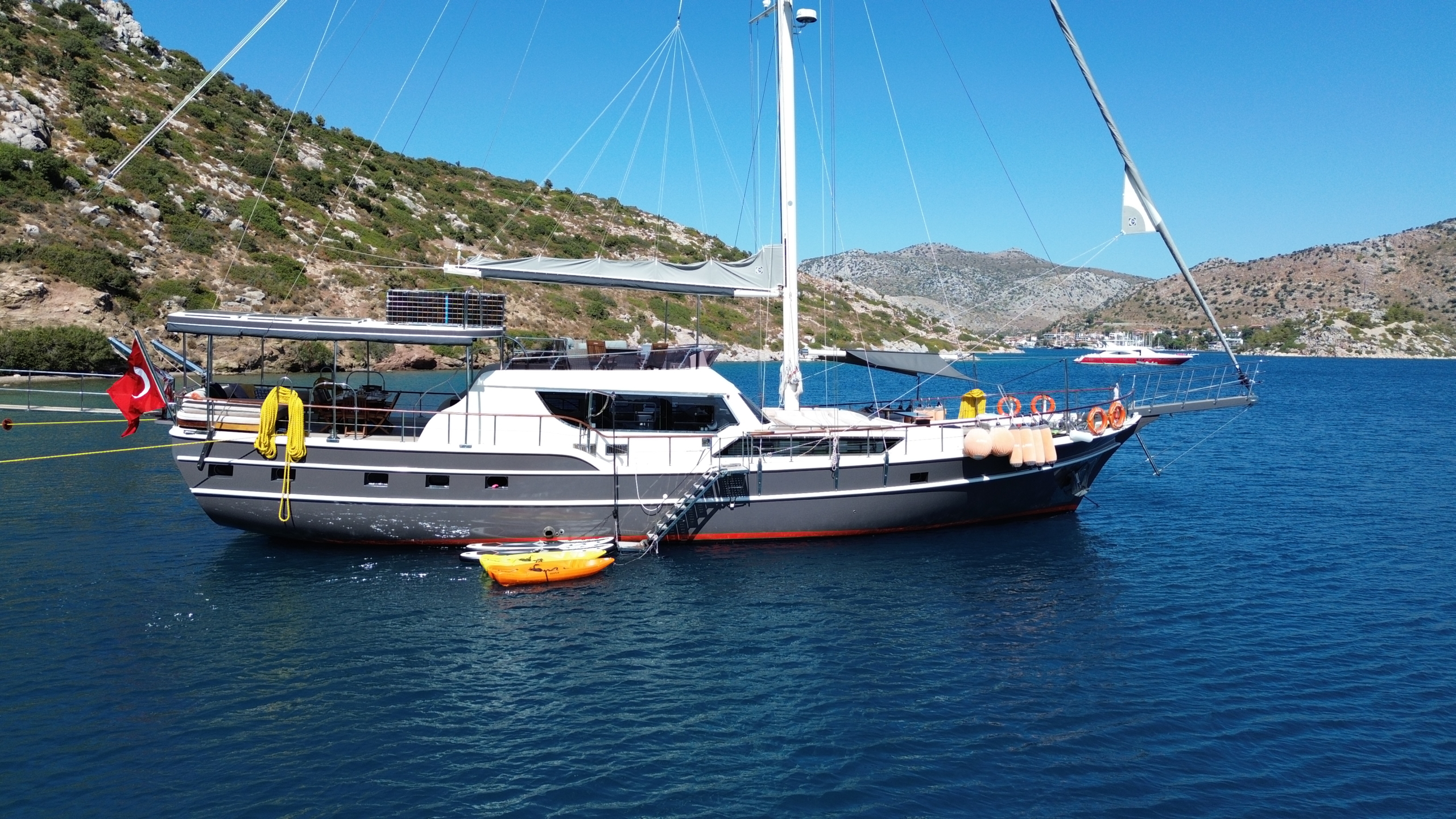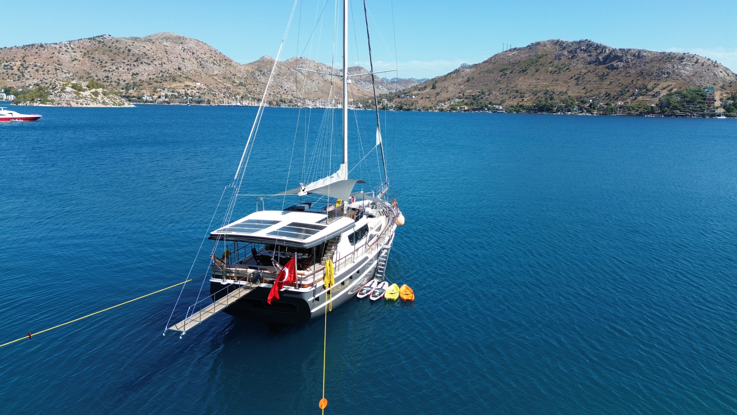 Gulet Arni was built in 2023 and docked in Göcek (Türkiye). Of course, the yacht is also available for you in other cities upon request. The yacht has a length of 24 m, a width of 6.5 m and a draft of 2.7 m. Arni is designed for up to 8 people with 4 cabins and is suitable for a variety of day trips. There are a total of 4 bathrooms for you and your guests. The yacht has 2 engines, each with a power of 404 hp (297 kW). The ship’s maximum speed is 8 knots (15 km/h). During your stay on this yacht, you will be accompanied by an experienced crew ready to meet all your needs.
