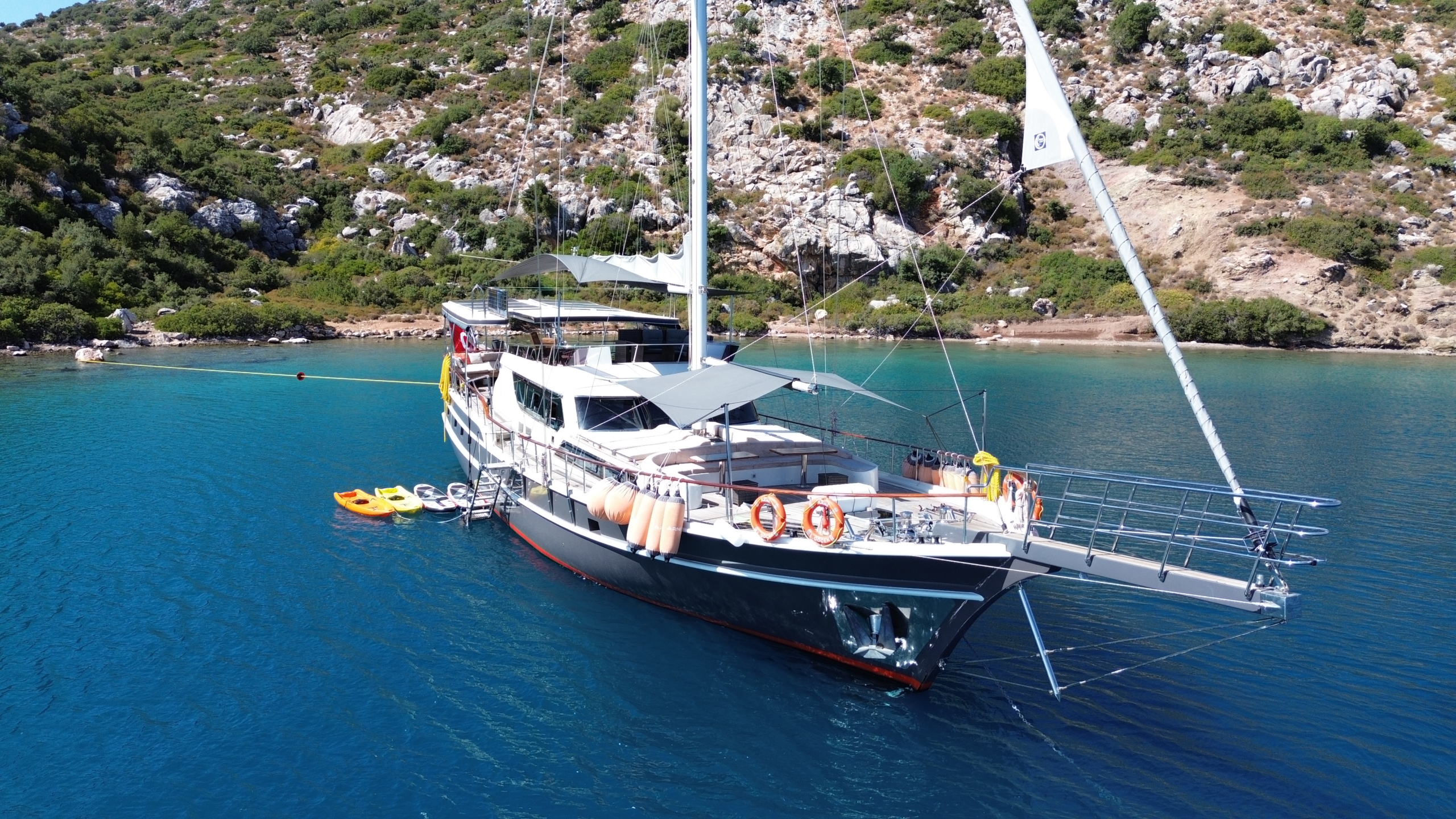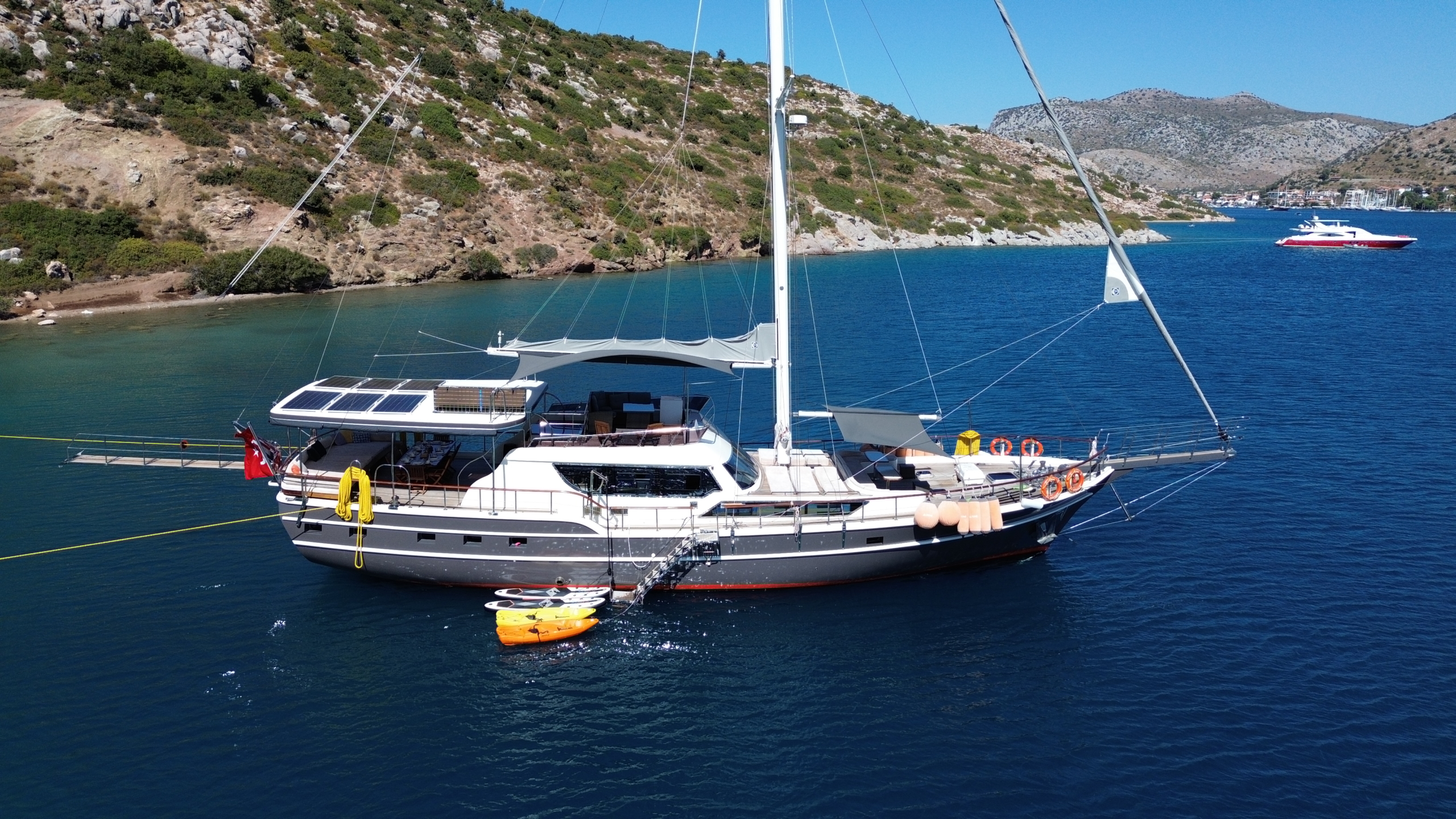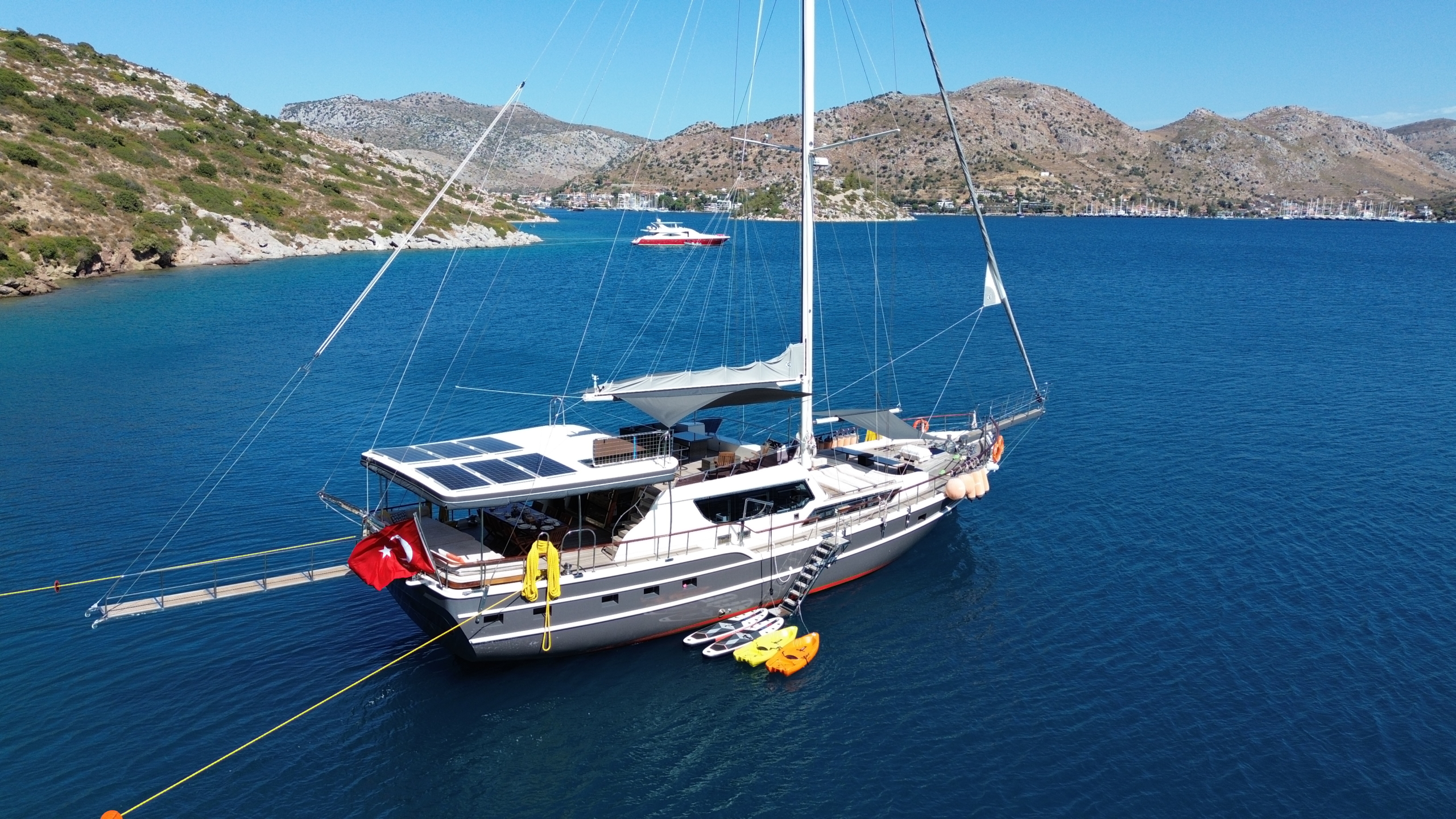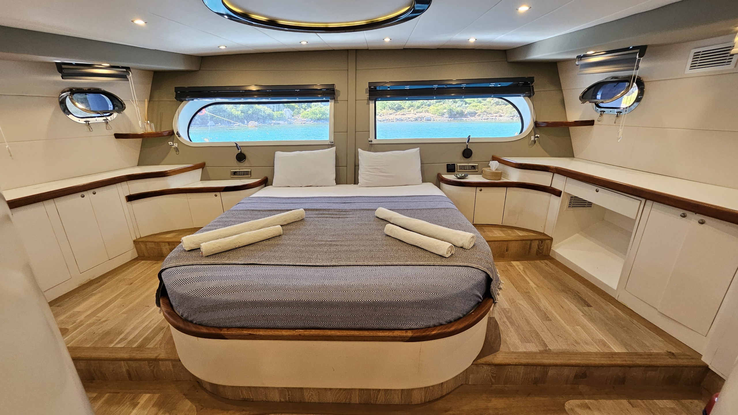 Gulet Arni was built in 2023 and docked in Göcek (Türkiye). Of course, the yacht is also available for you in other cities upon request. The yacht has a length of 24 m, a width of 6.5 m and a draft of 2.7 m. Arni is designed for up to 8 people with 4 cabins and is suitable for a variety of day trips. There are a total of 4 bathrooms for you and your guests. The yacht has 2 engines, each with a power of 404 hp (297 kW). The ship’s maximum speed is 8 knots (15 km/h). During your stay on this yacht, you will be accompanied by an experienced crew ready to meet all your needs.