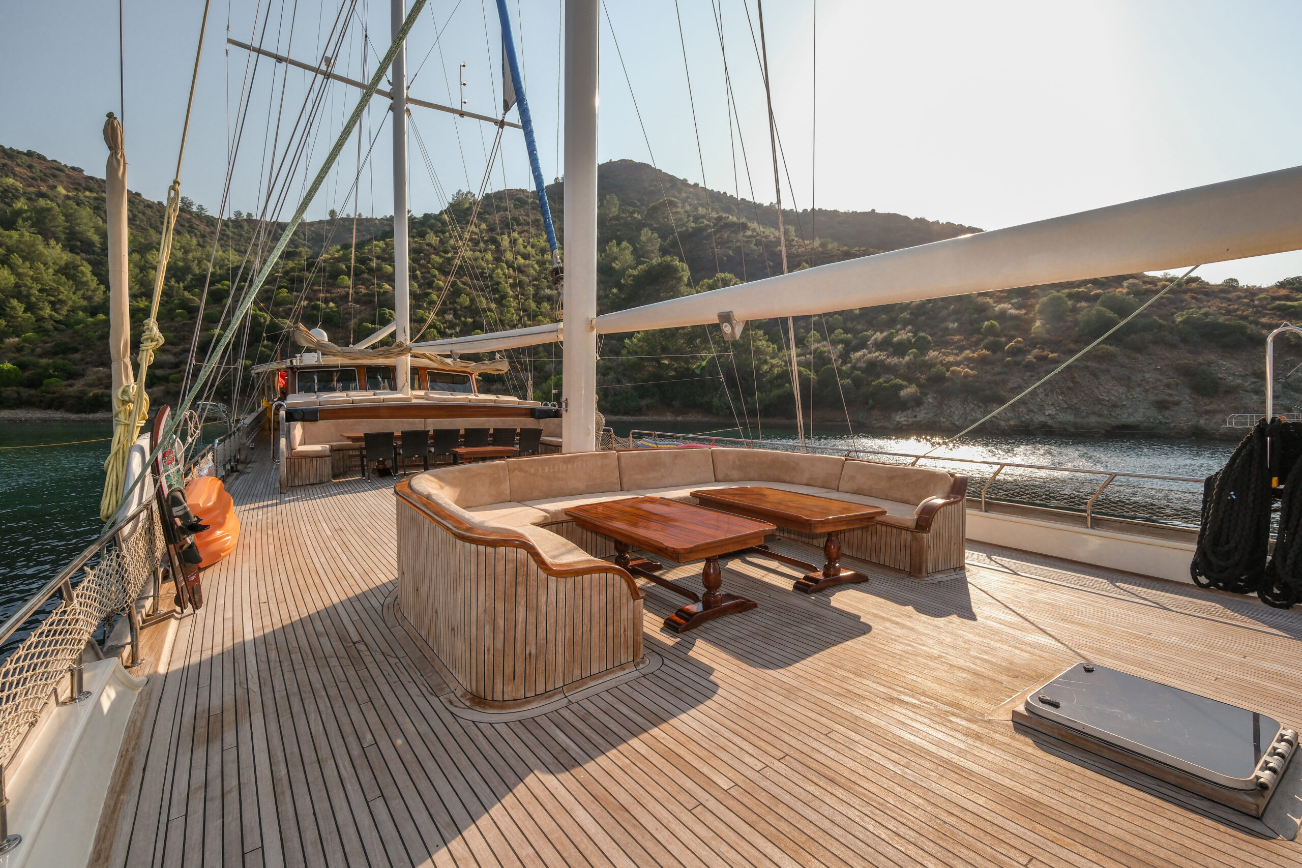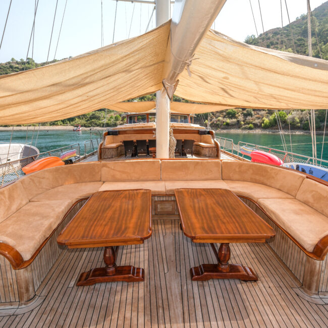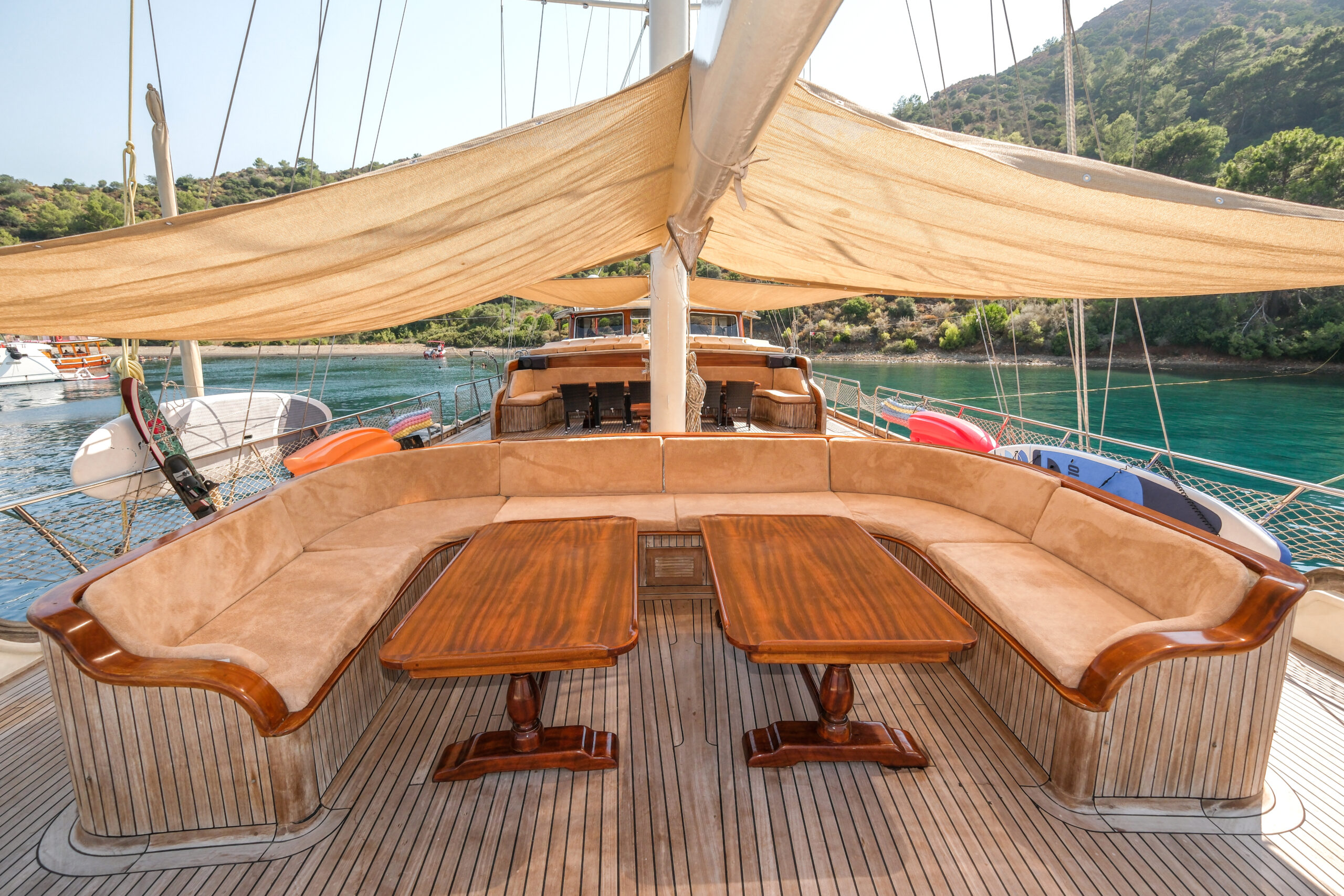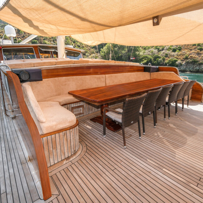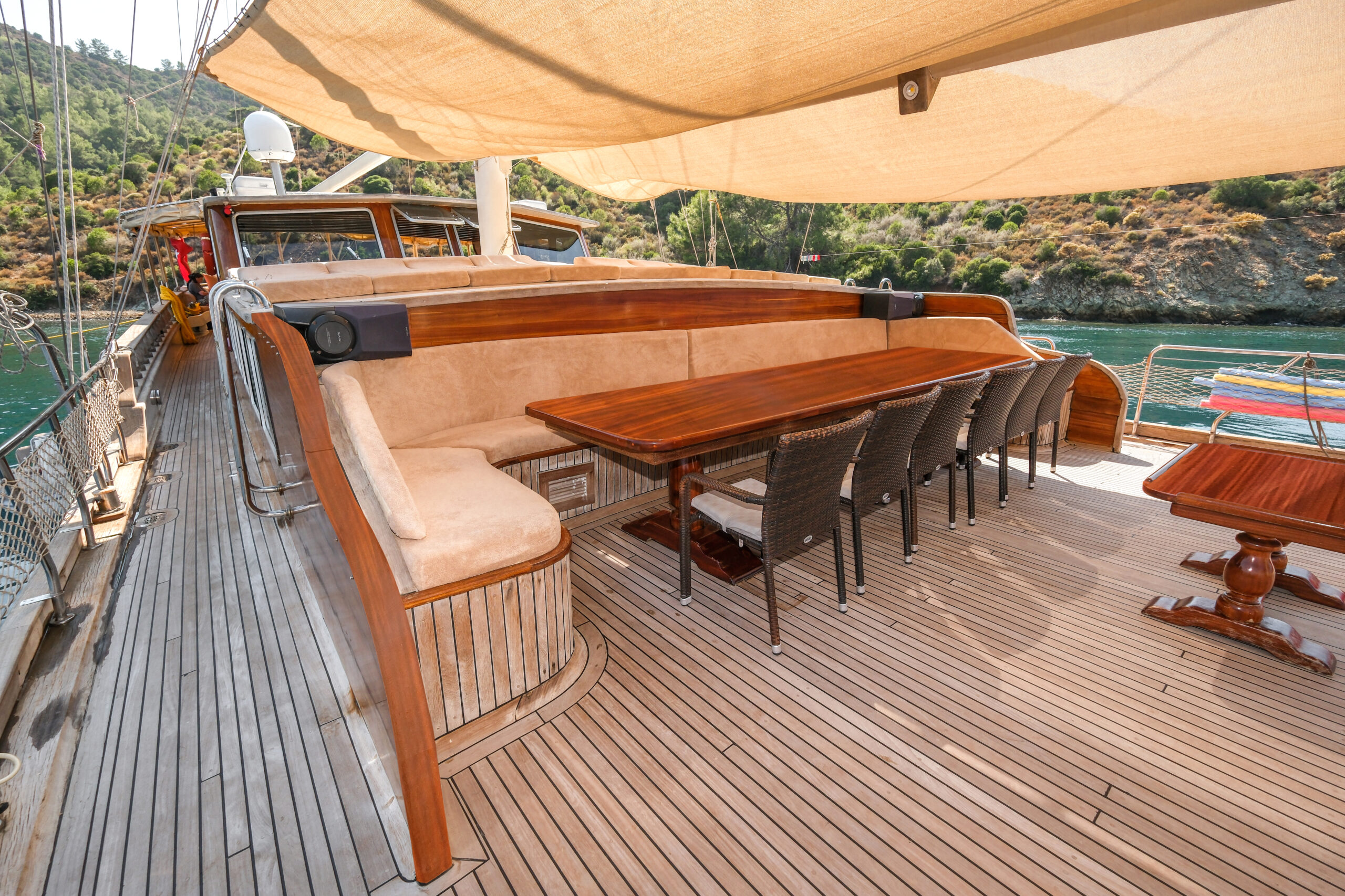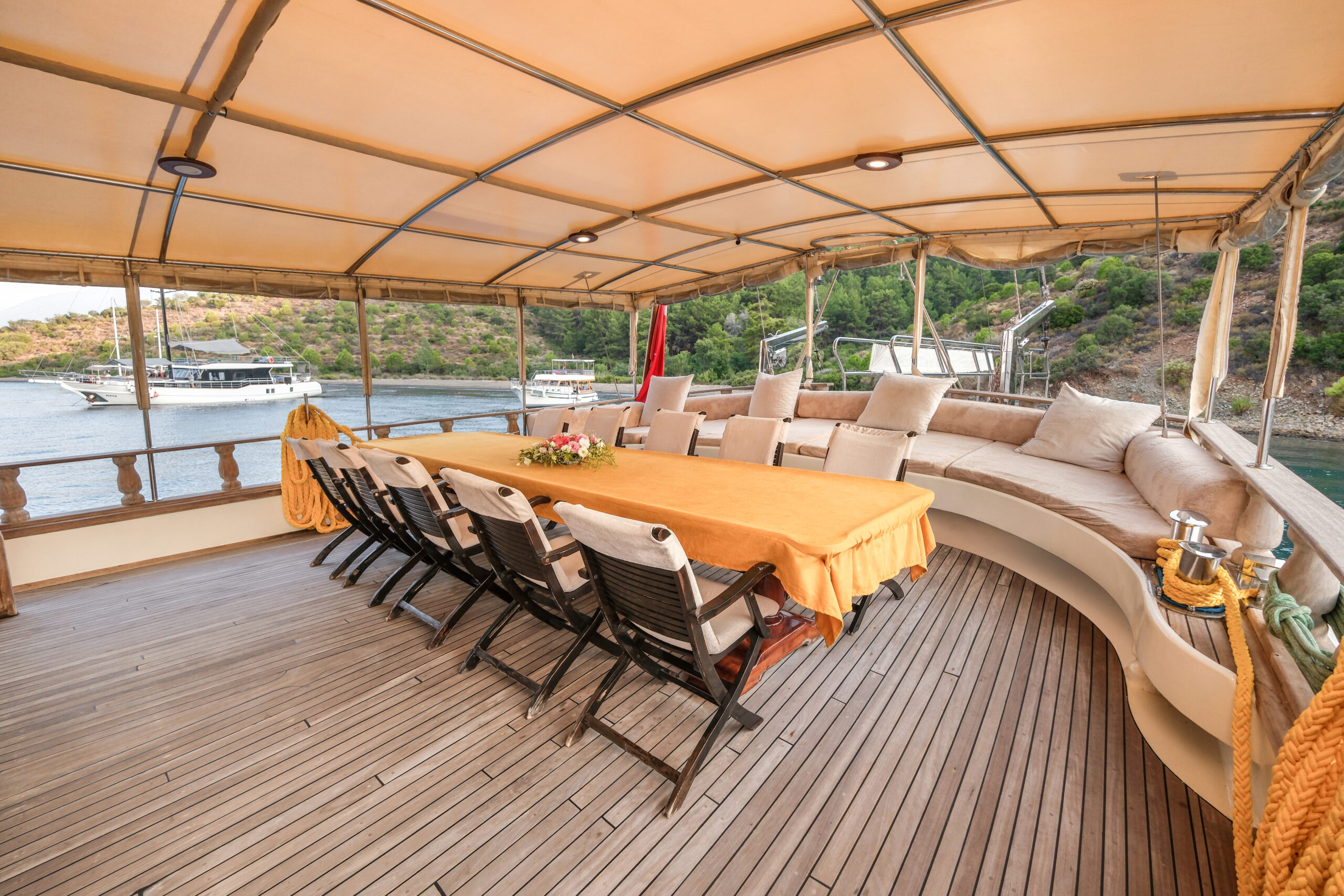 Tam donanımlı mutfağımızda özenle hazırlanan yemeklerimizi kıç güvertede veya salonda bulunan şık sofralarımızda tadabilirsiniz. Güvertede geniş minderli oturma alanı, güneşlenme alanı ve güneşlenme minderleri yeterli miktarda mevcuttur.