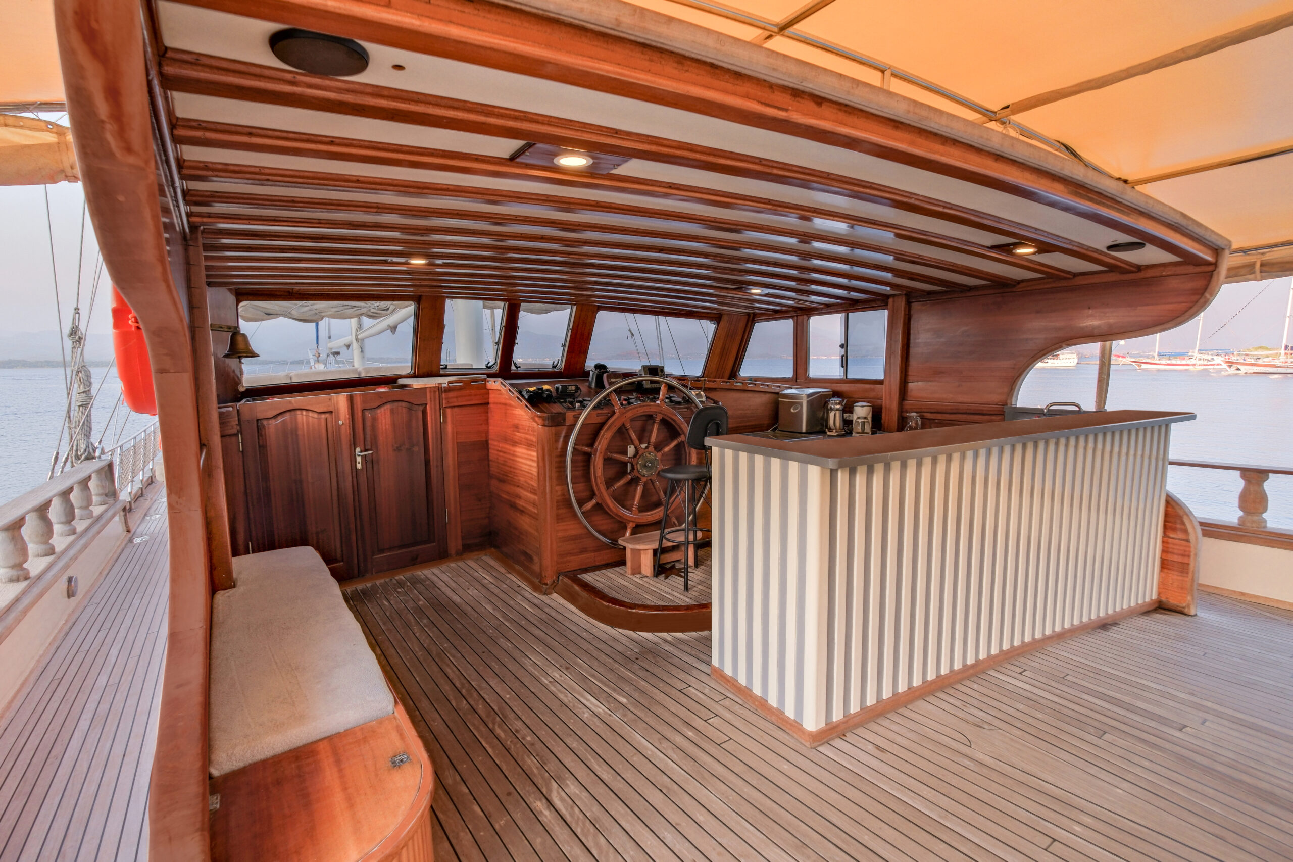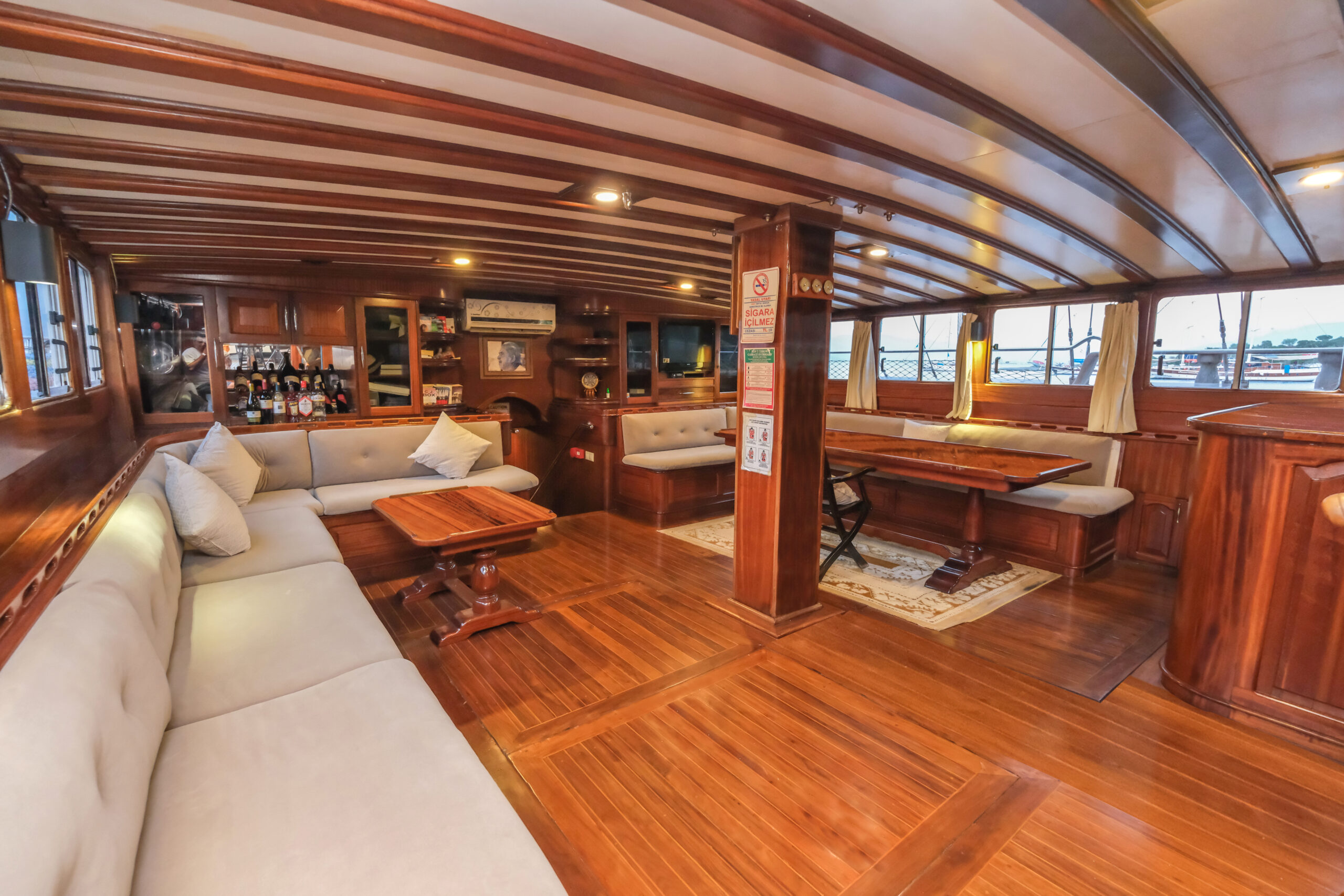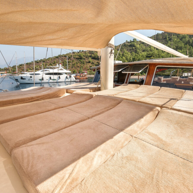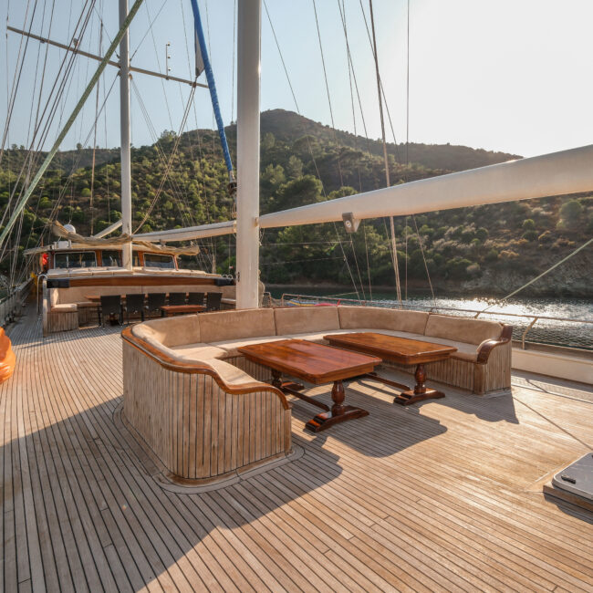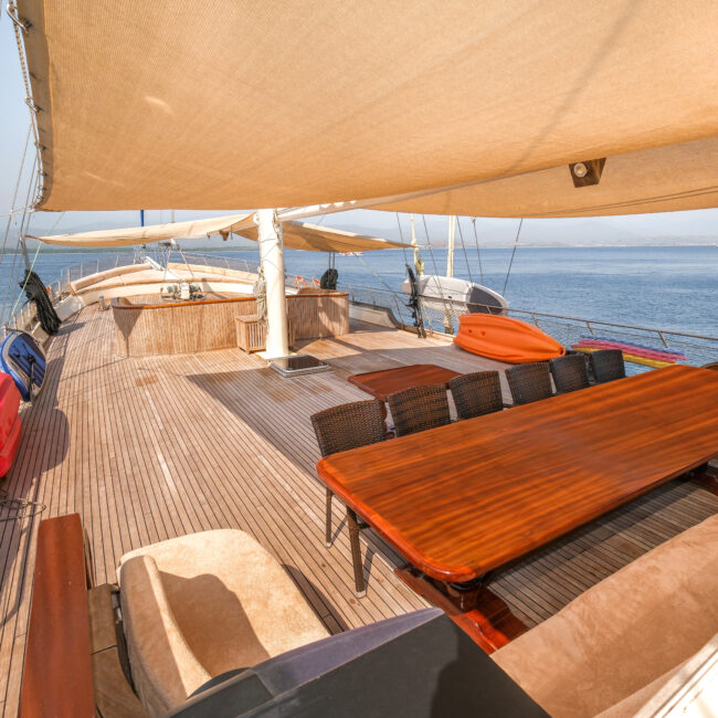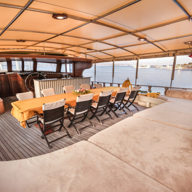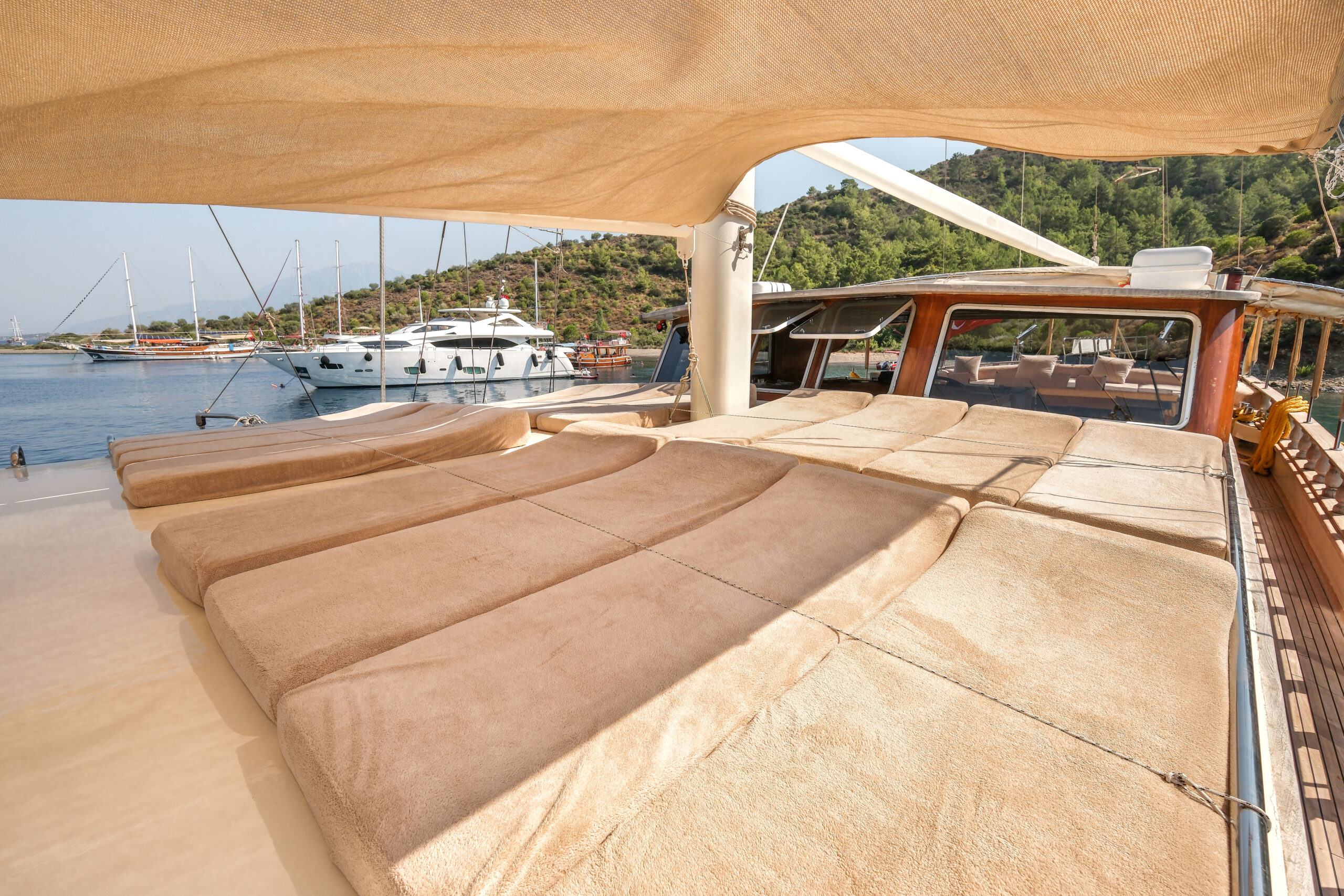 Tam donanımlı mutfağımızda özenle hazırlanan yemeklerimizi kıç güvertede veya salonda bulunan şık sofralarımızda tadabilirsiniz. Güvertede geniş minderli oturma alanı, güneşlenme alanı ve güneşlenme minderleri yeterli miktarda mevcuttur.