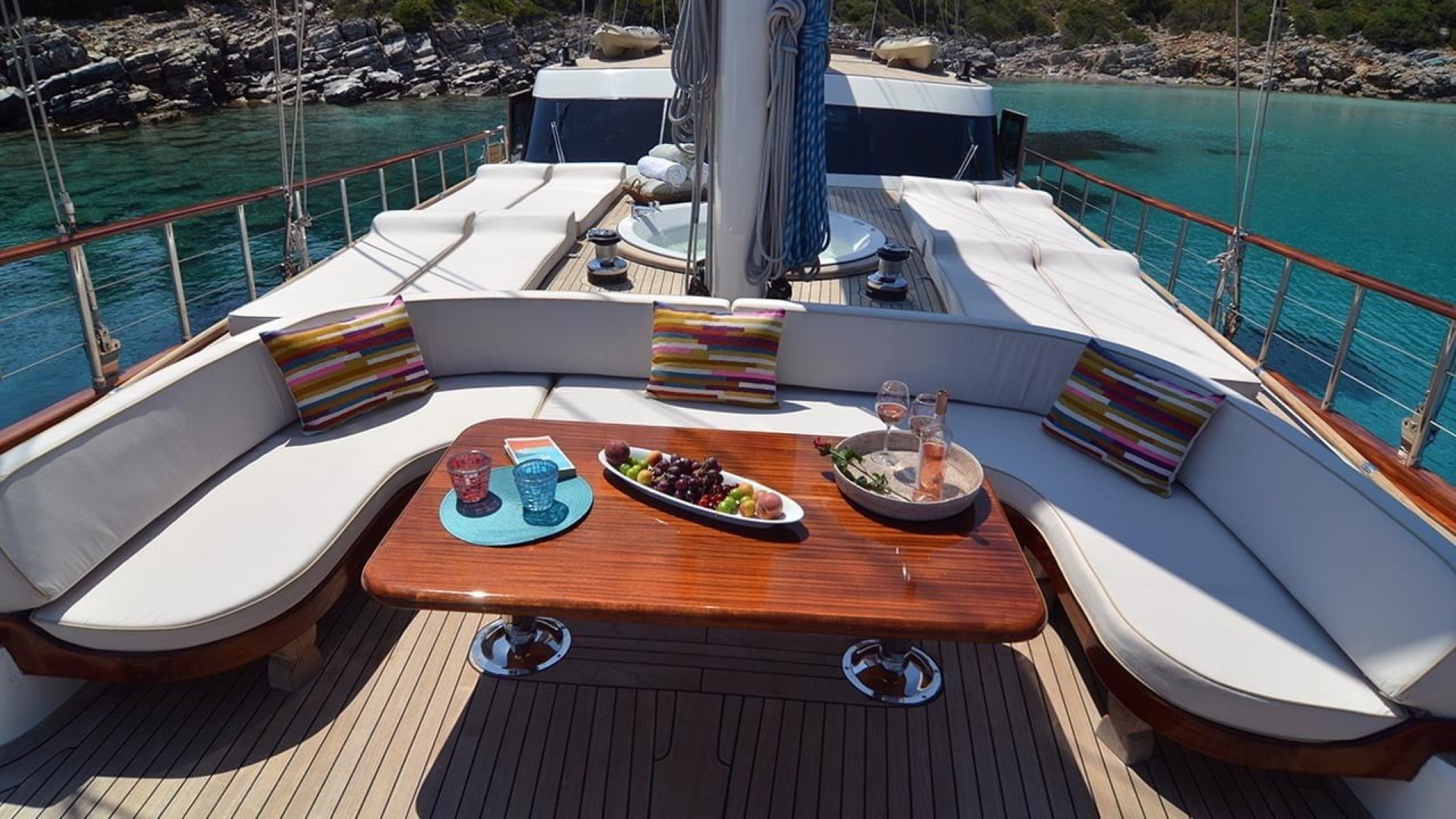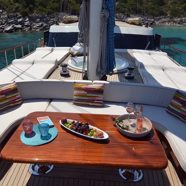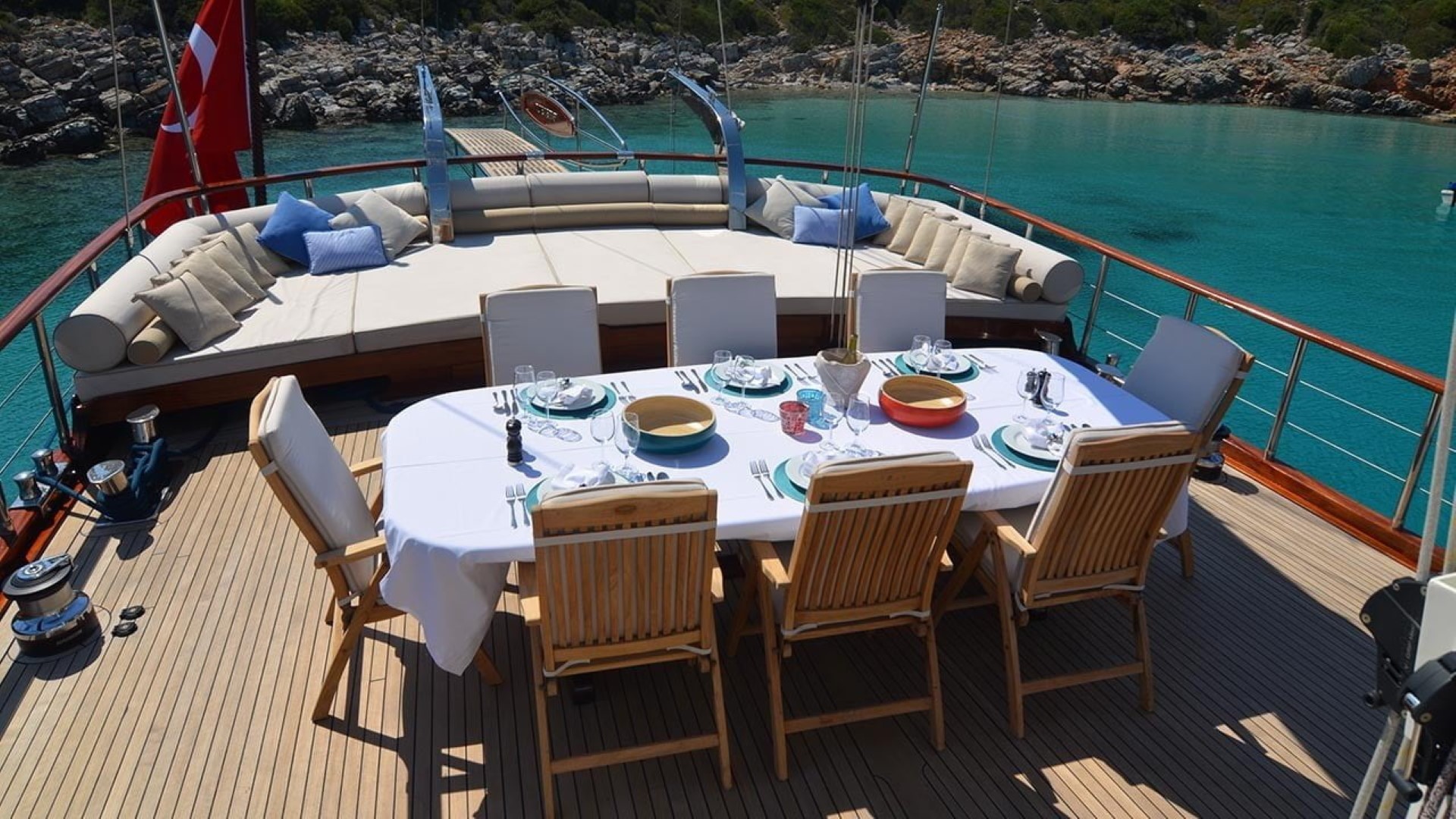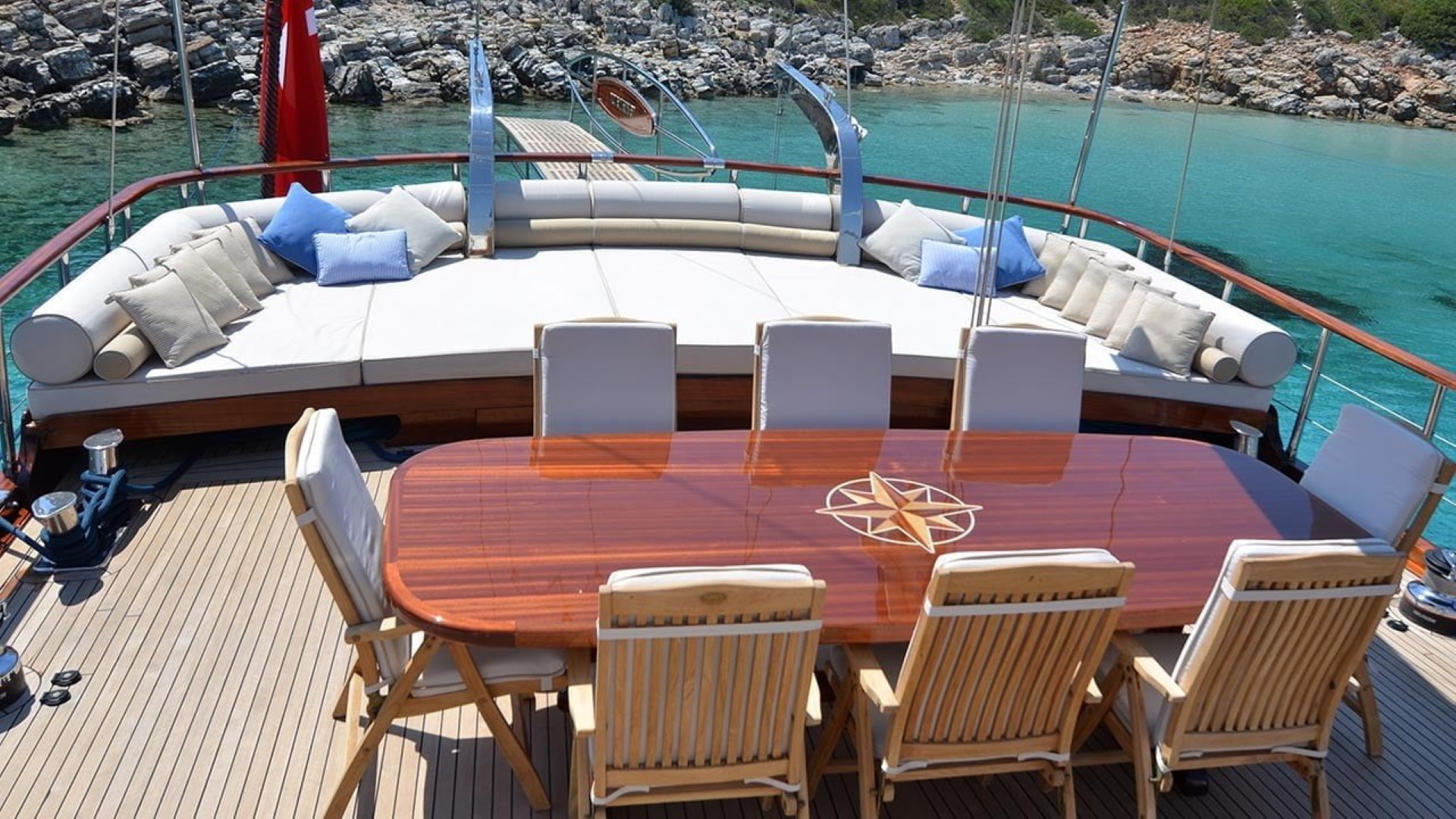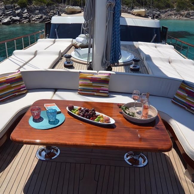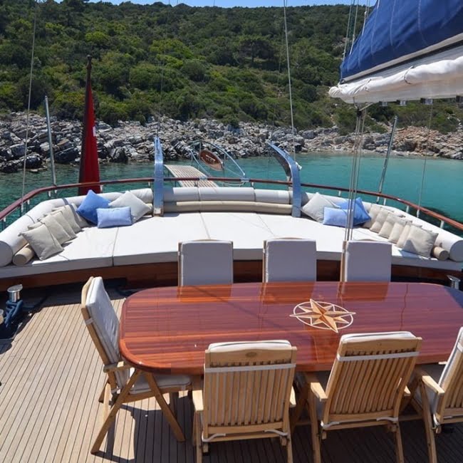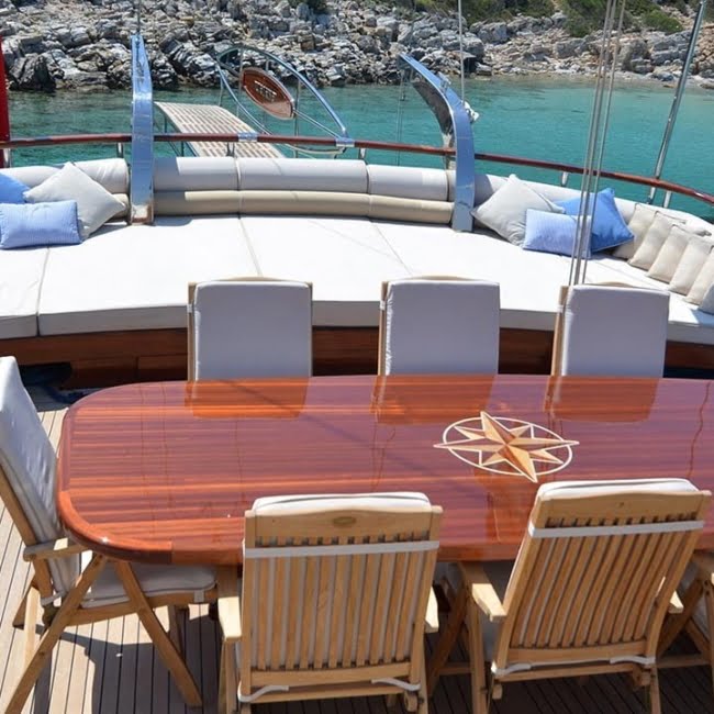 Modern bir zevkle dizayn edilmiş guletimizde yeteri kadar güneşlenme alanı ve şezlong bulunmaktadır.