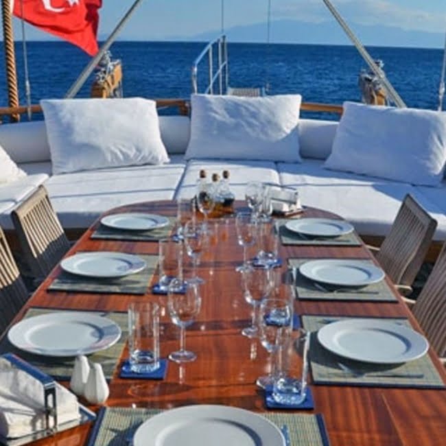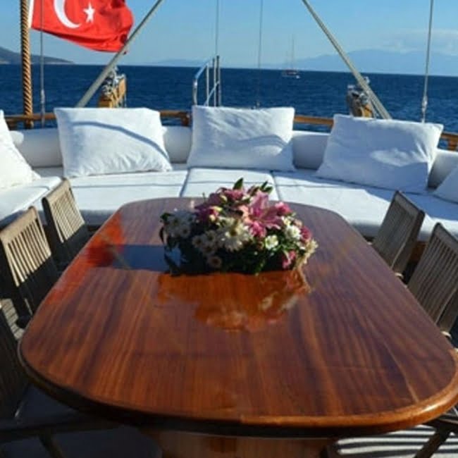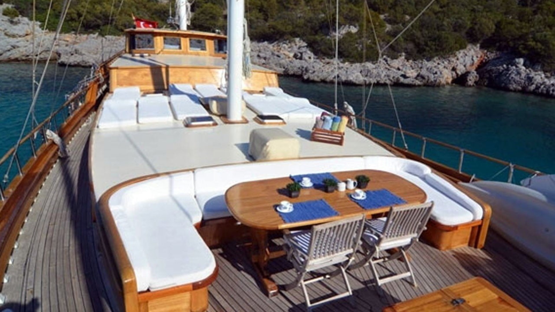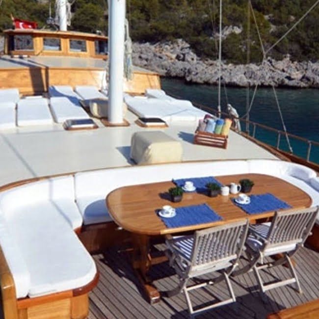 Ön güvertede bulunan güneşlenme alanı ve güneşlenme minderleri yeterli miktarda mevcuttur. Salonda ve Kıç Güvertede bulunan yemek masalarında tam donanımlı mutfağımızda özenle hazırlanmış yemekleri yiyebilirsiniz. Kıç güvertede bulunan geniş oturma minderleriyle ön planda olan gulette konforunuz için her imkanı sunuyoruz. Mavi yolculuğunuzda, iyi tatiller dileriz.