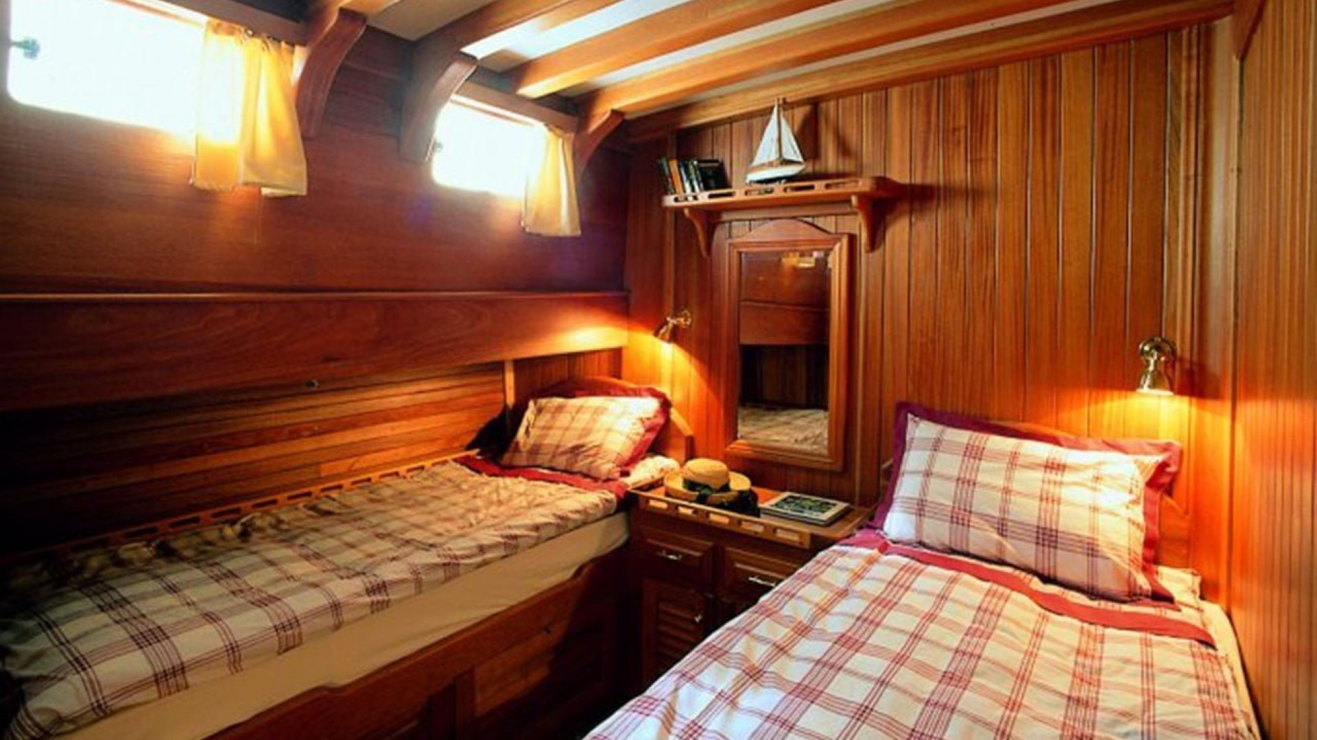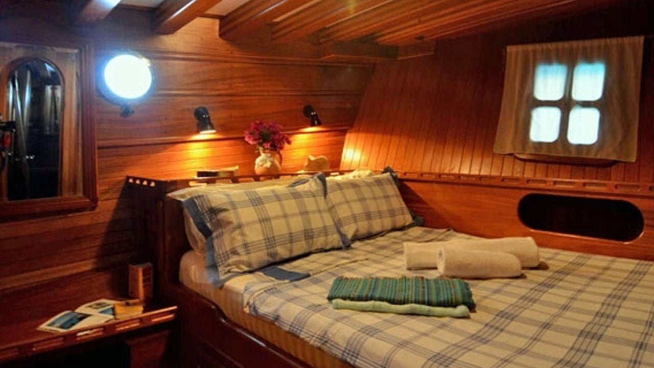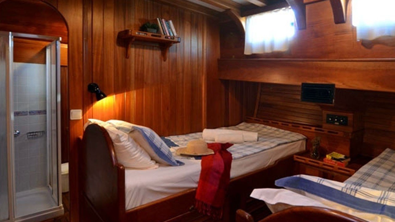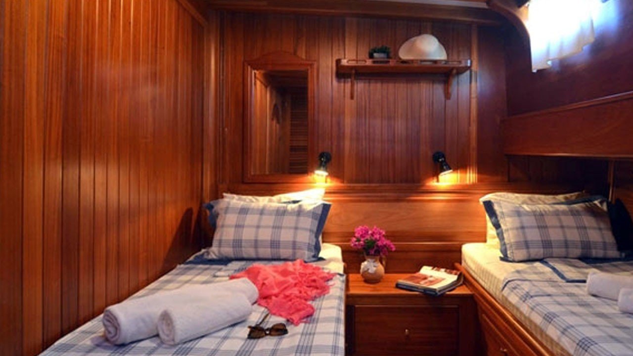 2000 yılında 28 m uzunluğunda, 7 m genişliğinde yapılmıştır. Her yıl bakımları yeniden yapılan teknemizin 2 Double Kabin ve 4 Convertible Twins Kabin olmak üzere toplam 6 adet kabinden oluşmaktadır. Misafirlerimizin konforu ve rahatlığı açısından tüm kabinlerimizde Klima, Duş Ünitesi ve Wc mevcuttur. Mürettebatın kendine ait yaşam alanları mevcuttur. Mürettebat, günlük tekne bakımlarını ve servis hazırlıklarını organize edip bitirdikten sonra misafirlerimizin rahatı için kendi kamaralarına geçmektedir.