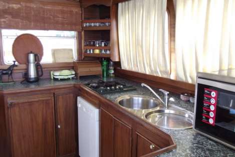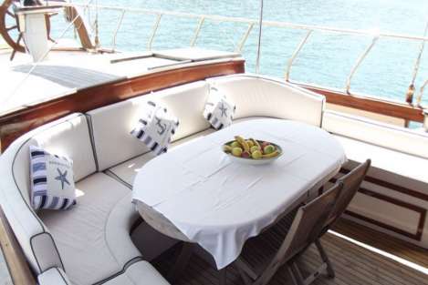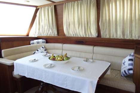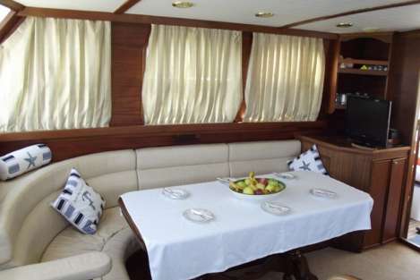 Teknemizin salon bölümünde bulunan TV, müzik sistemi ve DVD player ile siz misafirlerimizin eğlenceli ve hoş vakit geçirilmesi amaçlanmıştır. Bunun yanı sıra dilediğiniz zaman güvertede güneşin tadını çıkarabilir ve ruhunuzu huzurla doldurabilirsiniz.