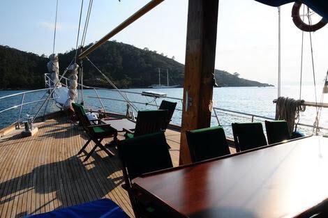 24 metre uzunluğunda ve 7,20 metre genişliğindeki Gulet tipi teknemiz Cemal Efe, sizi, ailenizi ve arkadaşlarınızı kısacası maviyi seven herkesi bekliyor!