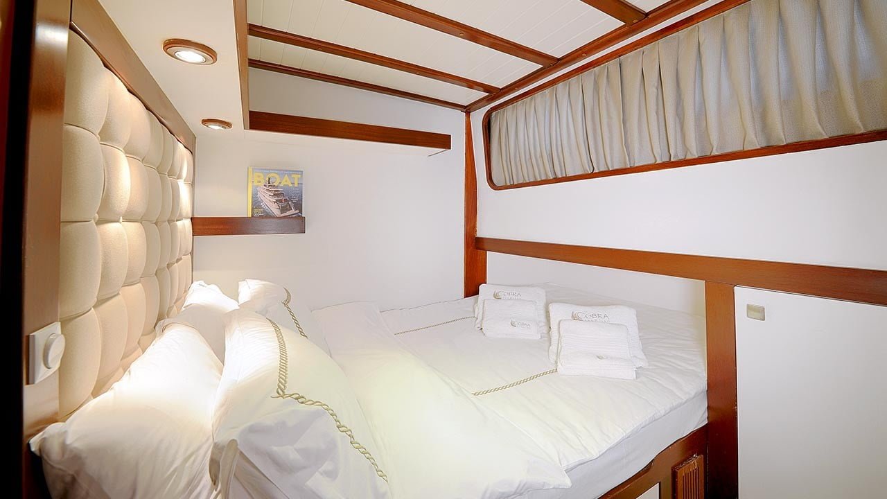 Gulet Cobra 3 Lüks kategoride yer alan teknemiz, 24 metre uzunluğundadır. 2010 yılında komple revize edilen teknemiz, mavi yolculuk tatil planlarınızda 4 konforlu kabiniyle hizmet vermektedir. 285 m² yelken donanımı bulunan teknemizde, hava ve deniz koşulları uygun olduğunda yelken seyri de yapabilirsiniz. Deneyimli ve güler yüzlü mürettebatımız misafir memnuniyeti odaklı hizmet sunmaktadır. Cobra 3 Yatı.