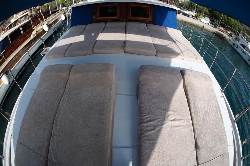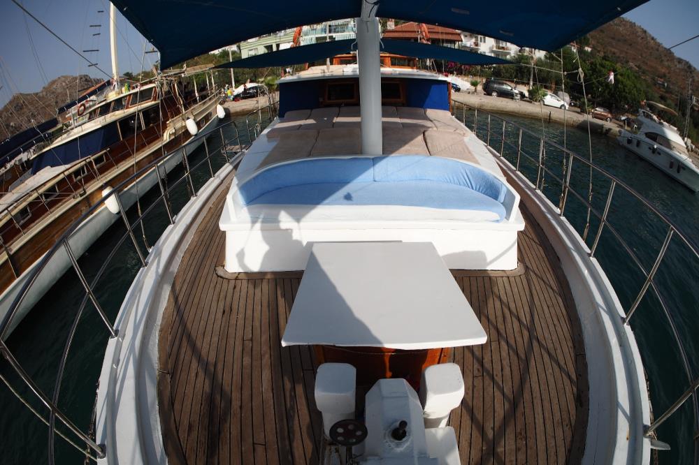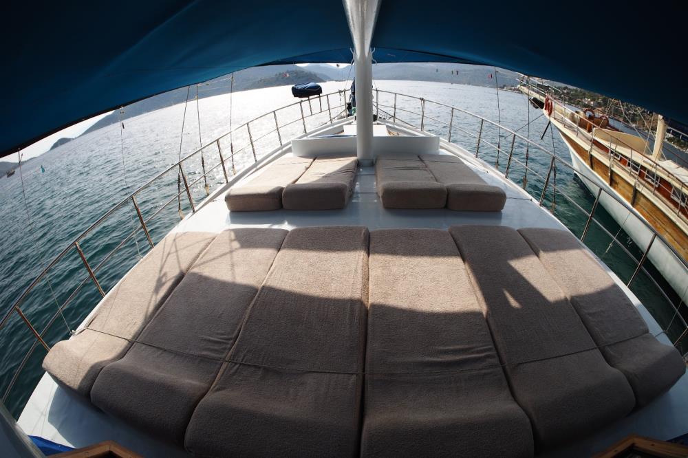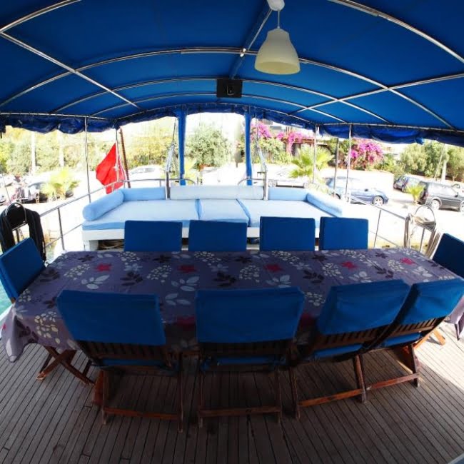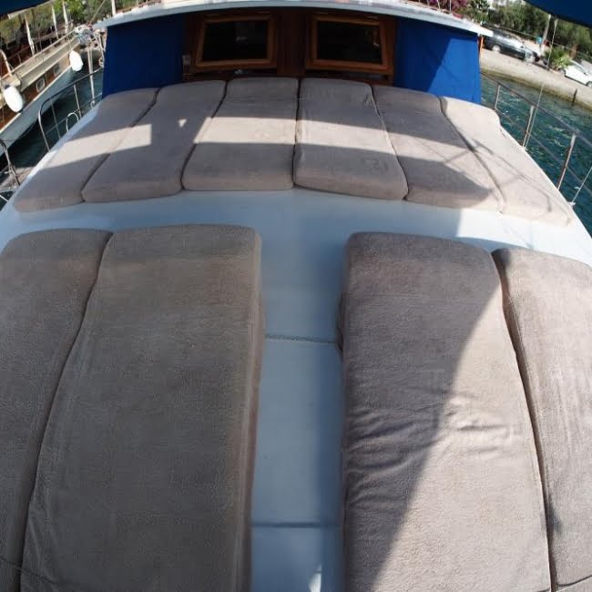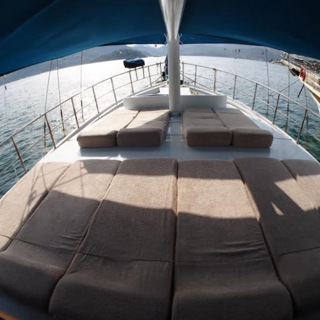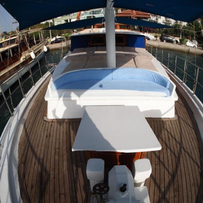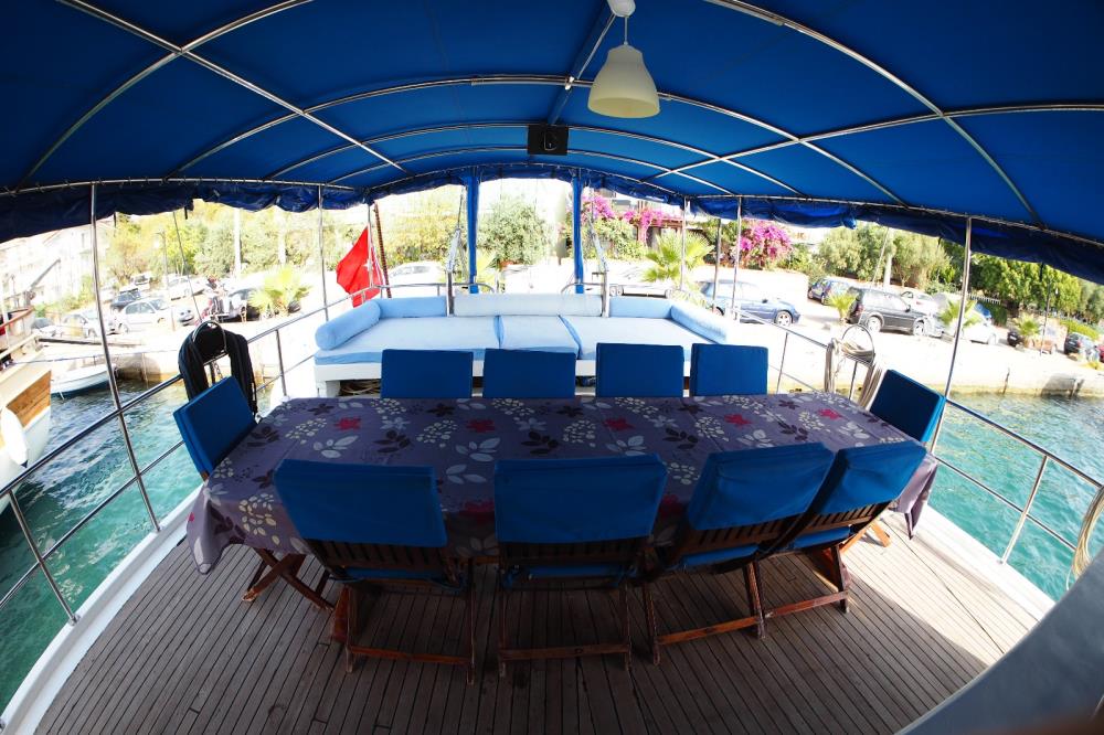 Gulet Deniz Gülü, kıç güvertede bulunan yemek masasında siz değerli misafirlerimiz için özenle hazırlanan muhteşem yemeklerimizi keyifle yiyebilirsiniz. Güneşlenme alanı ve güneşlenme minderleri yeterli miktarda mevcuttur. Gulet Deniz Gülü, Bozburun çıkışlıdır.