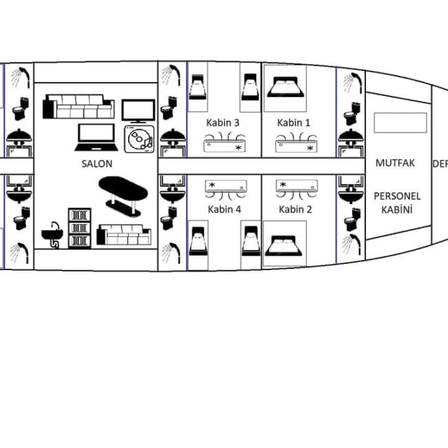 Bu kabin 8 kabinde 16 kişilik olup her kabinde duş & wc bulunmaktadır.