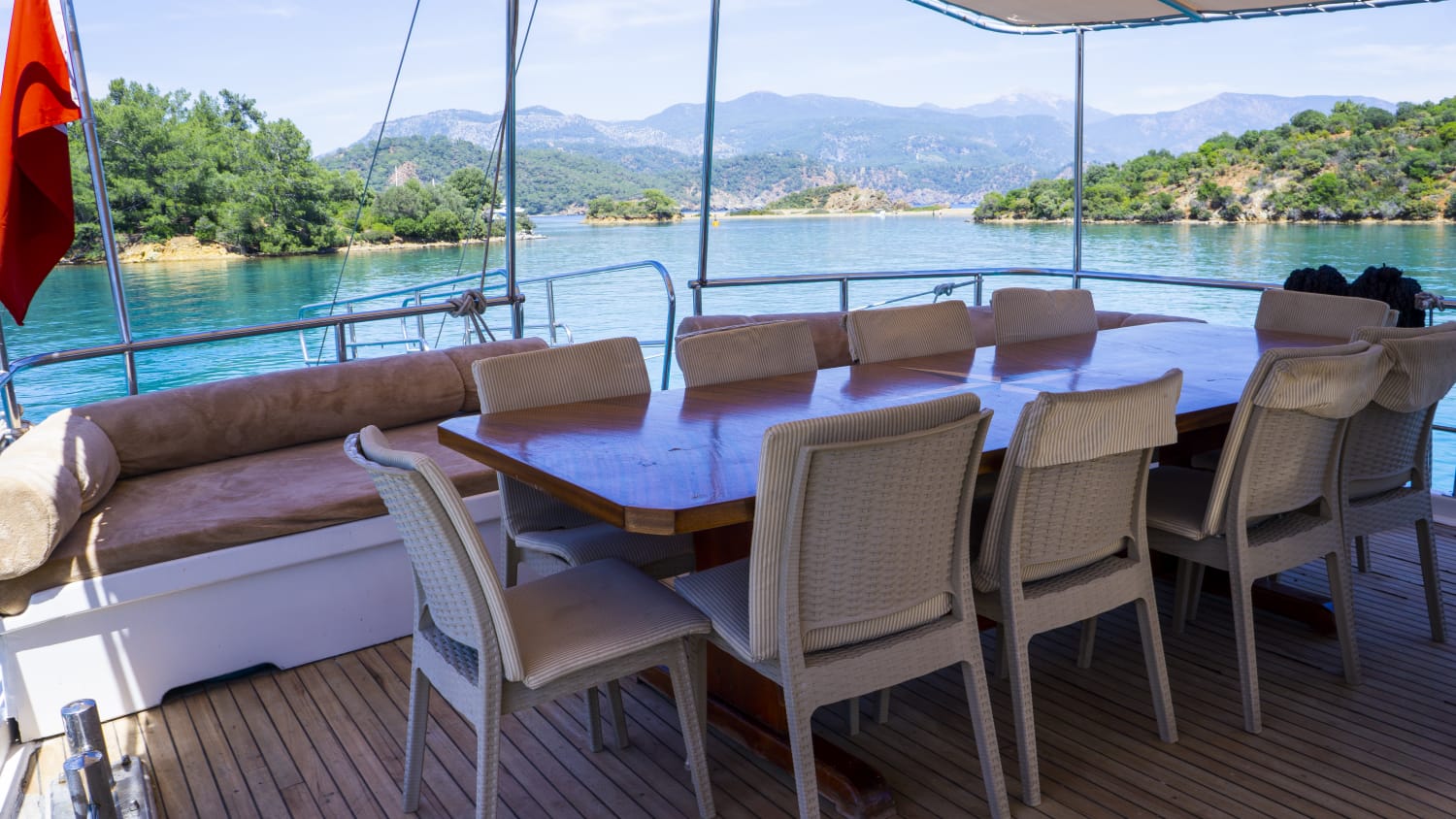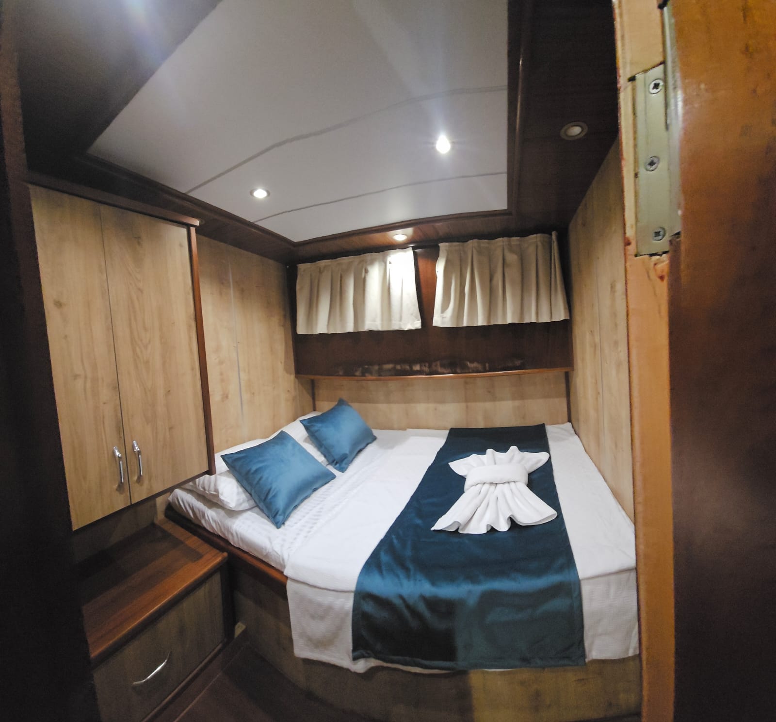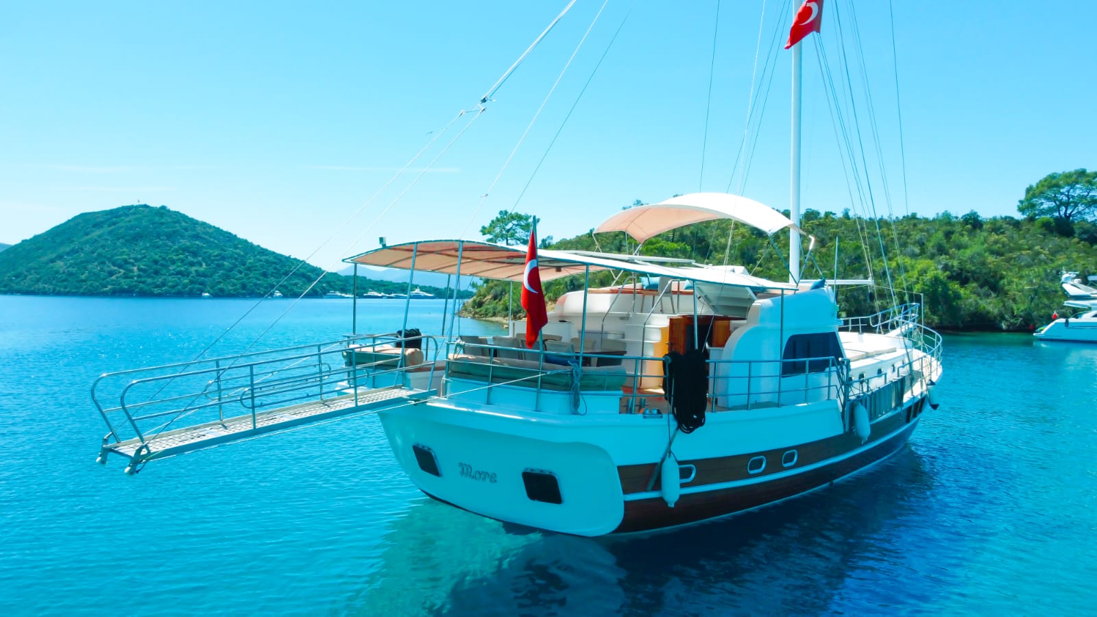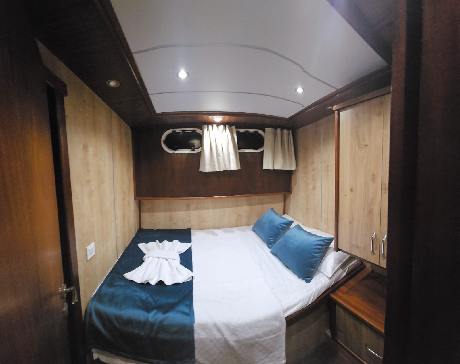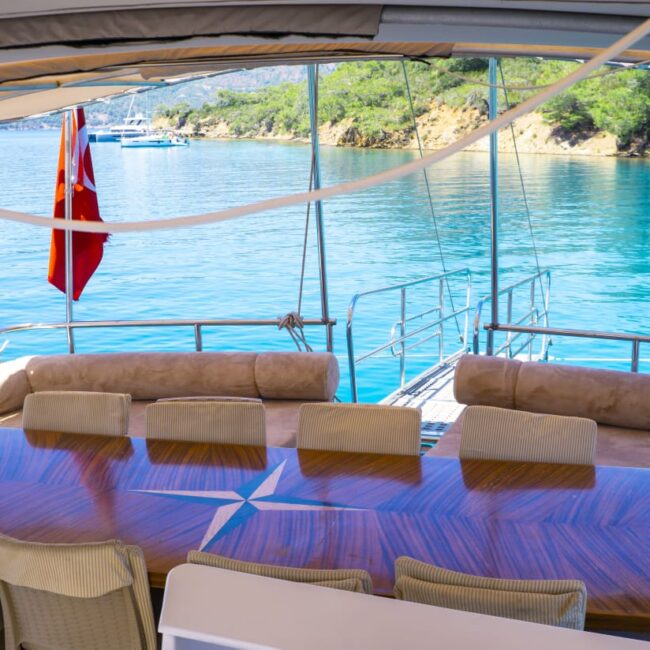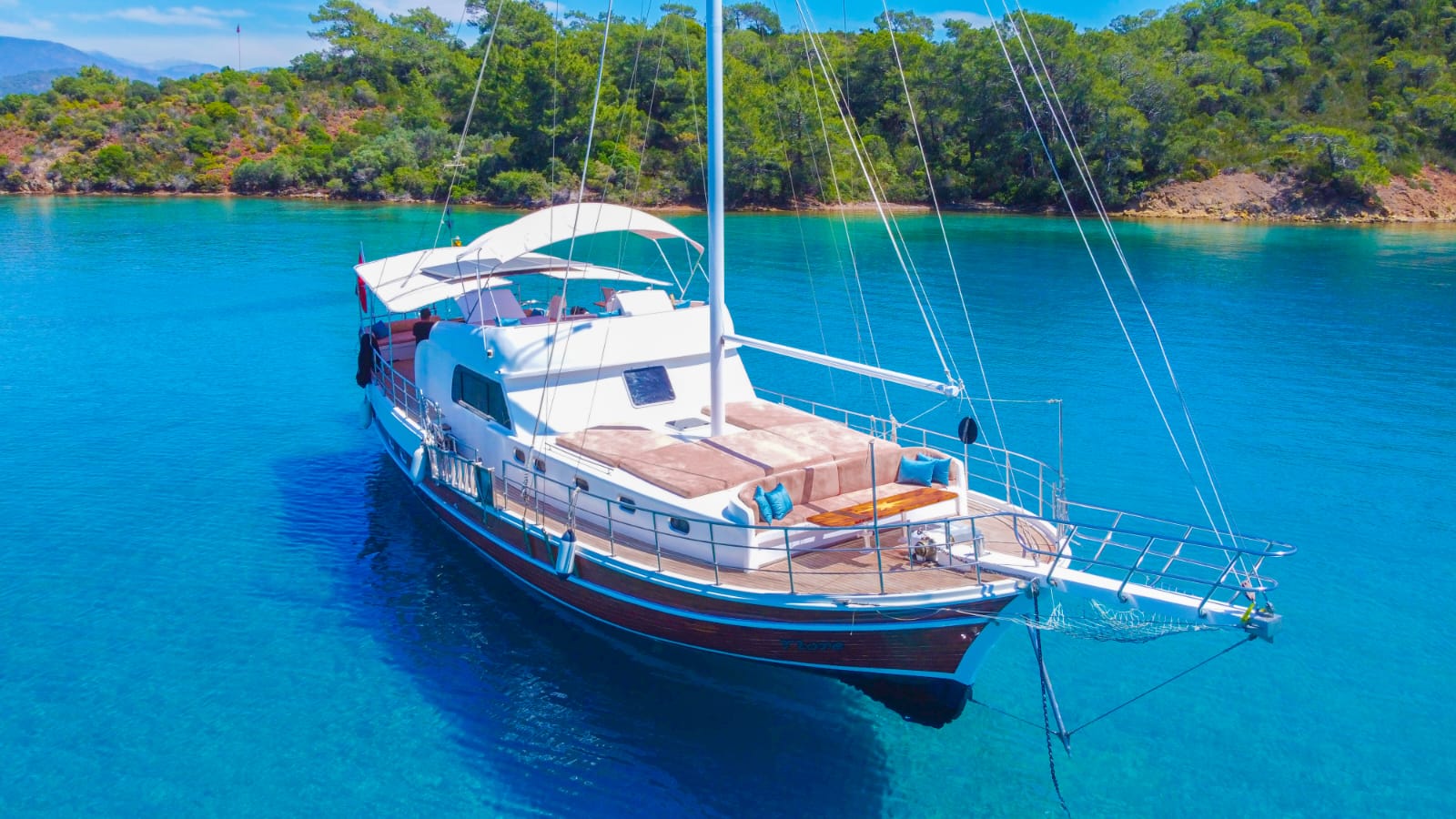 Göcek Marina çıkışlı 20 metre uzunluğundaki teknemiz, 1 master kabin, 4 double kabini ve deneyimli 3 kişilik mürettebatıyla 10 kişilik misafir kapasitesiyle konforun ve estetiğin bir arada olduğu muhteşem bir mavi yolculuk deneyimi yaşayabilmeniz için hizmet vermektedir.