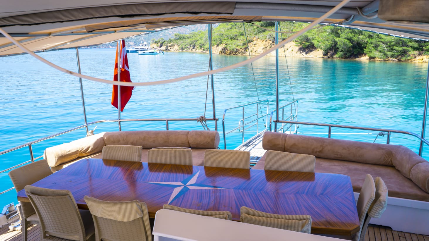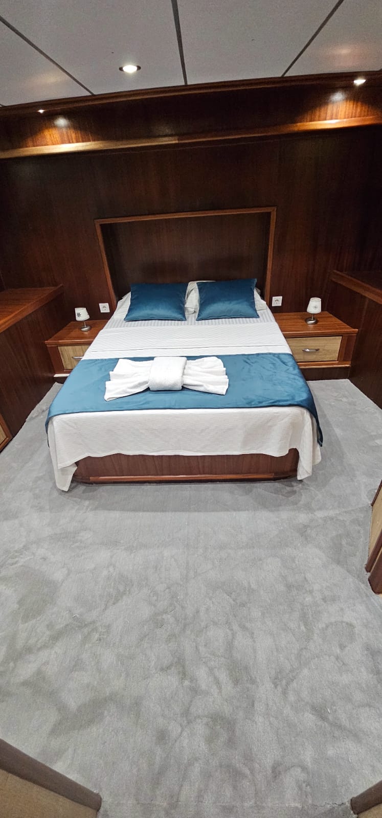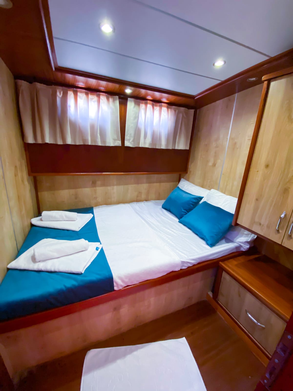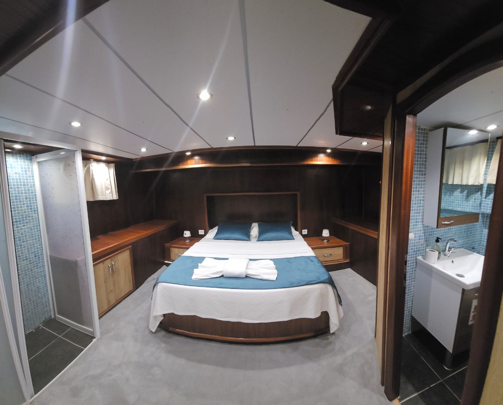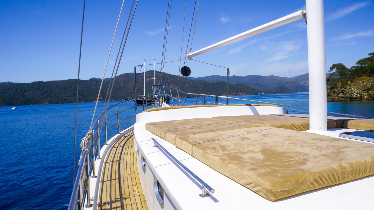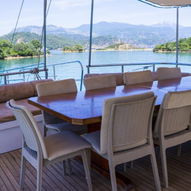 Göcek Marina çıkışlı 20 metre uzunluğundaki teknemiz, 1 master kabin, 4 double kabini ve deneyimli 3 kişilik mürettebatıyla 10 kişilik misafir kapasitesiyle konforun ve estetiğin bir arada olduğu muhteşem bir mavi yolculuk deneyimi yaşayabilmeniz için hizmet vermektedir.