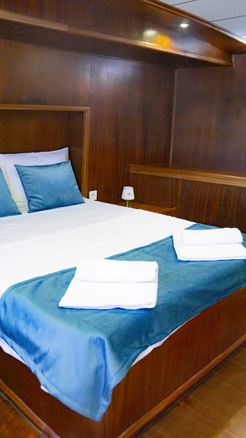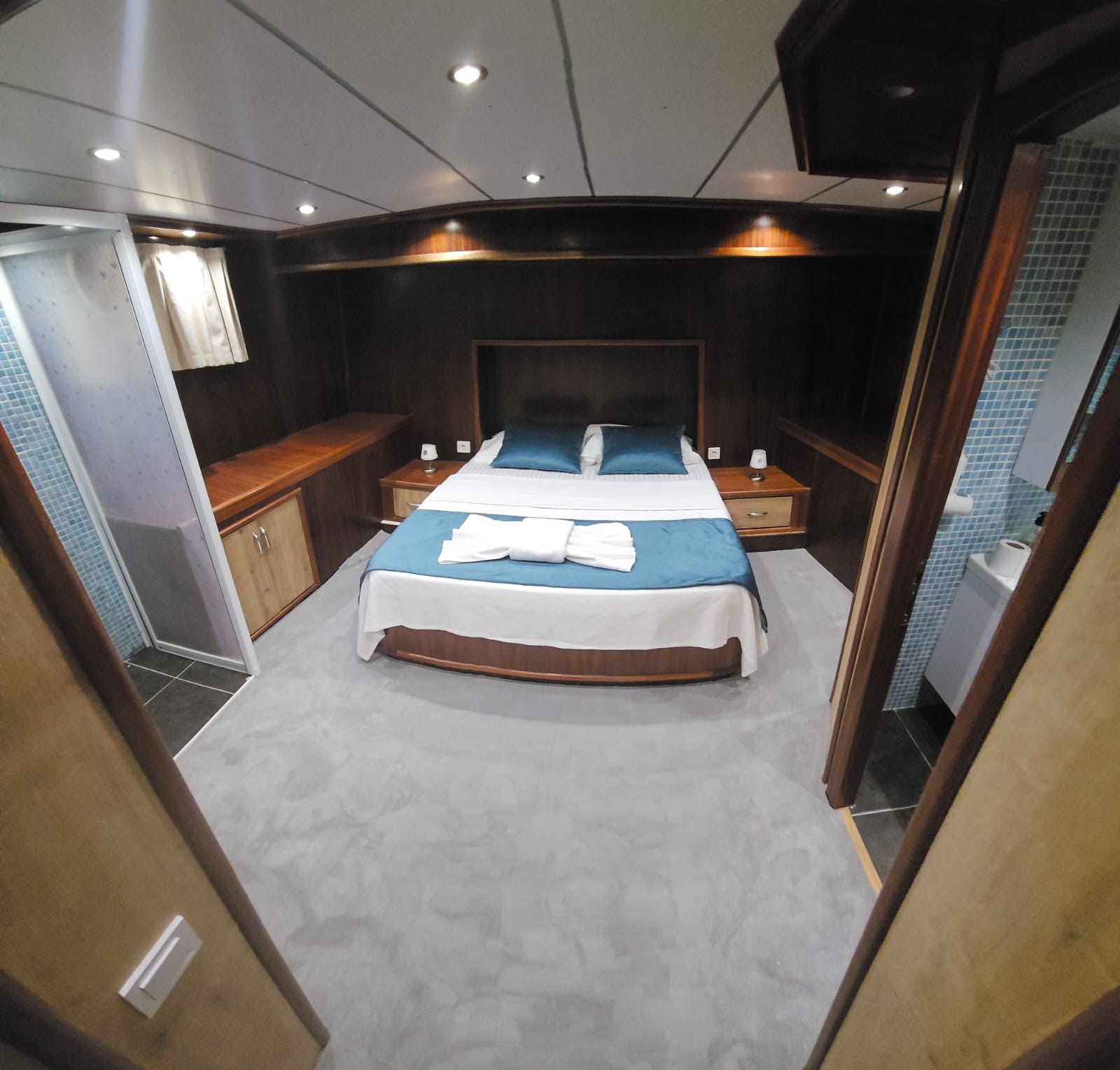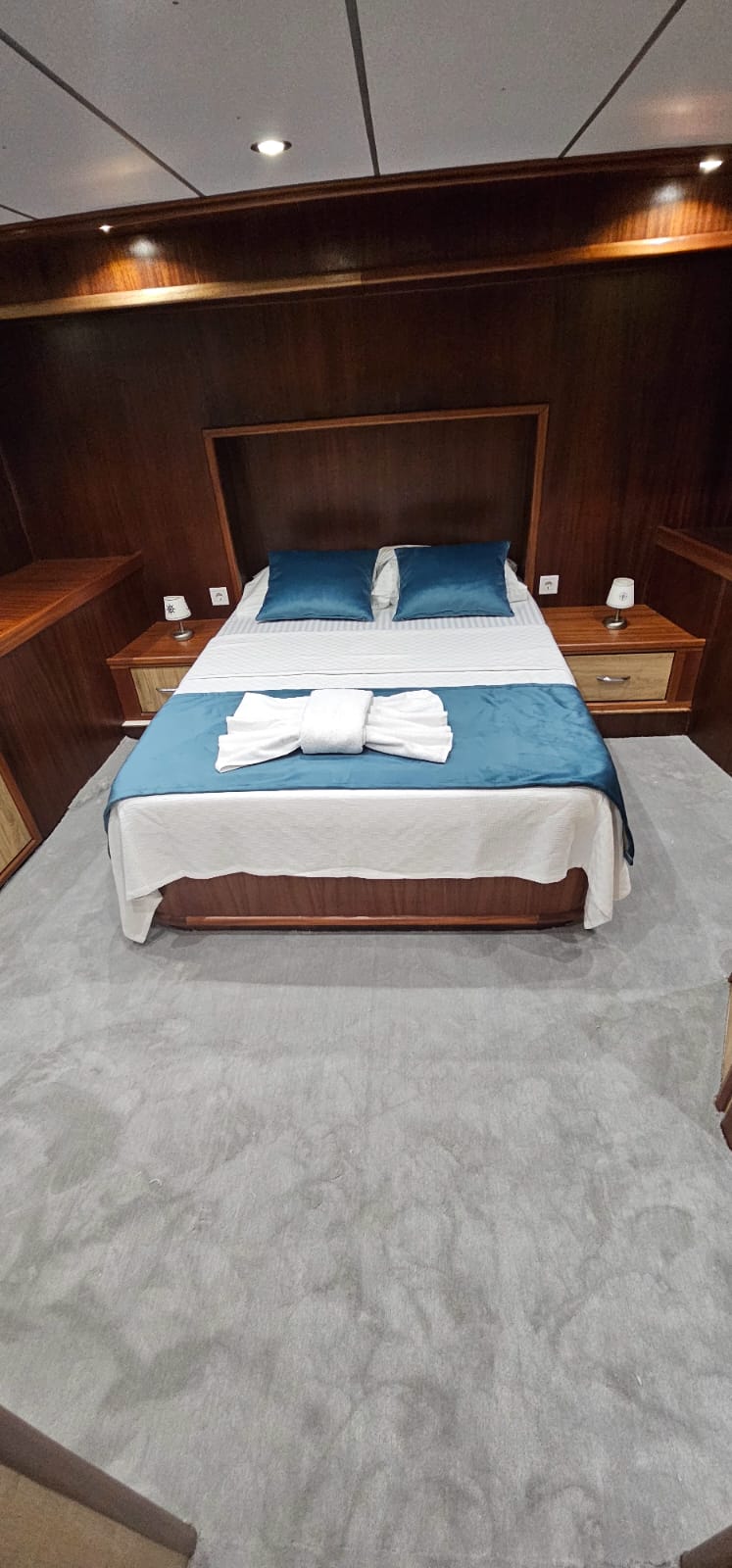 Her kabine özel lavabo ve duş imkânı mevcuttur. Arka güvertede bulunan üstü sabit tenteli yemek masası ve oturma alanı, ön güvertede güneşlenme yatakları bulunmaktadır. Salonda ve güvertede müzik sistemi bulunmaktadır. Misafirlerinin memnuniyeti prensibiyle hizmet veren mürettebatımız için ayrı