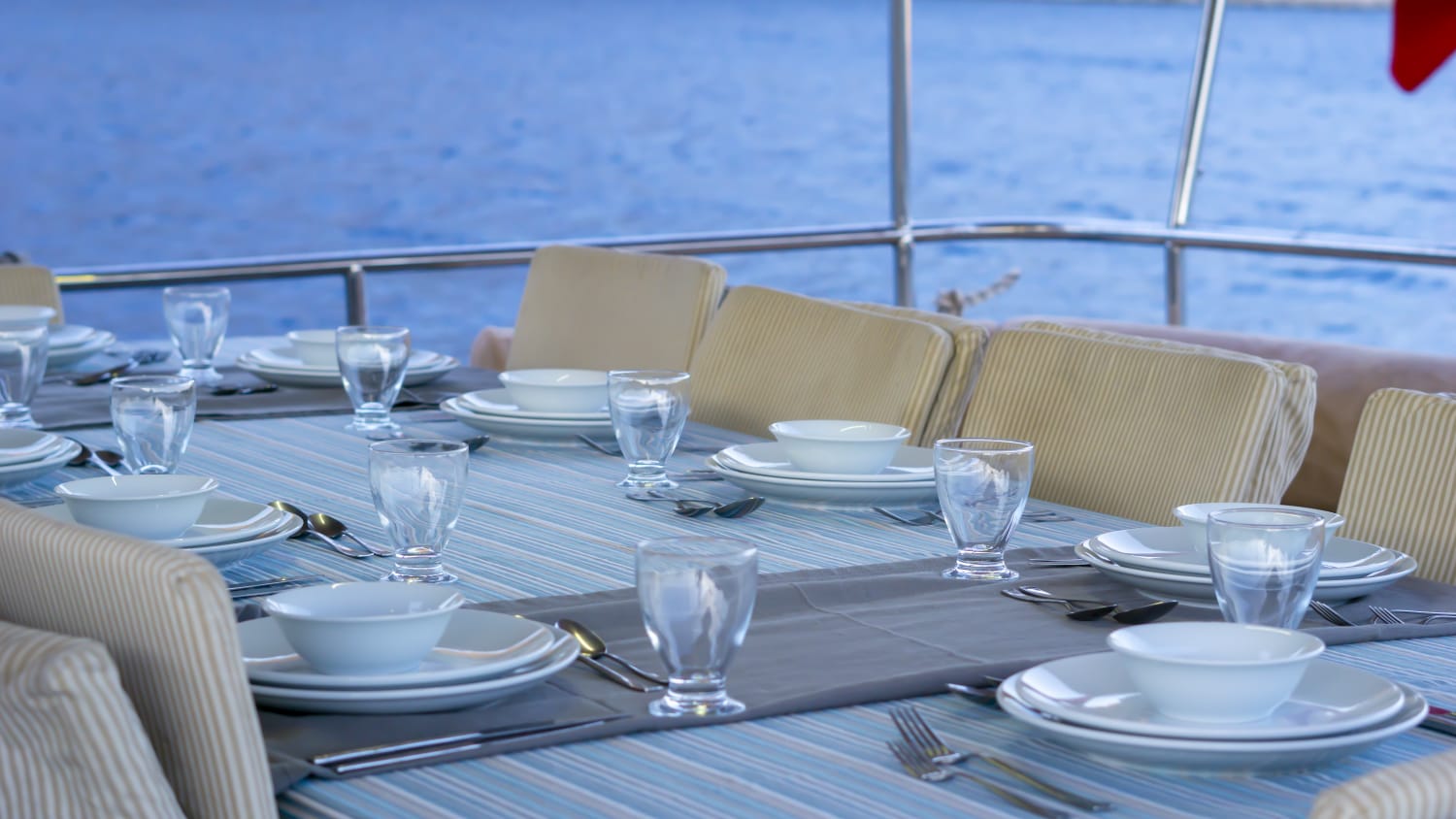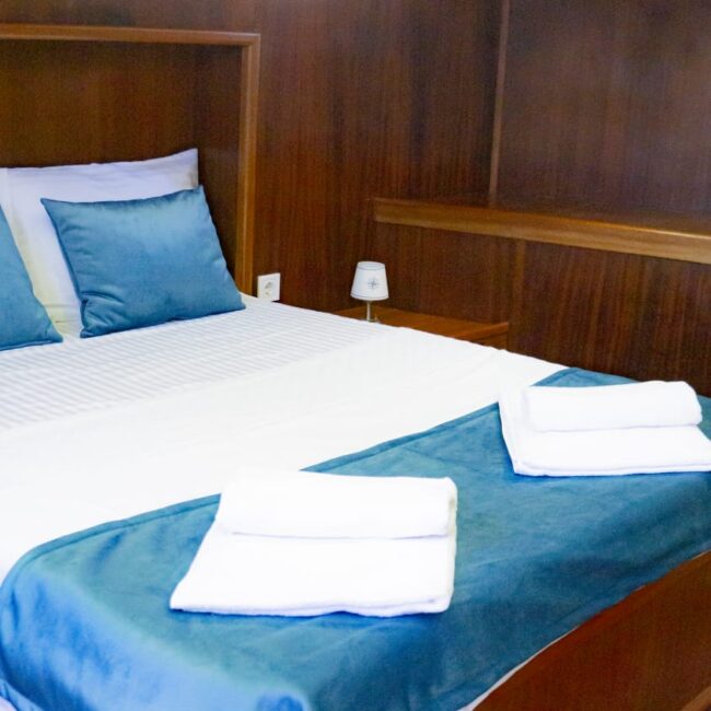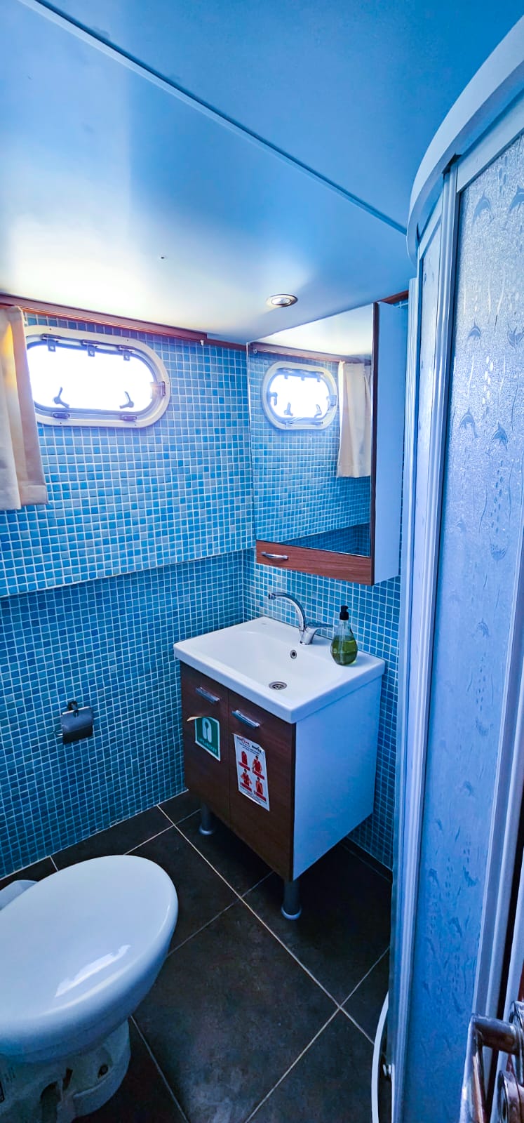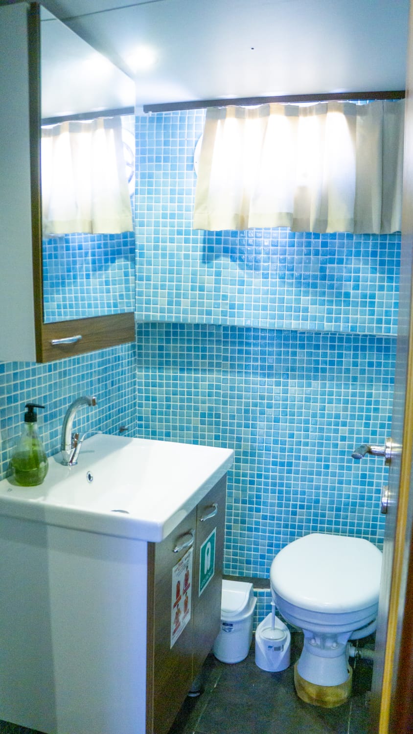 Her kabine özel lavabo ve duş imkânı mevcuttur. Arka güvertede bulunan üstü sabit tenteli yemek masası ve oturma alanı, ön güvertede güneşlenme yatakları bulunmaktadır. Salonda ve güvertede müzik sistemi bulunmaktadır. Misafirlerinin memnuniyeti prensibiyle hizmet veren mürettebatımız için ayrı