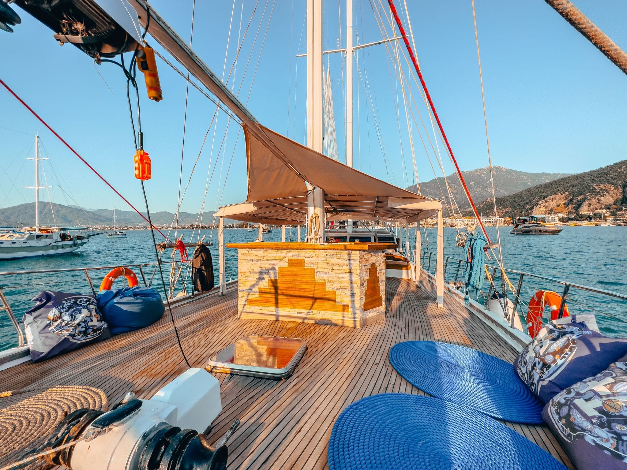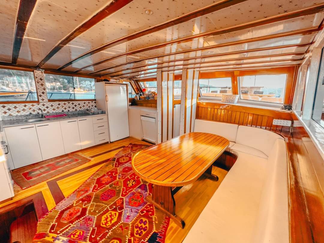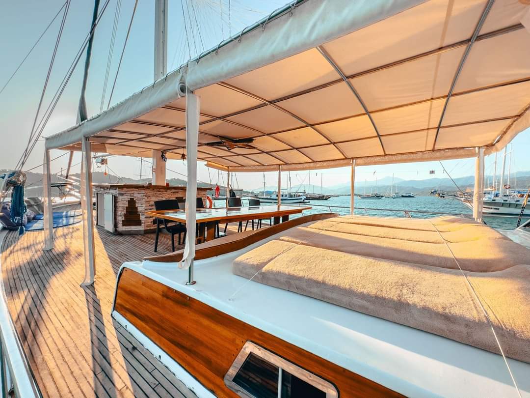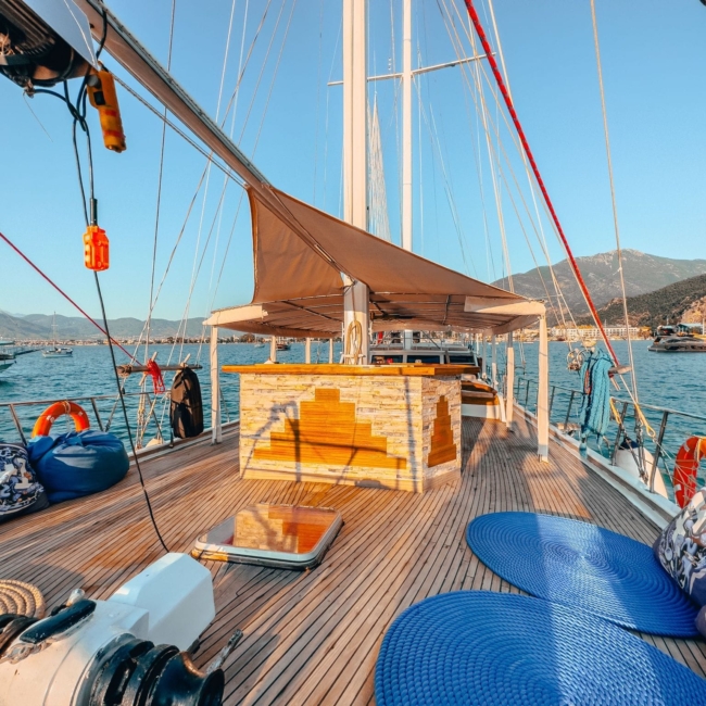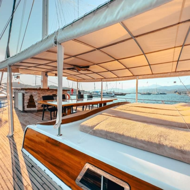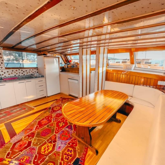 Gulet Prenses Ela,salon ve güverte kullanım açısından geniş ve ferahtır. Tam donanımlı mutfağımızda hazırlanan yemekleri güvertede veya salonda bulunan şık sofralarımızda tadabilirsiniz.Her misafirimiz için yeterli güvertede yeterli miktarda güneşlenme alanı ve güneşlenme minderi mevcuttur. Gulet Prenses Ela keyifli huzur dolu bir tatili taahhut eder.
