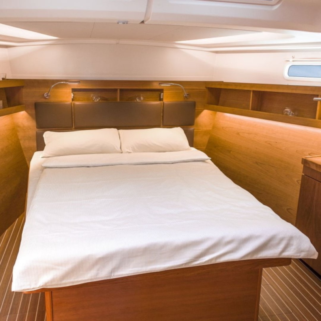 -A1 yerleşim; Önde çift kişilik ada yatak, iskelede WC ve lavabo, sanncakta duşakabin ayrılmış
