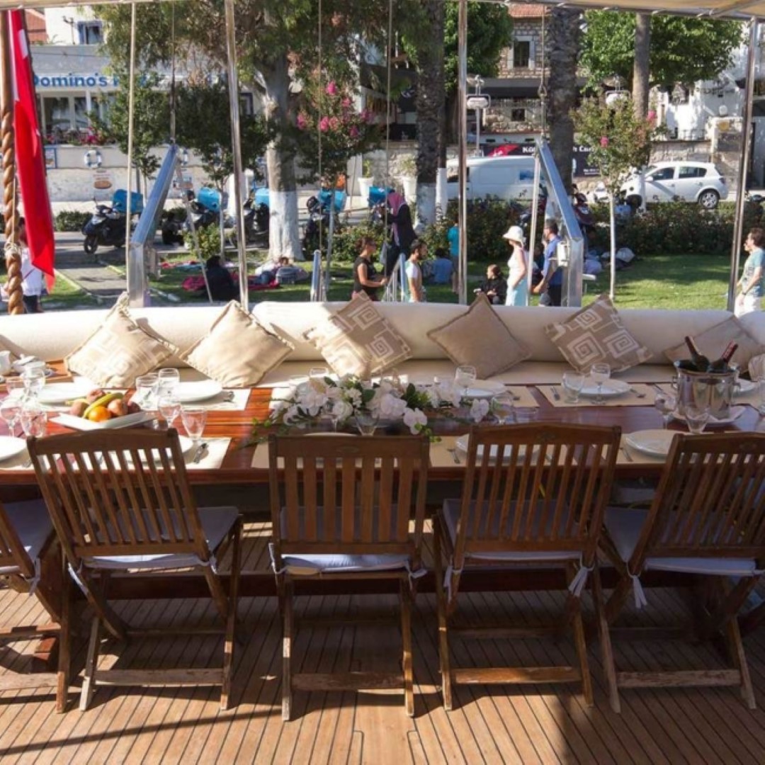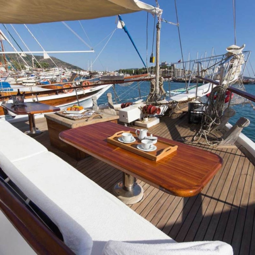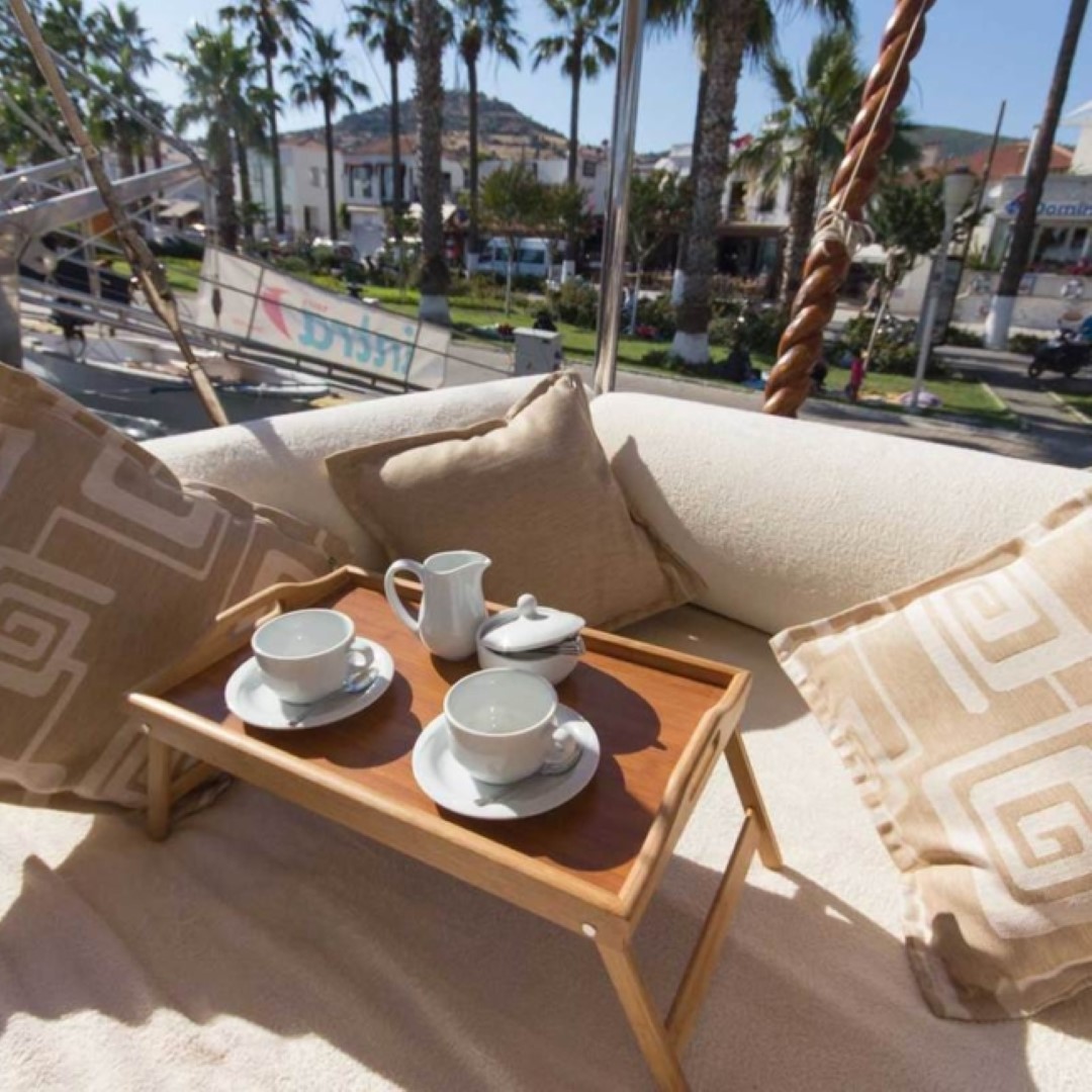 Tüm misafirlere yetecek miktarda güneşlenme minderleri, sandalye ve servis takımları mevcuttur. Mavi Yolculuk misafirlerimize konforu, lüksü ve huzuru bir arada yaşatan bu yatımız 8 deniz miline erişmektedir.