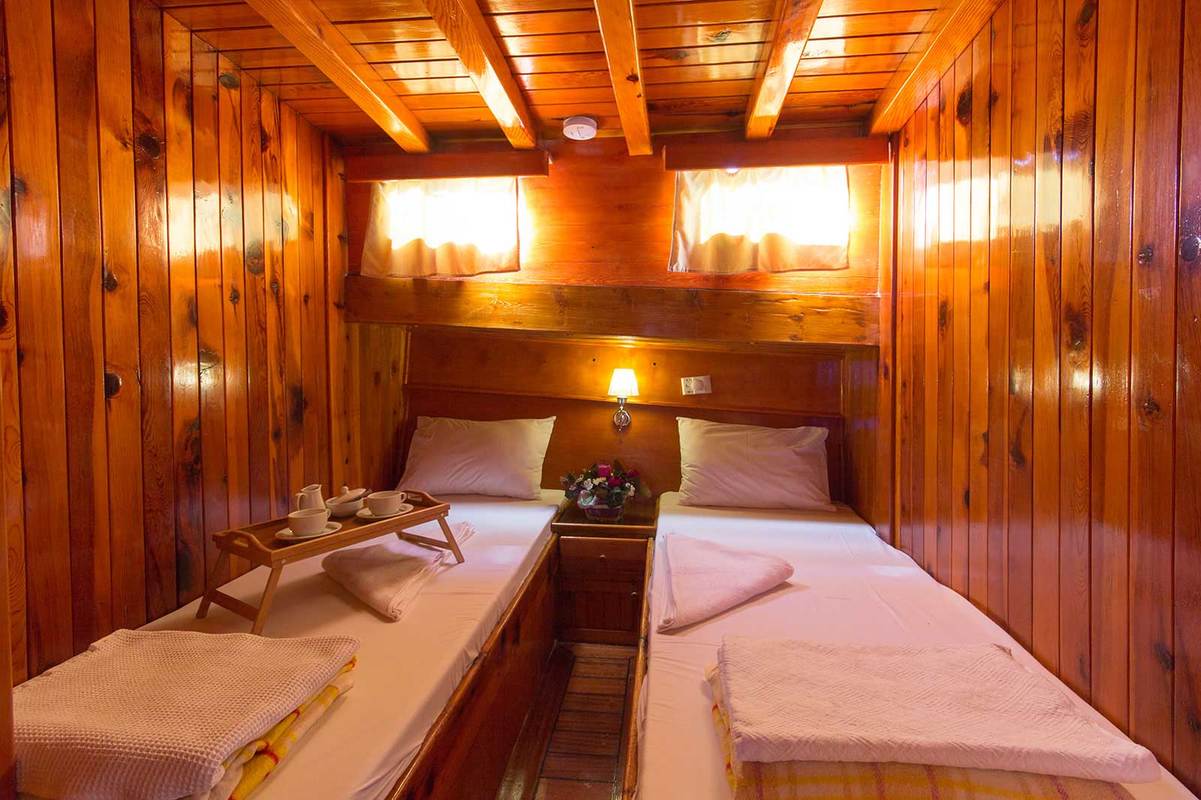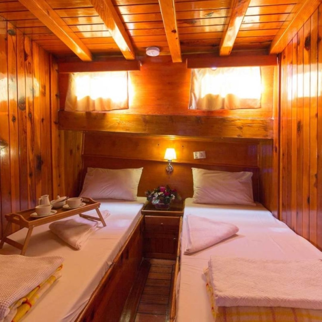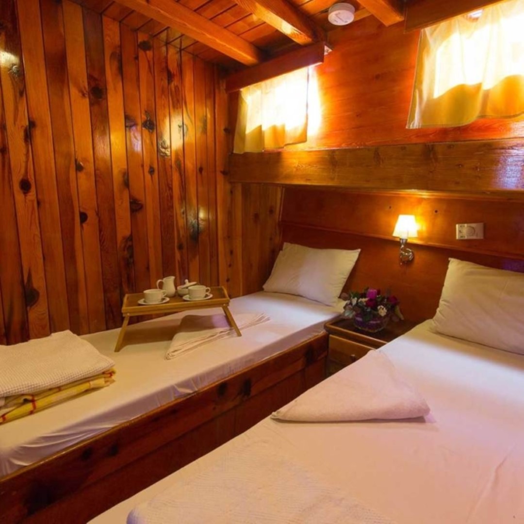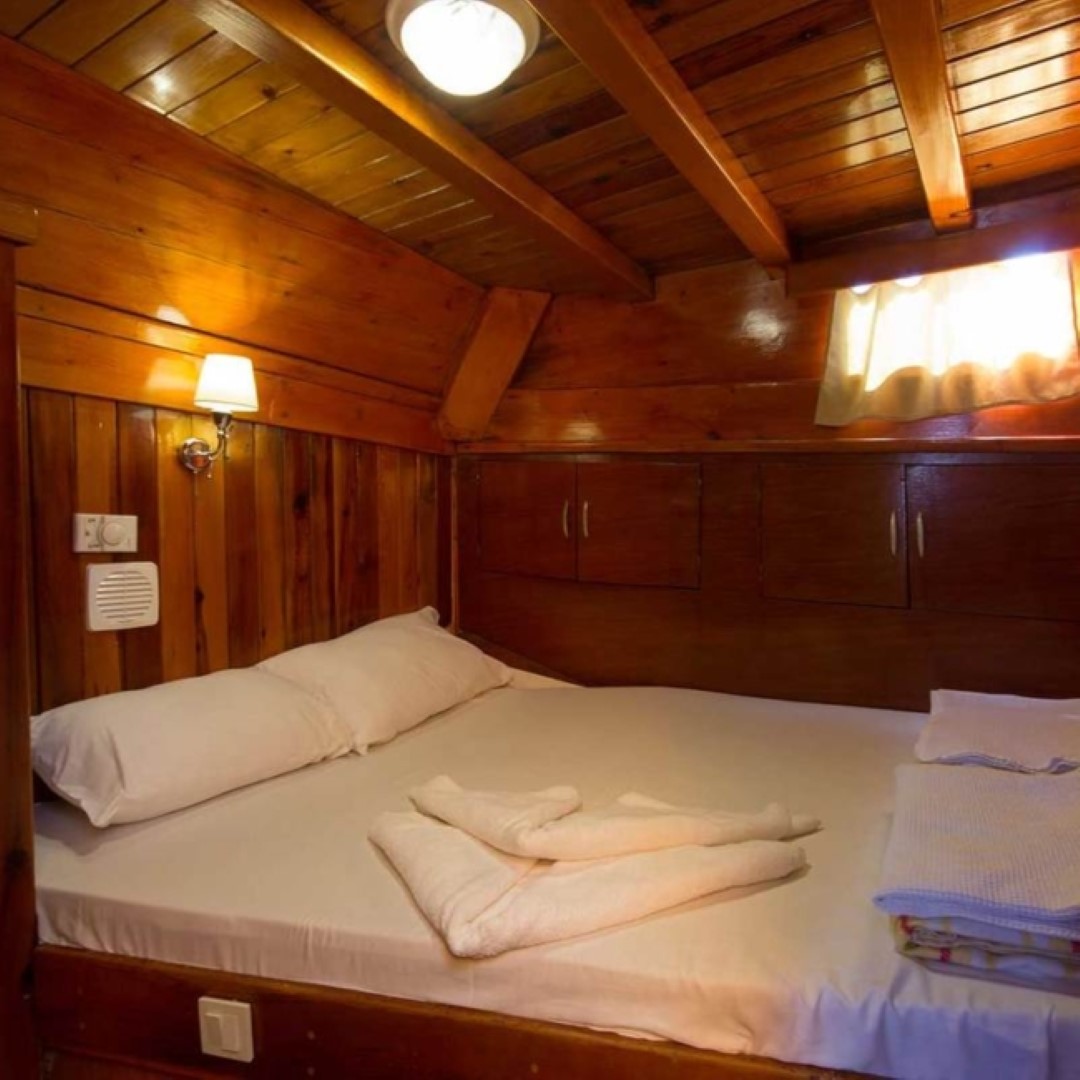 4 Double Kabin, 4 Triple Kabin, 2 Twin Kabin olmak üzere birbirinden şık ve rahat, kendine ait duş, WC ve kliması olan yatımız 10 kamaraya sahiptir. 240 HP Delphin Marin beygirlik motoru ve 33 Kw jeneratöre sahiptir.