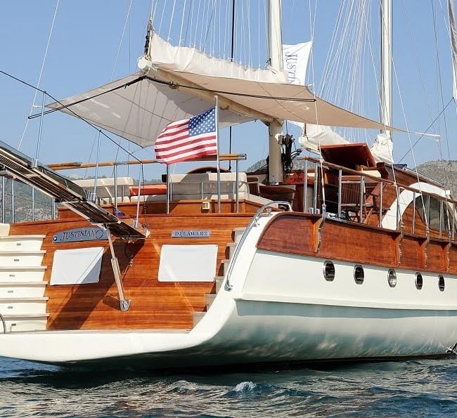 Gulet Justiniano, 2009 yılında 30 metre uzunluğunda inşa edilmiştir. Her yıl bakımları yapılan lüks guletimiz Türk ve Yunan sularında hizmet vermektedir. 2 Master Kabin, 1 Double Kabin ve 1 Twin Kabinde 8 misafire kadar ağırlayabilmektedir. 400 m² yelken donanıma sahip olan teknede hava koşullarına göre yelken ile seyir yapabilirsiniz. Kabinler geniş, ferah ve modern şekilde zevkle dizayn Saç Kurutma Makinesi, Tv, Klima, Duş ve Wc mevcuttur. Tam donanımlı mutfağımızda özenle hazırlanan yemeklerimizi kıç güvertede veya salonda bulunan şık sofralarımızda tadabilirsiniz. Güvertede geniş minderli oturma alanı, güneşlenme alanı ve güneşlenme minderleri yeterli miktarda mevcuttur. Burada barda hazırlanan sıcak-soğuk içecekleri keyifle içebilirsiniz. Misafirlerin daha iyi zamanlar geçirebilmesi için müzik sistemi, TV ve uydu salonda yer alırken yaz aylarında biraz daha iyi hissetmelerini sağlayacak klima her daim kullanıma açıktır. Eğer denizin mavi sularını en iyi şekilde değerlendirmek isterseniz bunun içinde teknenin pek çok avantajı bünyesinde bulundurduğunu belirtmek gerekir. İletişim ve güvenlik açısından beklentilerinizi tam olarak karşılayacak bir yapıya sahiptir. İletişim cihazları, pusula, GPS, seyir cihazları, derinlik ölçer, elektronik harita gibi seçeneklerde teknede bulunanlar arasında yer alır. Ayrıca Türk Karasularında internet hizmeti verilmektedir.