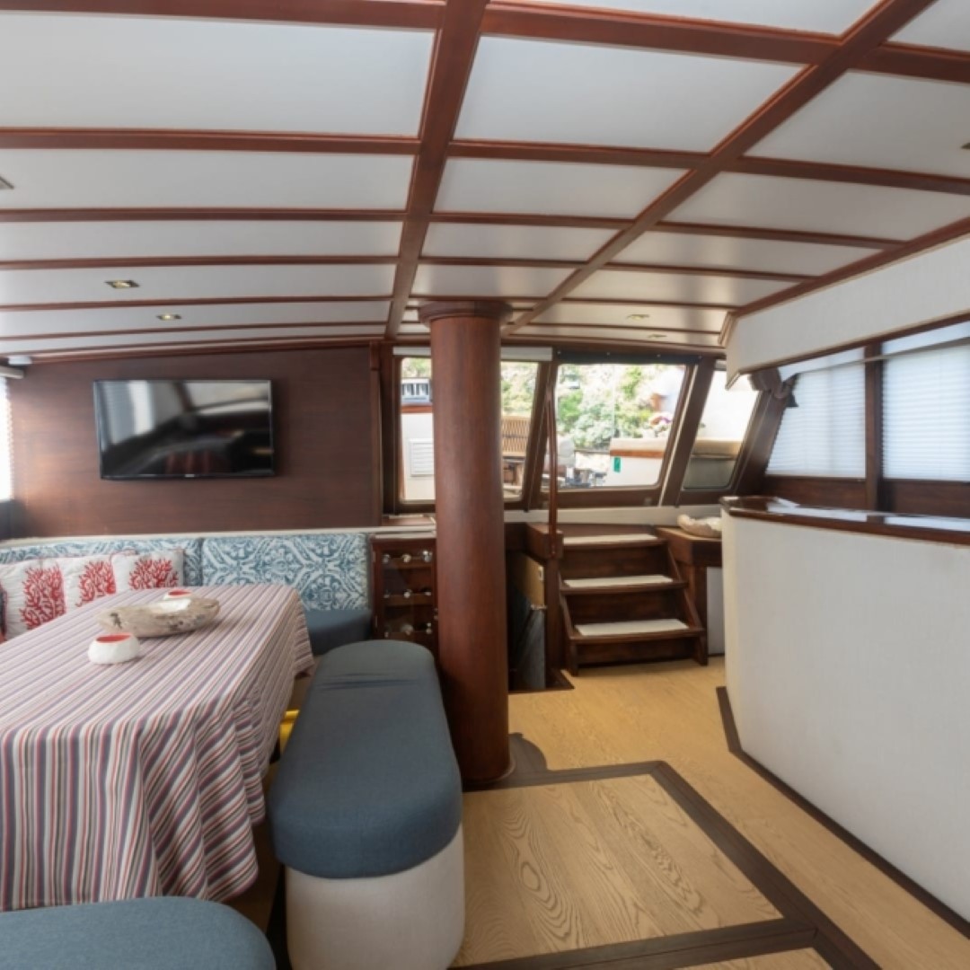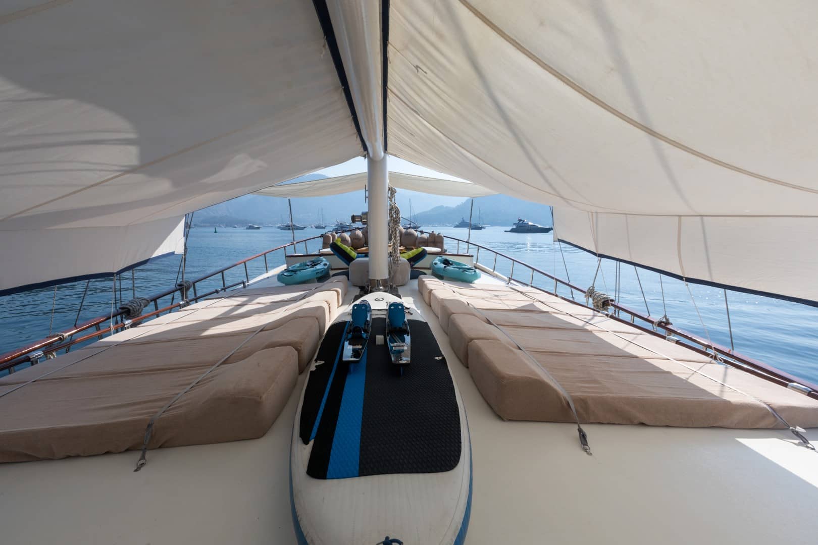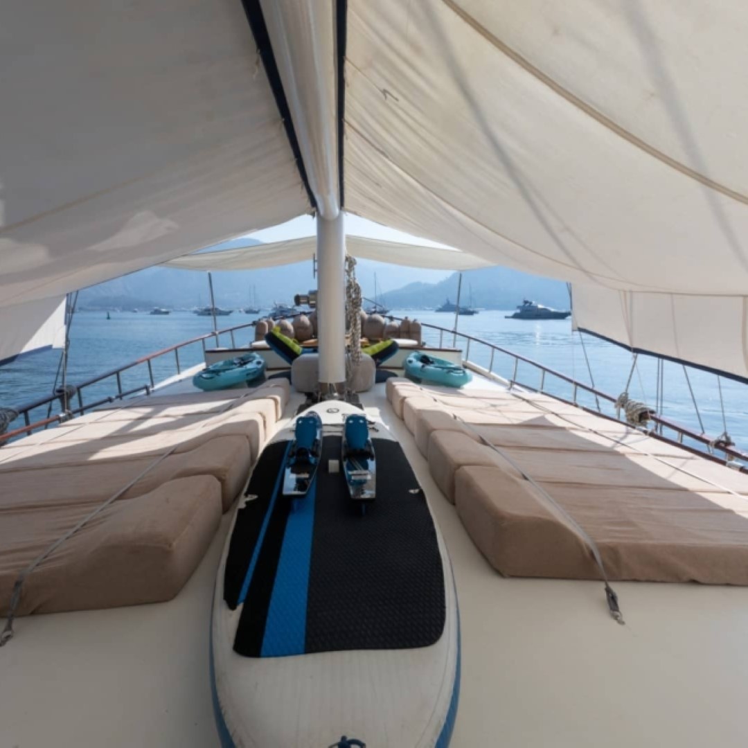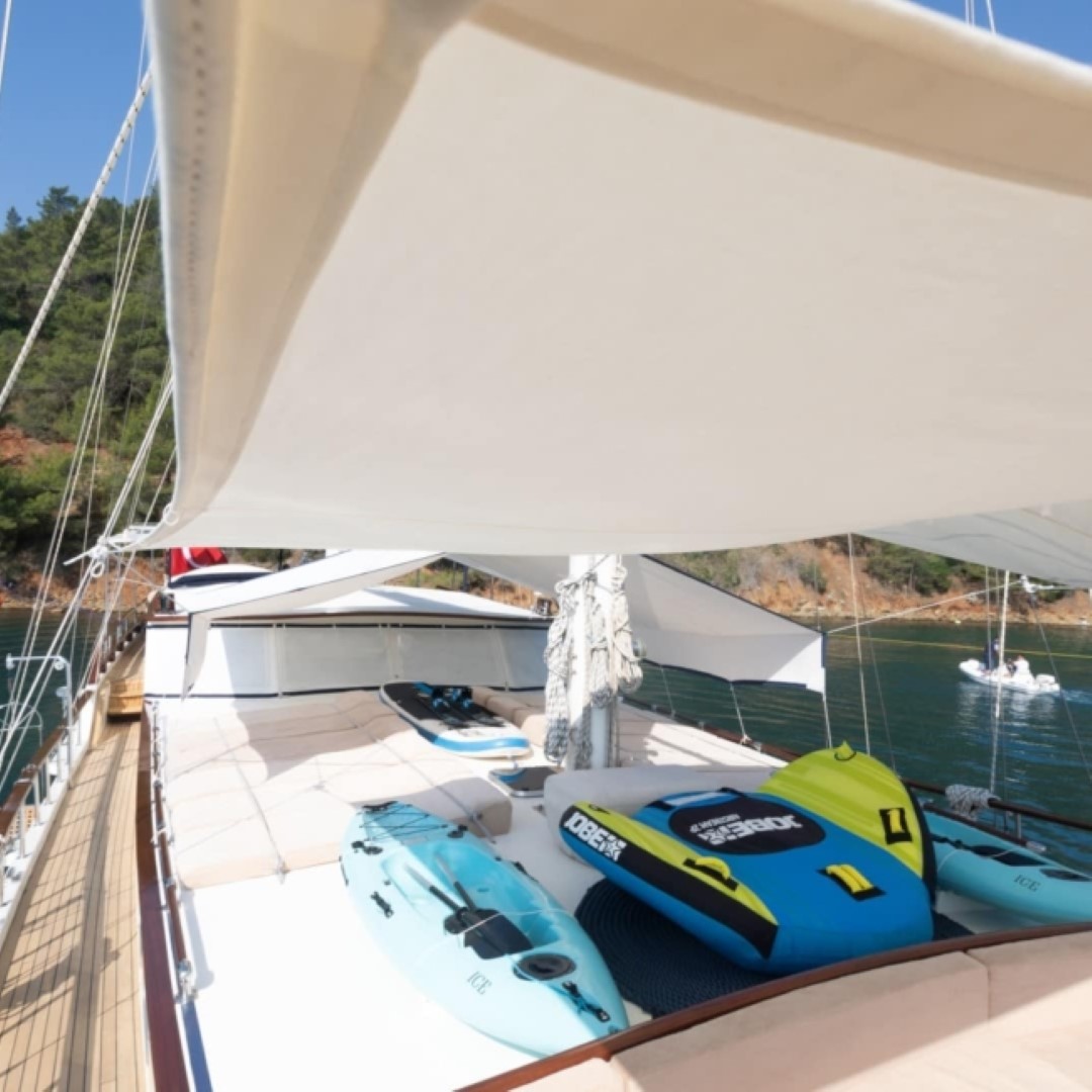 Misafirlerin daha iyi zamanlar geçirebilmesi için müzik sistemi, TV ve uydu burada yer alırken yaz aylarında biraz daha iyi hissetmelerine neden olacak klimada her daim kullanımlarına açıktır. Ekstra olarak teknede bulabileceğiniz eşyalar arasında ise buz makinesi, kahve makinesi, oyun kağıdı, tavla, okey gibi seçenekler bulunmaktadır. Eğer denizin mavi sularını en iyi şekilde değerlendirmek isterseniz bunun içinde teknenin pek çok avantajı bünyesinde bulundurduğunu belirtmek gerekir. Balık tutmak için gerekli ekipmanlar, dalış malzemeleri gibi ekipmanlar burada kullanımınıza her daim açık olacaktır.