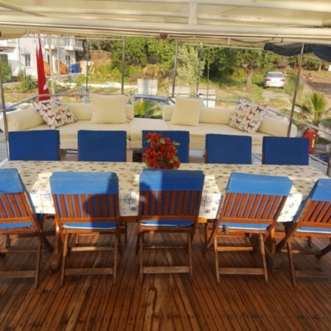 Gulet Özgen Kaptan üst yaşam alanında önde güneşlenme yatakları arka kısımda ise yemek masası ve dinlenme alanları yer almaktadır.