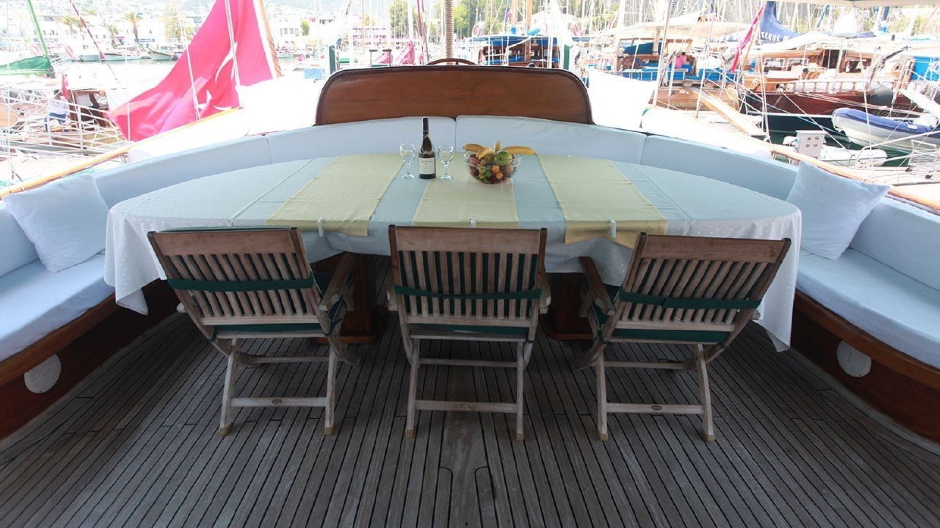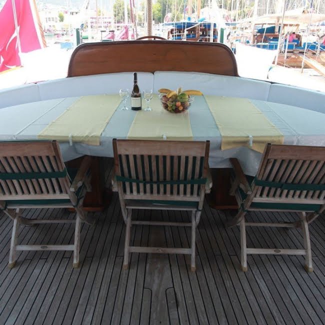 Özenle hazırlanmış yemeklerimizi kıç güvertemizde bulunan tam donanımlı mutfağımızda veya salondaki şık masalarımızda tadabilirsiniz.