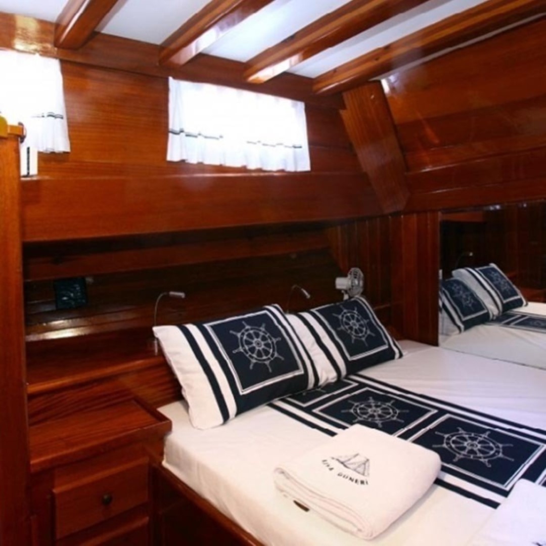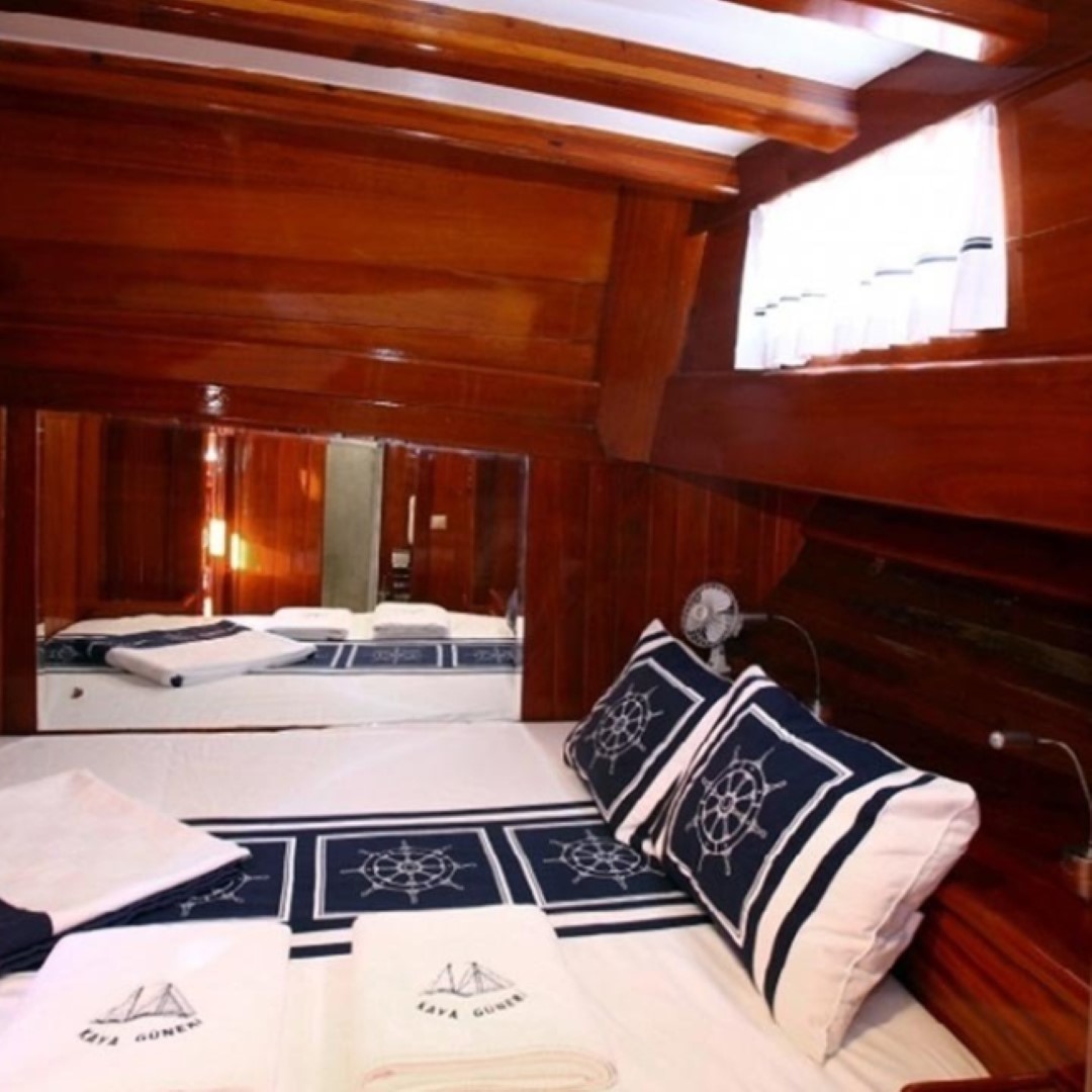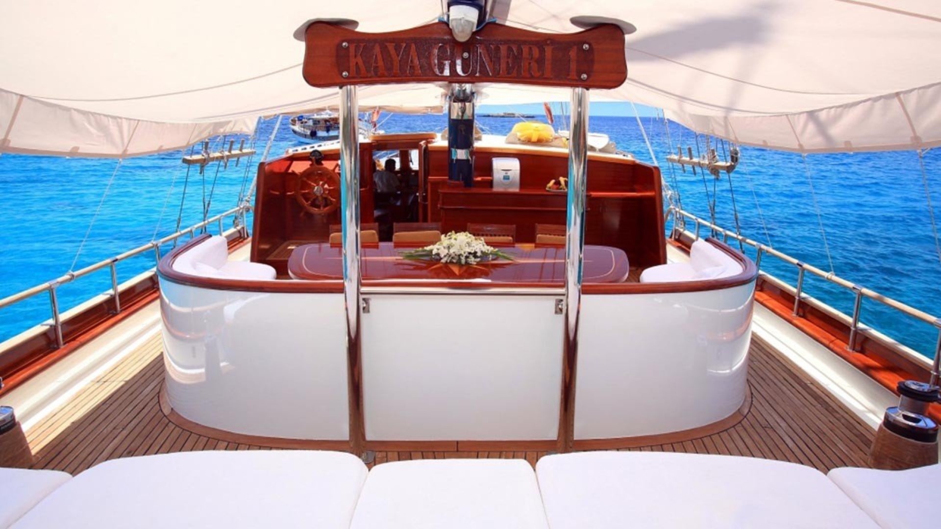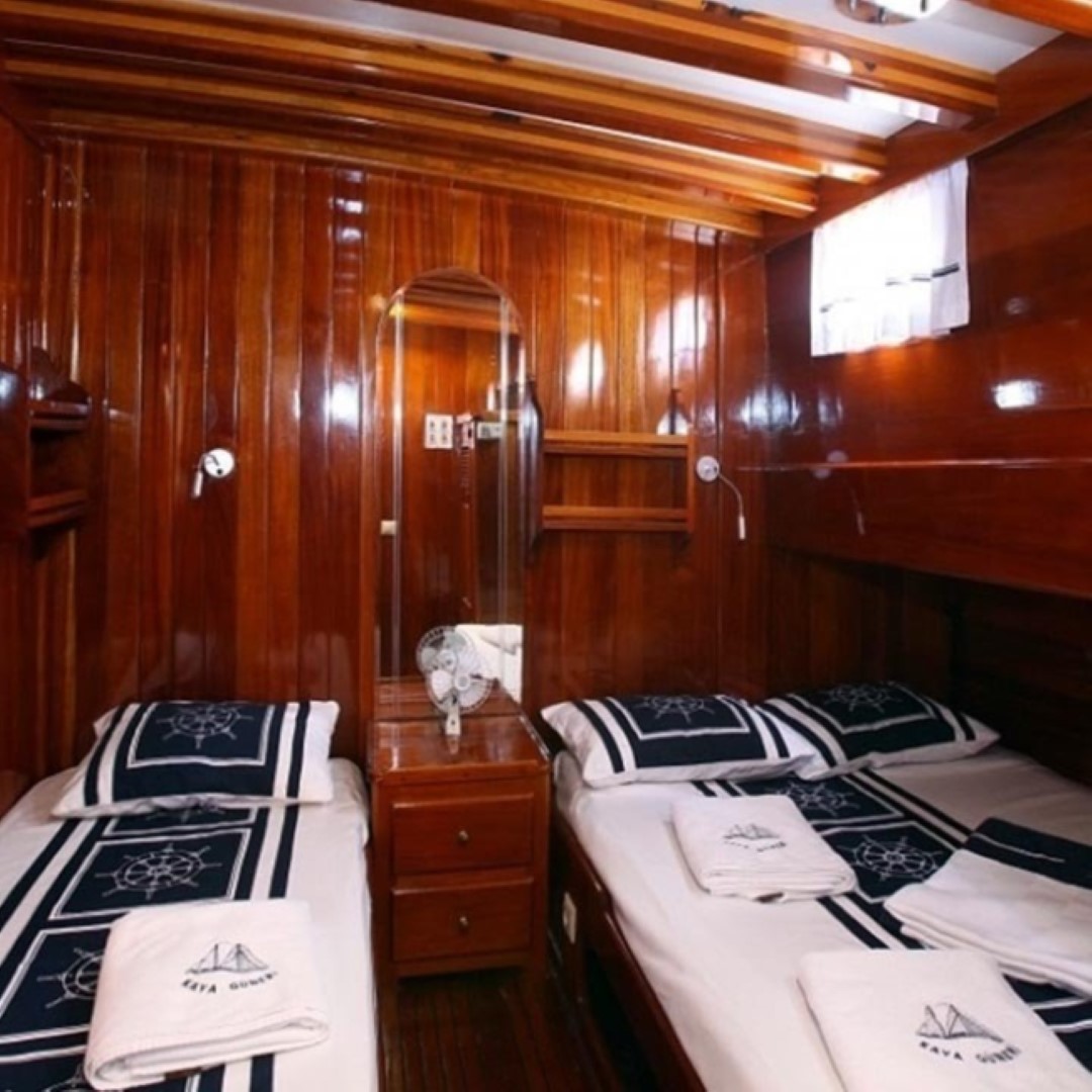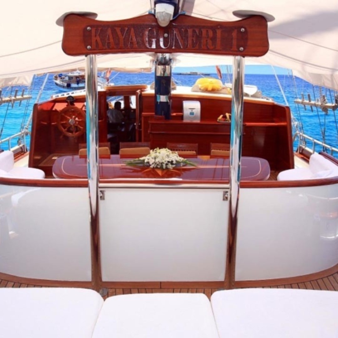 Kaya Güneri 1 guleti 1997 yılında yapılmış olup 2014 yılında modern şekilde tamamen yenilenmiştir. 26 m uzunluğunda olup 2 Double Kabin, 3 Tripple Kabin ve 2 Twin Kabin olmak üzere toplam 7 Kabinden oluşmaktadır. Kabinlerimiz geniş ve ferah olup tüm kabinlerde Duş Ünitesi, Wc ve Klima bulunmaktadır. Mürettebatın kendine ait yaşam alanı mevcuttur. Kıç güvertede geniş oturma minderleri ve yemek masası bulunmaktadır. Bu alanda tam donanımlı mutfağımızda hazırlanan yemekleri yiyebilirisiniz. Ön güvertede bulunan güneşlenme alanı ve güneşlenme minderleri yeterli miktarda bulunmaktadır. Guletimizin kabinleri, iç ve dış güverteleri modern bir şekilde dizayn edilmiştir. Her gün özenle ve titizlikle hazırlanan profesyonel ekibimiz sizlere yardımcı oluyor. Gulet Kaya Güneri 1 ekibi olarak mavi yolculuğunuzda şimdiden iyi tatiller dileriz.