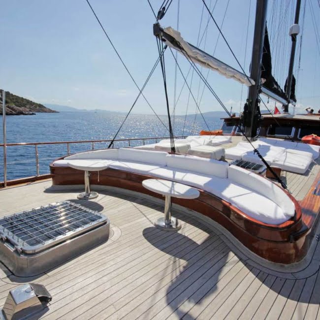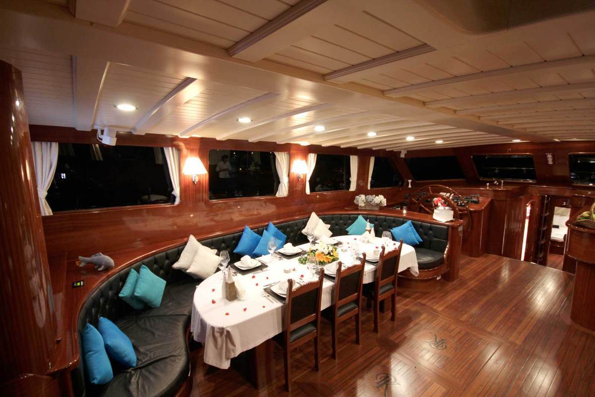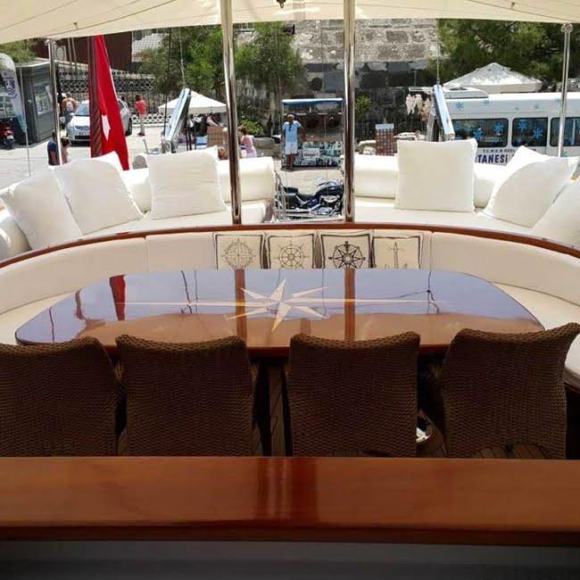 Kaya Guneri Plus yatımızın maun kaplama iç dizaynı ve özel vernikli yapısı hem klasik hem de modern yapıyı birleştirmiştir. Tüm kabinler geniş ve rahat olmakla beraber salon tüm misafirlerimizin rahatlıkla hizmet alabilecekleri ferahlıktadır. Salonda kötü hava şartlarında misafirlerimizin yemek yiyebilecekleri büyük bir masa TV,DVD ve müzik sistemi bulunmaktadır. Gulet yatımızın üst arka güvertesinde yemek masası ve uzanma minderleri yer almaktadır. Ön güverte de ise güneşlenme yatakları ve oturma alanı yer almaktadır.