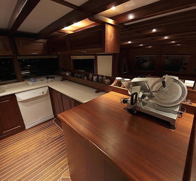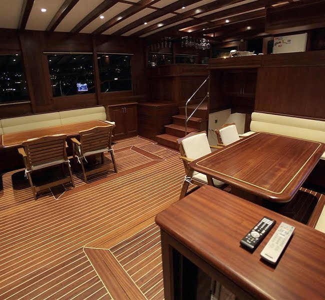 Kamarasında, bar, salon, yemek masası, konforlu oturma alanı bulunmaktadır. Kamarası klasik möblelidir. Yat içerisinde, 3 double, 2 master, 1 twin, yatak bulunmaktadır. Banyosu duşa kabin tarzında olan yatın, tuvalet kısmı ise ev tipidir. Personel kabini, müzik sistemi, TV-Uydu, yat içerisinde mevcuttur. Yat içerisindeki elektronik ekipmanlar şunlardır; haberleşme cihazı, derinlik ölçer, radar, GPS, Pusula. Eğlence Ekipmanları olarak Dalış malzemeleri, balık tutma malzemeleri, su kayağı ve kano ekipmanları da yer almaktadır.