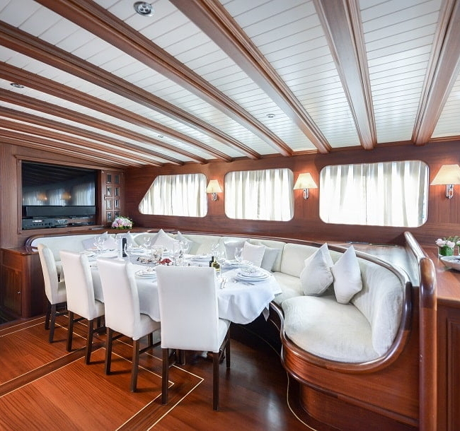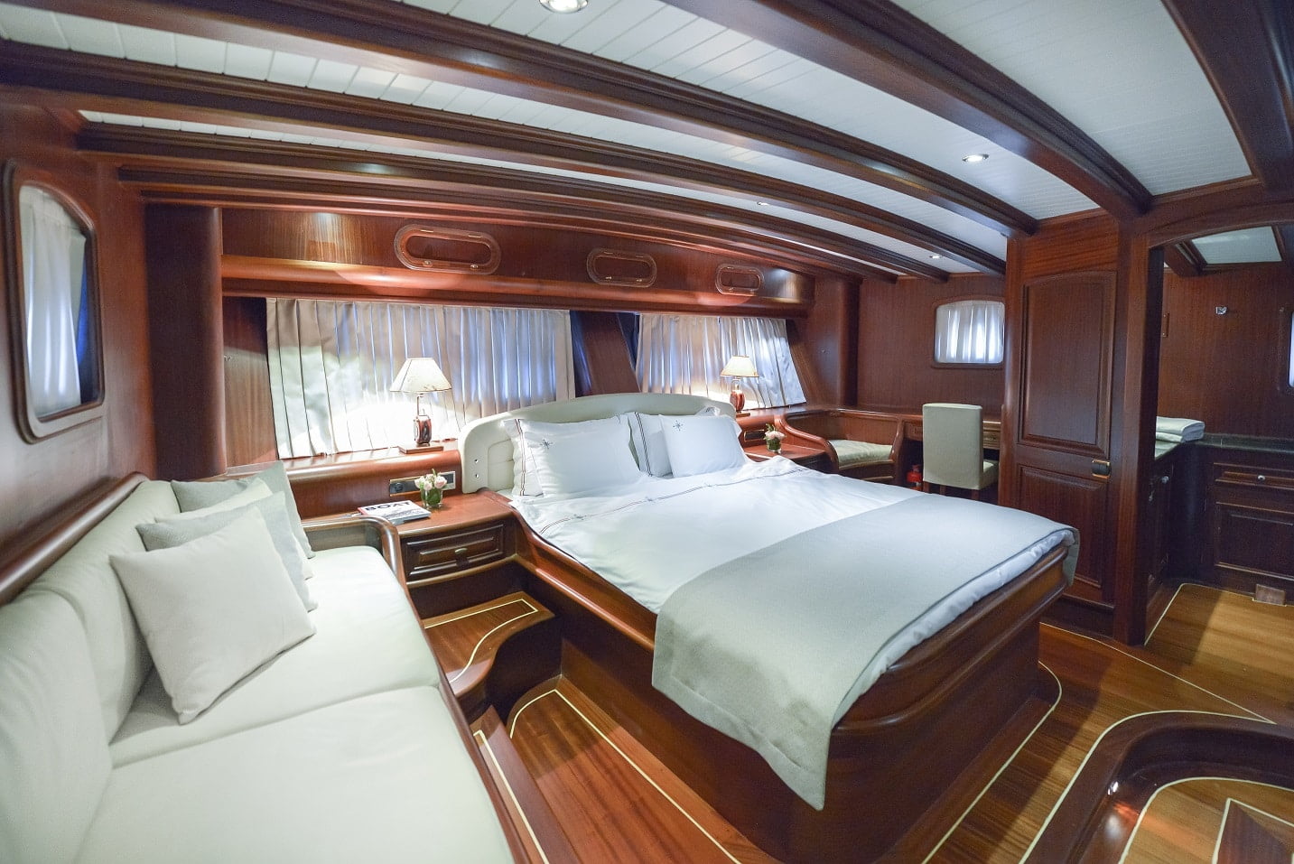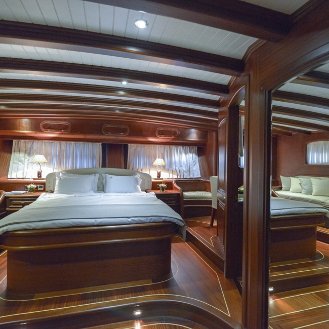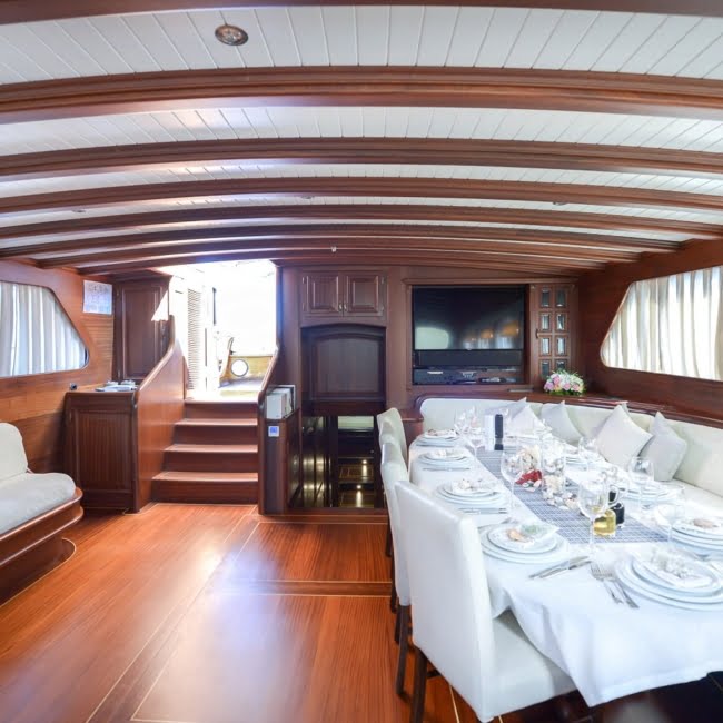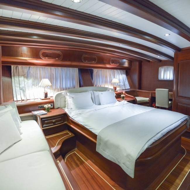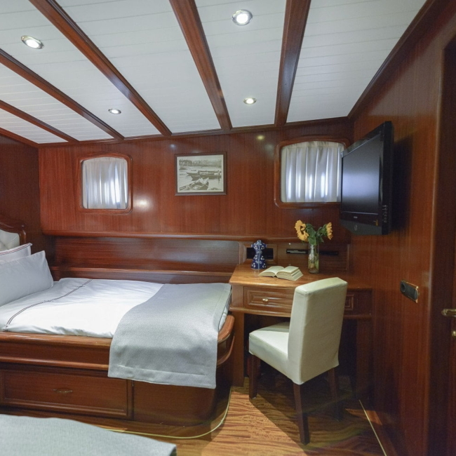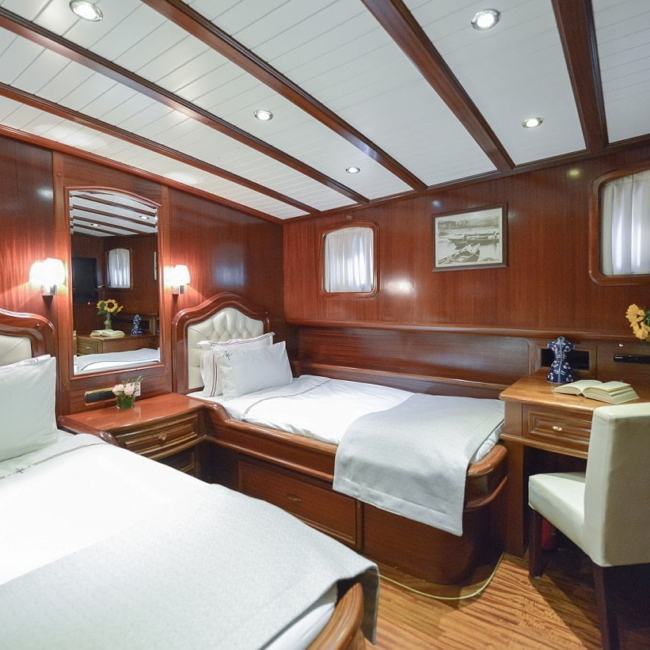 Türkiye bayrağıyla mavi tur hizmeti veren teknemizde 6 mürettebat bulunmaktadır. Toplamda 5 kabin; 1 master, 2 double ve 2 twin kabin