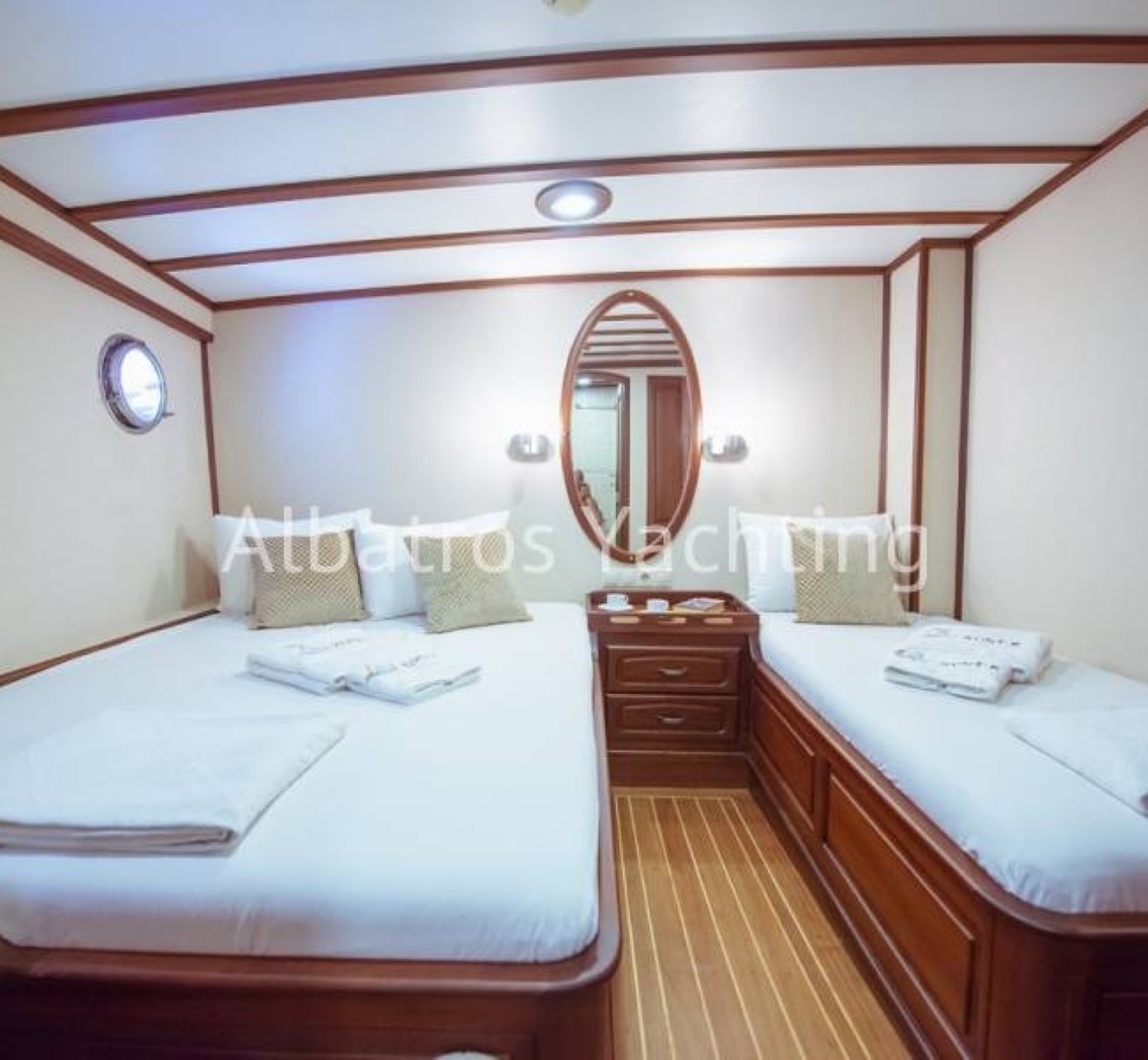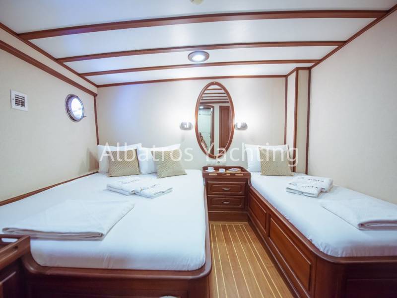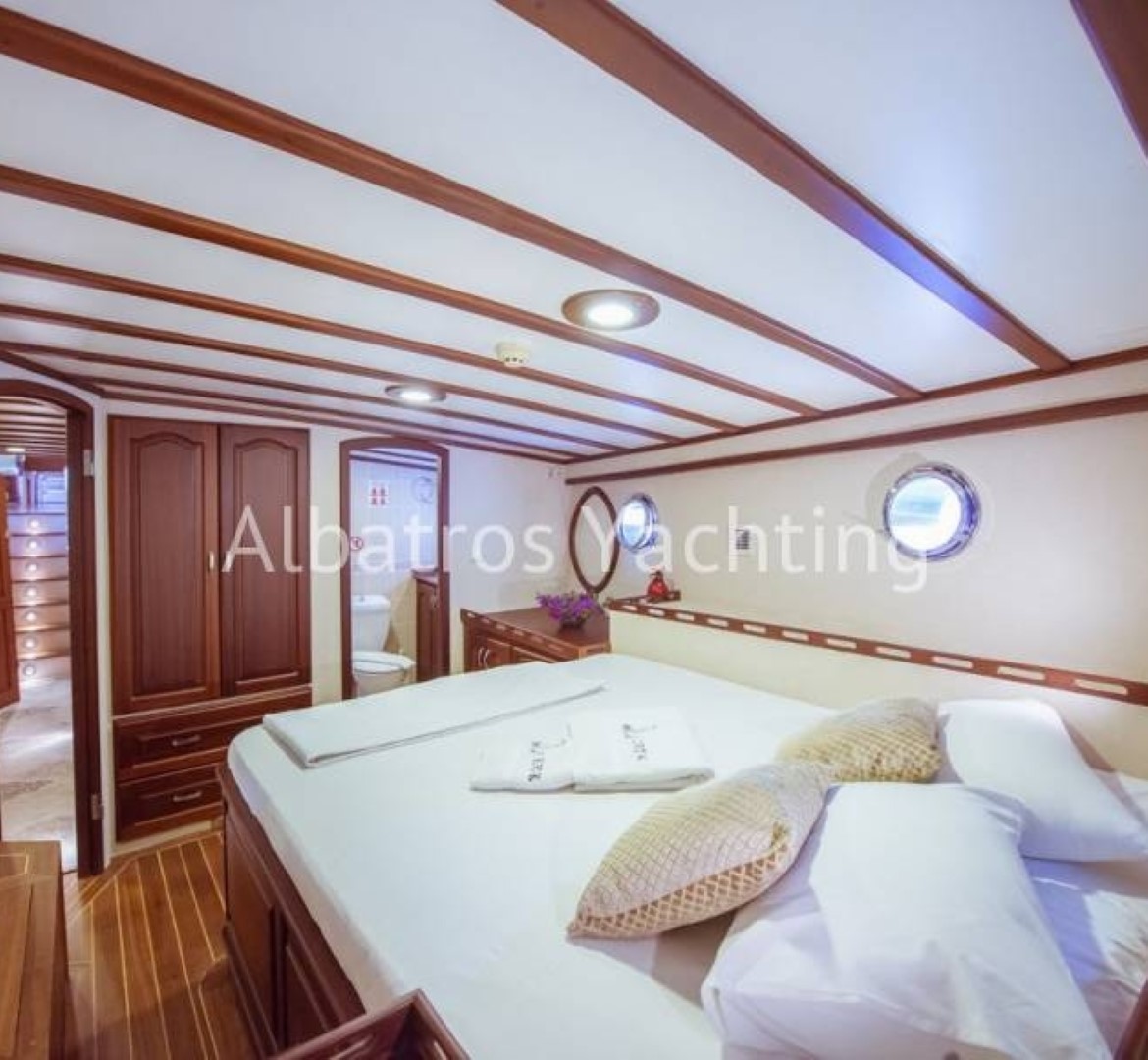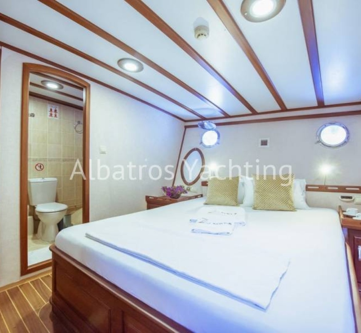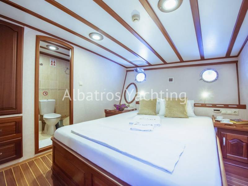 Gulet Larin Su, Türkiye’deki yat tatilleriniz için Fethiye veya Marmaris’den temin edilebilen geleneksel bir ahşap gulettir. 32 metre uzunluğunda olan guletimiz 5 çift kişilik ve 3 ayrı yataklı olmak üzere toplam 8 kabinde 16 misafir ağırlayabildiğinden, daha büyük aile ve arkadaş grupları için idealdir. Her kabinde klima, duş ve ev tarzı tuvalet içeren özel banyo bulunmaktadır. Şık salon, öğle güneşinin sıcaklığından mükemmel bir sığınaktır. Bir kitapla rahatlayın, barda serinletici bir içeceğin tadını çıkarın, TV izleyin veya müzik dinleyin.