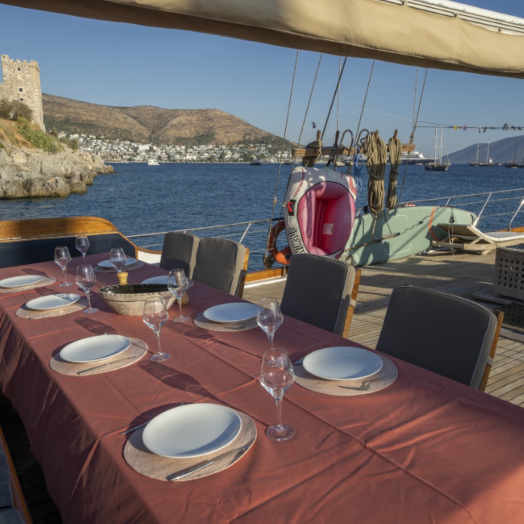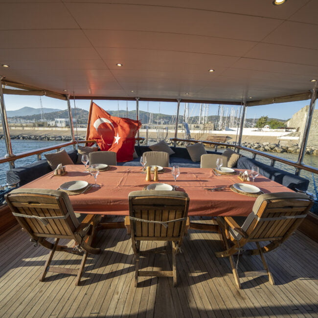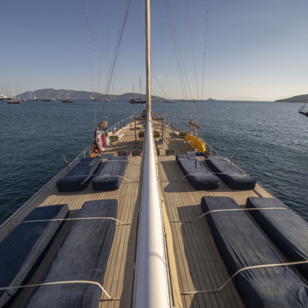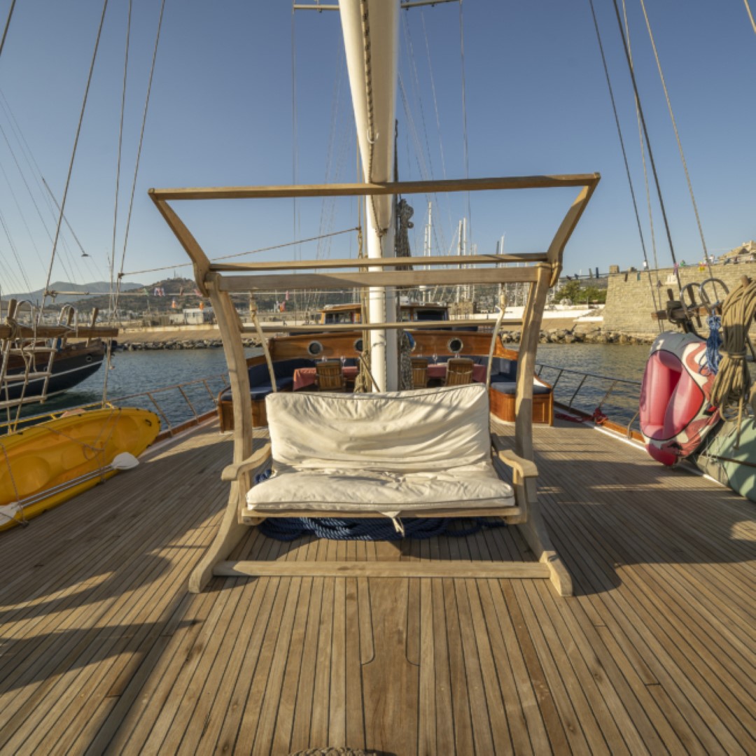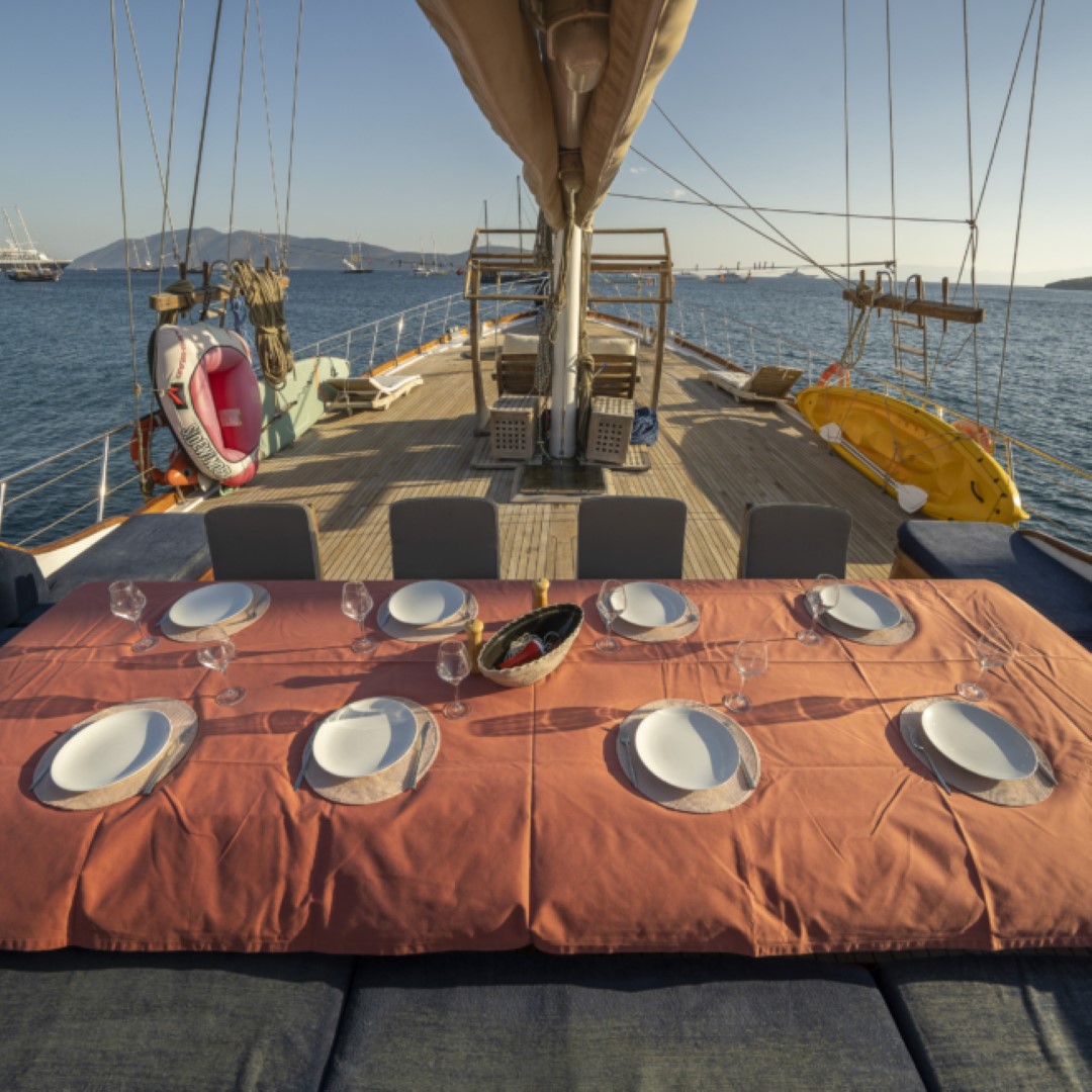 Zevkle dizayn edilmiş lüks guletimizin kabinleri, iç- dış güvertesi ferahlığı ve genişliğiyle kullanım açısından ön plandadır. Güvertede geniş güneşlenme alanı ve güneşlenme minderleri yeterli miktarda mevcuttur. Tam donanımlı mutfağımızda hazırlanan yemekleri salonda veya güvertede bulunan sofralarımızda tadabilirsiniz. Mavi yolculuğunuzun güzel geçmesini temenni eder ve sunarız. İyi tatiller..
