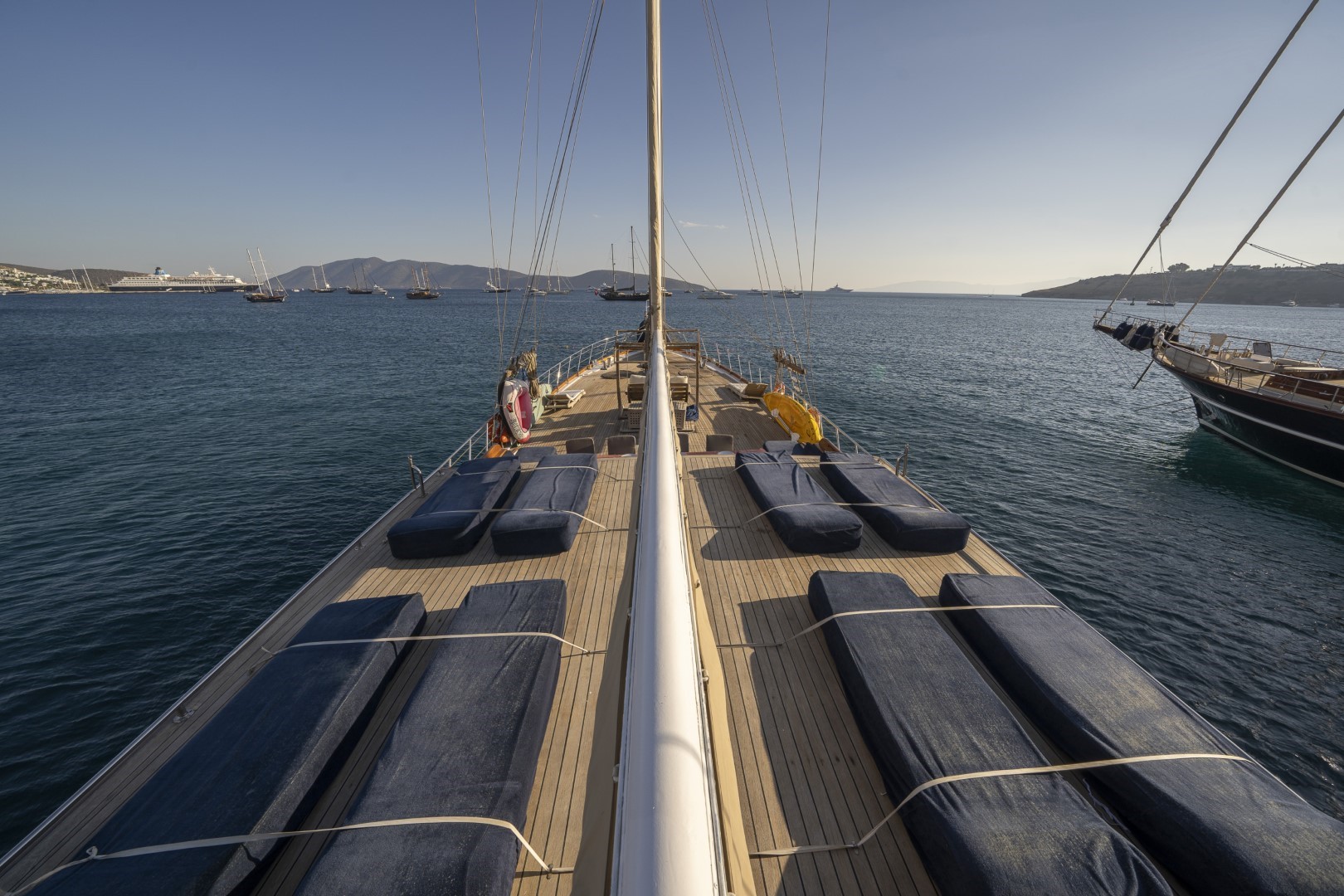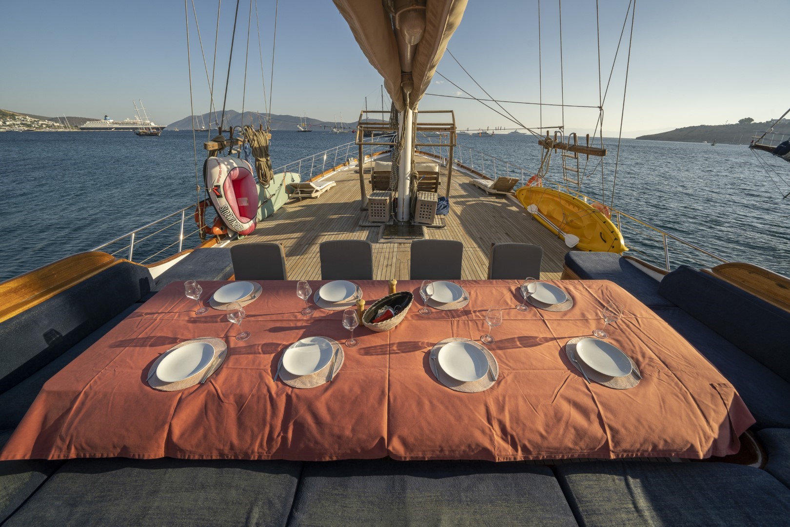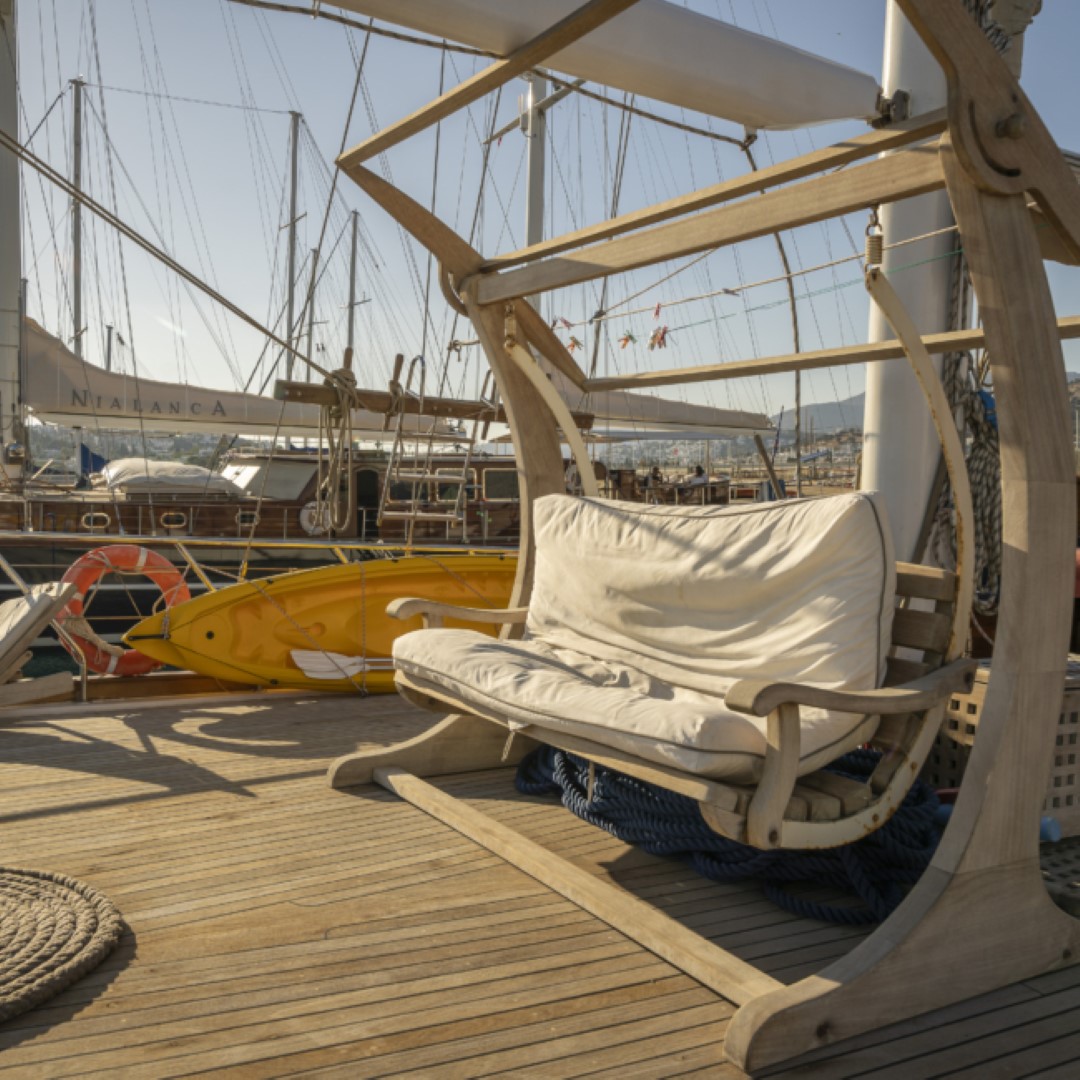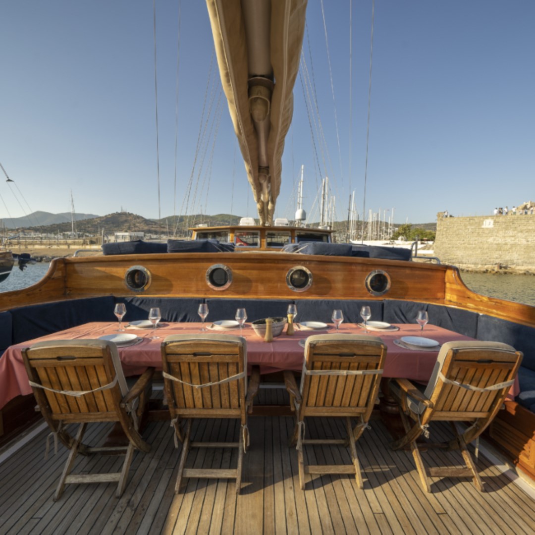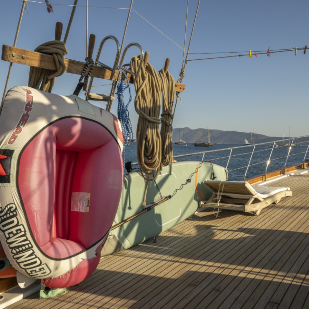 Zevkle dizayn edilmiş lüks guletimizin kabinleri, iç- dış güvertesi ferahlığı ve genişliğiyle kullanım açısından ön plandadır. Güvertede geniş güneşlenme alanı ve güneşlenme minderleri yeterli miktarda mevcuttur. Tam donanımlı mutfağımızda hazırlanan yemekleri salonda veya güvertede bulunan sofralarımızda tadabilirsiniz. Mavi yolculuğunuzun güzel geçmesini temenni eder ve sunarız. İyi tatiller..