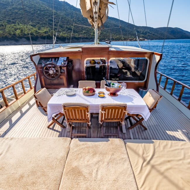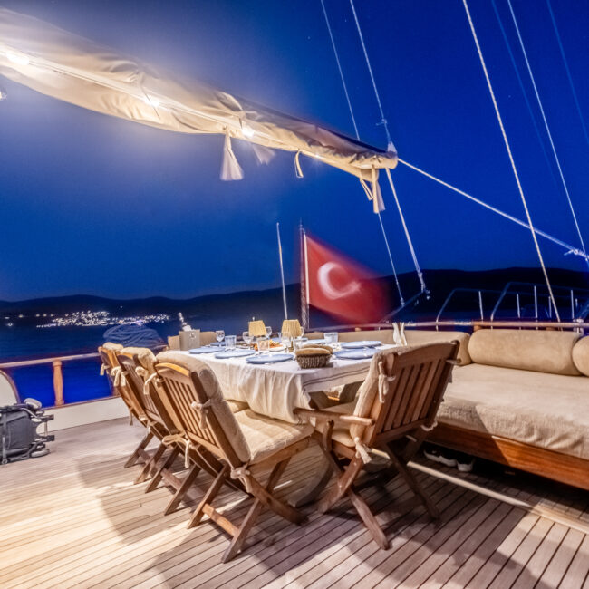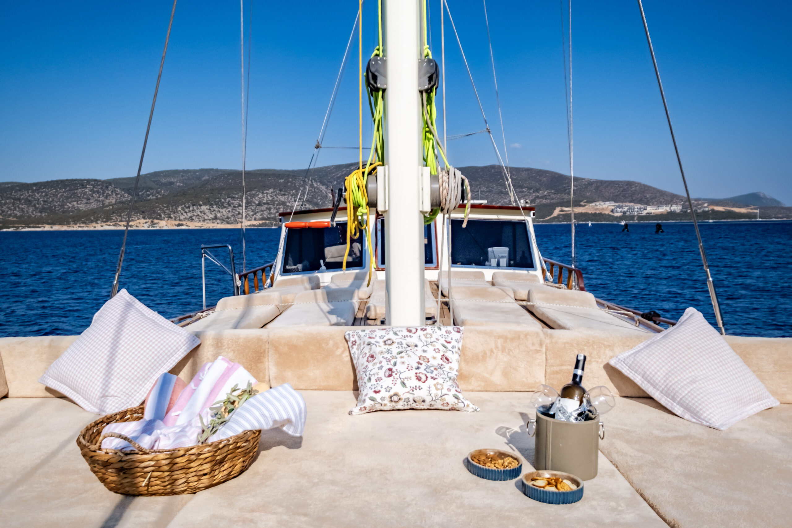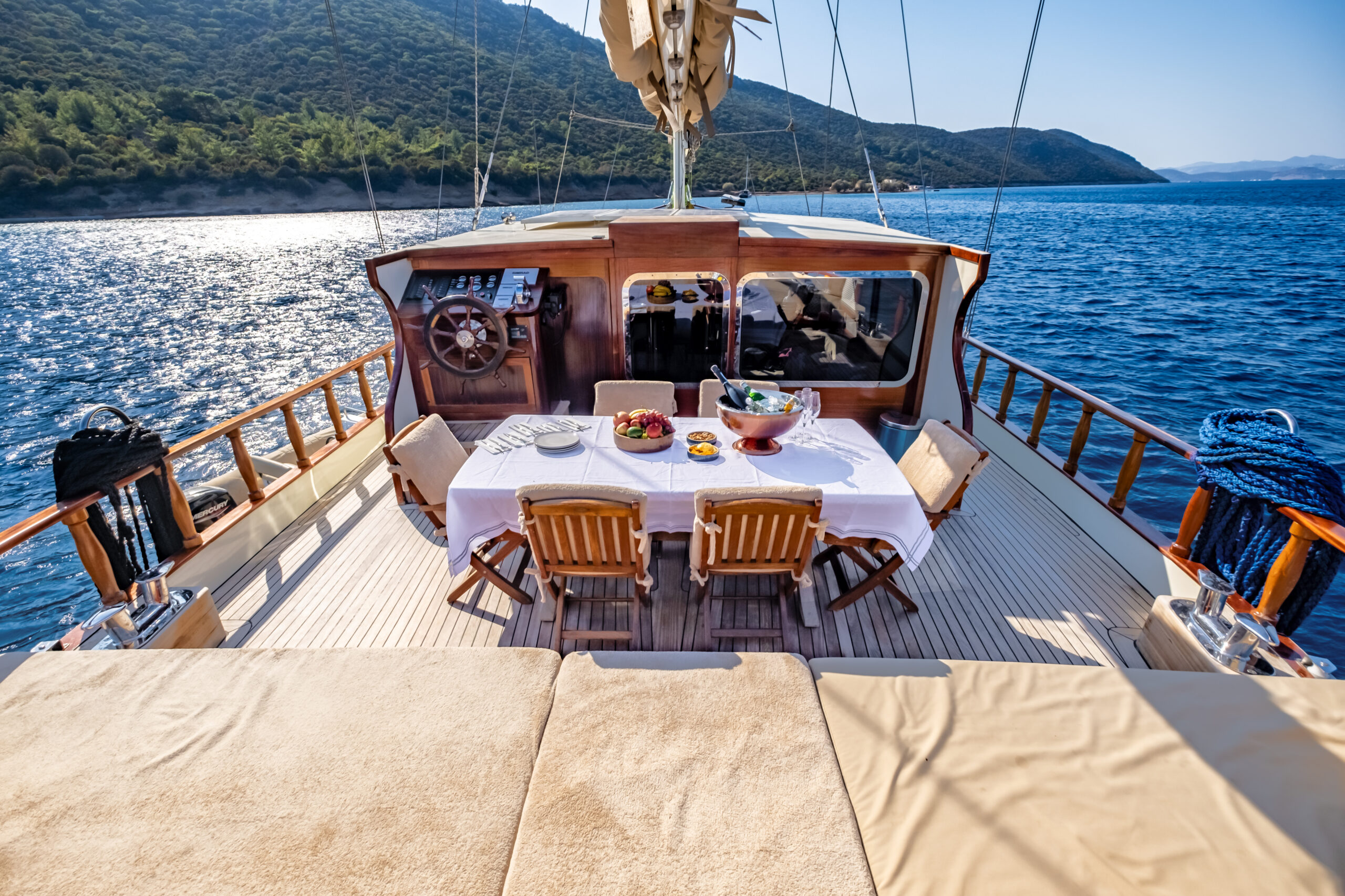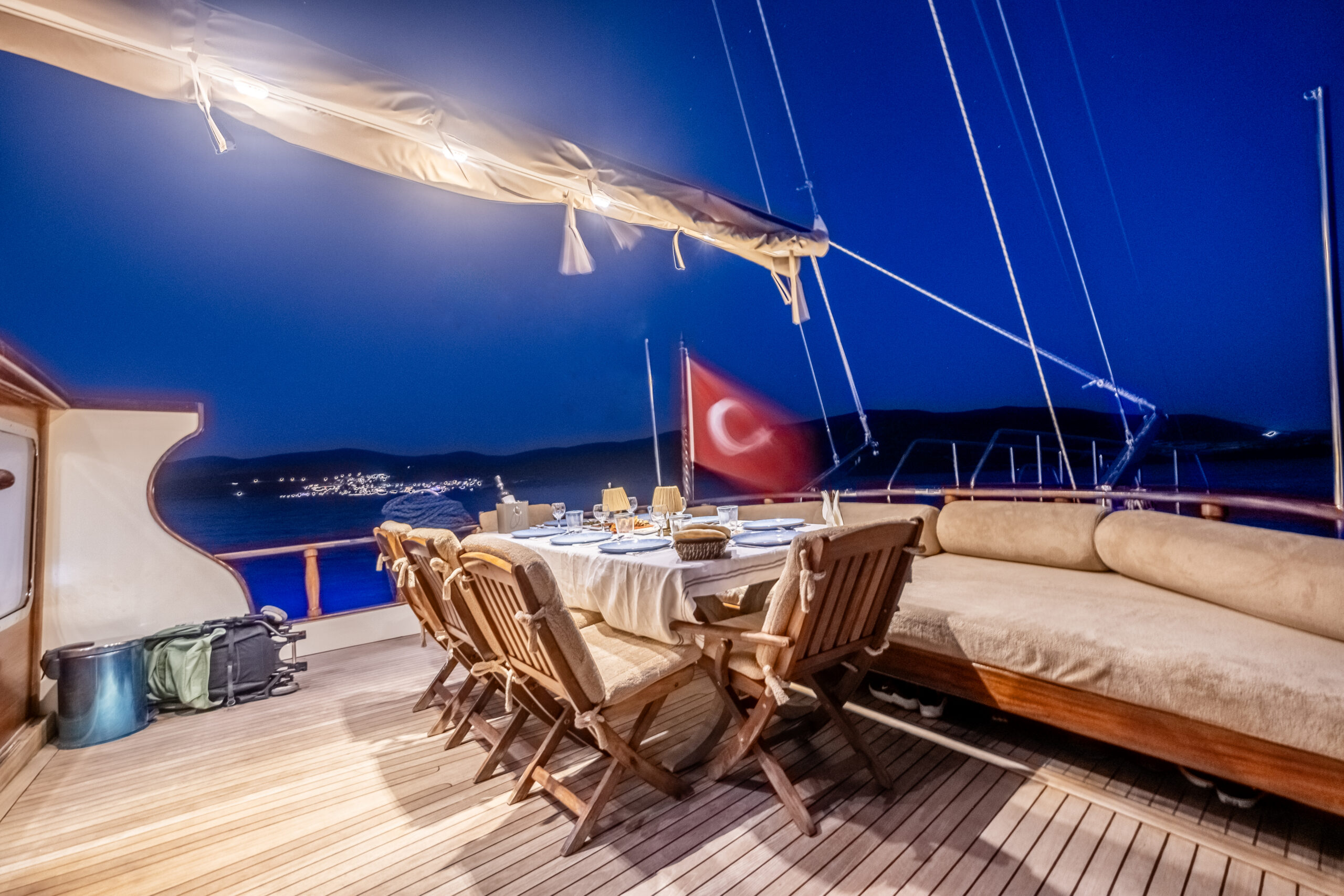 Teknemizin güverte alanları geniş olup, arka güvertede oturma alanı ve yemek masası ,salonda TV, Müzik sistemi ve ayrıca oturma gurubu bulunmaktadır.