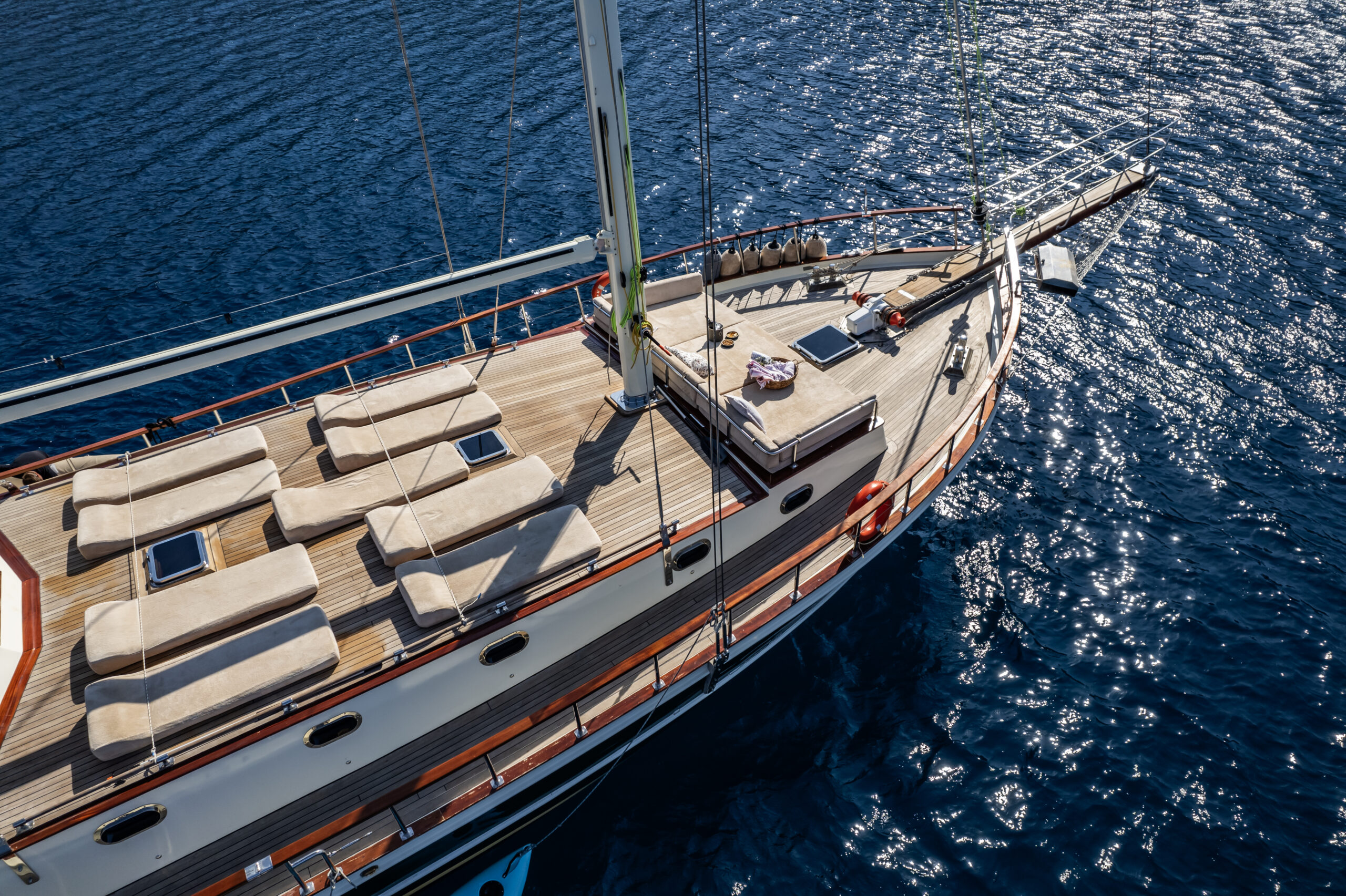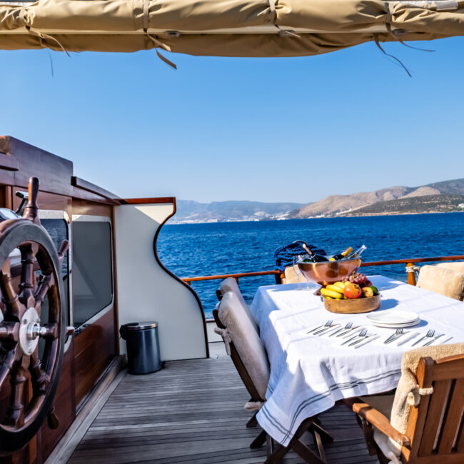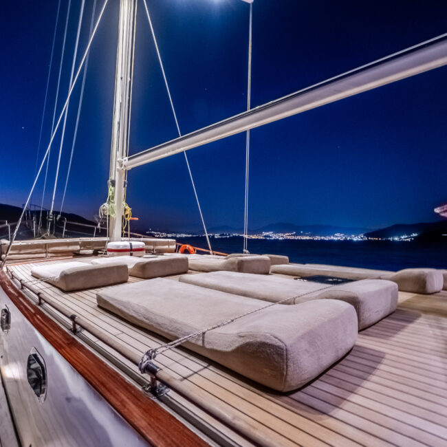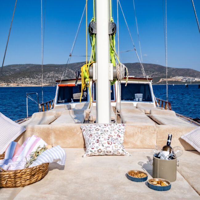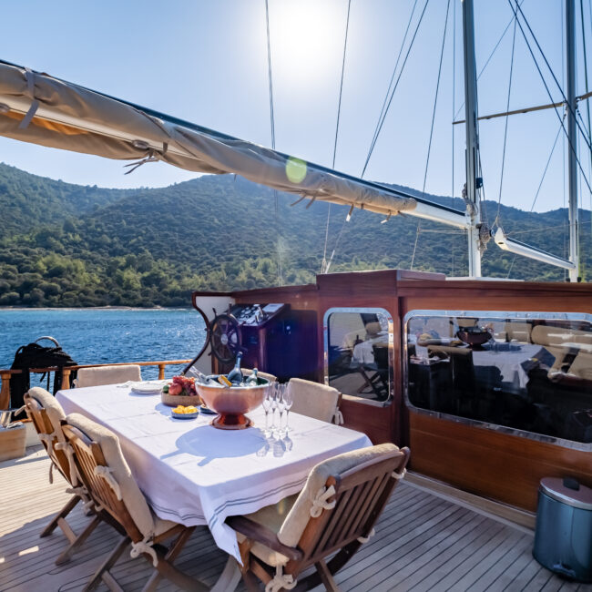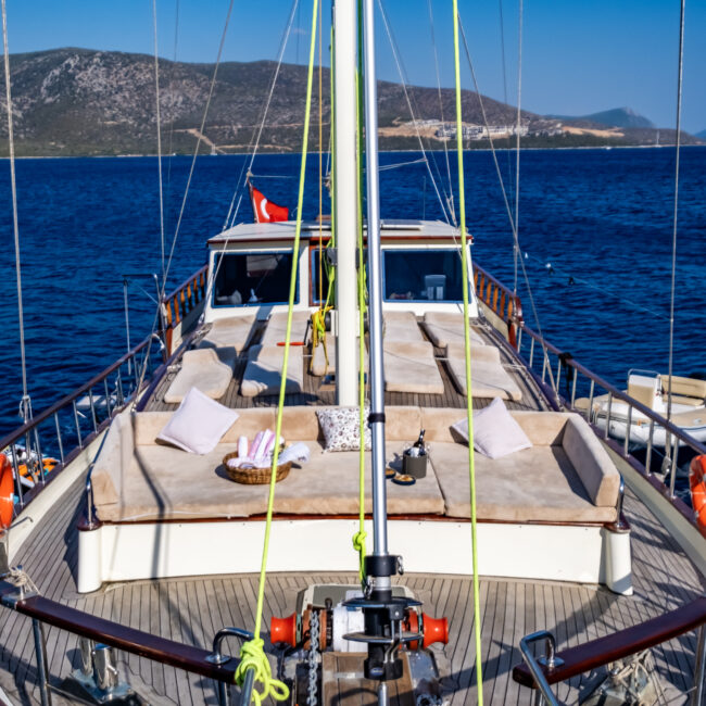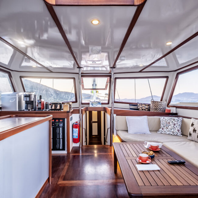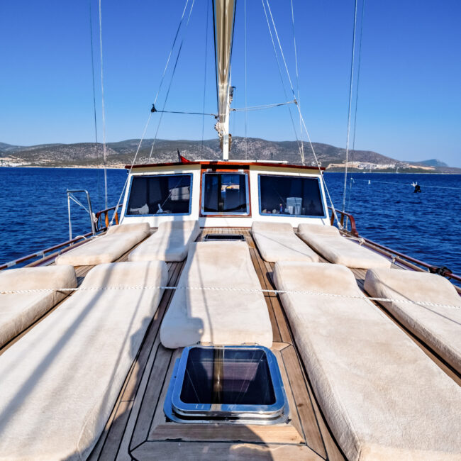 Teknemizin güverte alanları geniş olup, arka güvertede oturma alanı ve yemek masası ,salonda TV, Müzik sistemi ve ayrıca oturma gurubu bulunmaktadır.